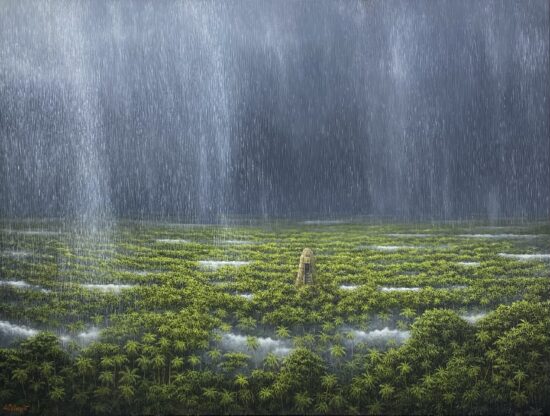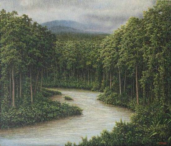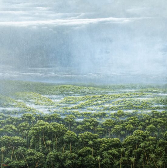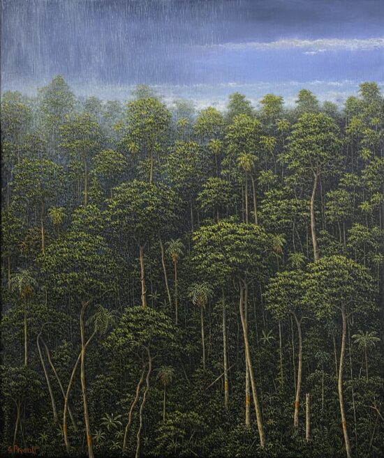 Gérard Priault chose to devote himself to painting, but maintained his taste for adventure by travelling extensively to South-East Asia, India, Africa, South America and more. It was the jungles and tropical rainforests in particular that attracted him and inspired his art. During his travels, the artist immerses himself in an almost contemplative way in unspoilt nature, allowing himself to be completely saturated in its elements: silence interrupted by the sounds of animals, marvellous skies lit up by the stars and the moon, mysterious mists, intense rain, luxuriant vegetation…
