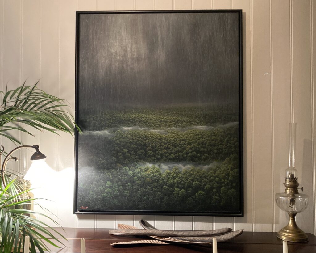 The idea at the beginning of each new painting is more or less precise. He often starts with a tree, then another, and so on until, little by little, all the vegetation appears, a cloudy sky, rain, a waterfall… As the work progresses, it is the painting itself that guides the artist, suggesting the various elements of the composition. For Gérard Priault, creating a work of art “is like embarking on a journey without having set a precise, detailed itinerary: you change direction, sometimes you change your purpose and inspiration”. In the end, the contemporary painter has created his symphony, using colours like a composer uses musical notes.