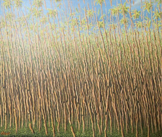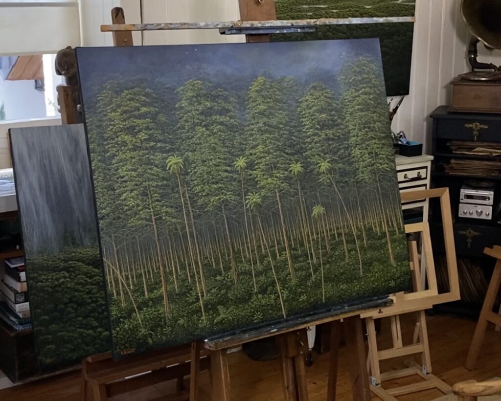 The artist draws his inspiration from nature but the rainforests he paints are not real and do not refer to any specific landscape. Gérard Priault does not paint on the spot or merely reproduce the landscapes he photographs on his travels. Instead, he relies on memories of his time in the jungle, soaking up its atmosphere, to create all the elements such as the trees, leaves and vines.