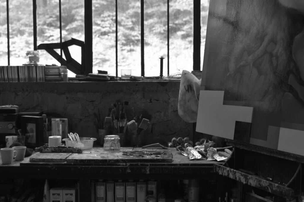 Joachim van der Vlugt trained at the academy of fine arts in Maastricht. After briefly dabbling with stylisme he turned his hand to painting and has never looked back. He is passionate about the great masters of Flemish painting. Consequently has no qualms about their influence on him. Armed with a paint palette purposely short on colour and somewhat sombre, black and white, brown, beige and blue, Joachim van der Vlugt superposes the layers of paint which enables him to bring the nuances and intensity of light to the fore, and also allowing images and vaporous shapes to slowly appear. He doesn’t stop there. He composes his paintings, all the while adding the layers, by accentuating certain parts but also by integrating geometric shapes or virtually transparent smears which bring together his compositions forming what he calls “an orchestrated chaos.”