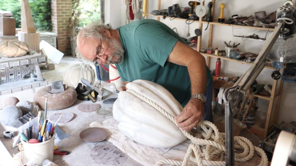 As a result of the use of rope which binds, restrains, and appears to ‘suffocate’ the stone, his contemporary abstract sculptures trigger emotional and intellectual reactions that are strong, complex and profound. Desires, fears, memories, nightmares, instincts and anxieties that were hidden and latent in the observer begin to surface, awakened by indirect references to cruelty, exploitation or pain. The interpretation of these works is not obvious, but the artist sees each piece as a precious thought that must be tied and held to protect it, and not let it slip away. In addition, the contrasting yet intimate connection between rope and stone challenges the relationship of strength and weakness between the two materials. All of these elements contribute to making the artist’s works extremely enigmatic, sometimes troubling and disturbing, at other times amusing and playful.