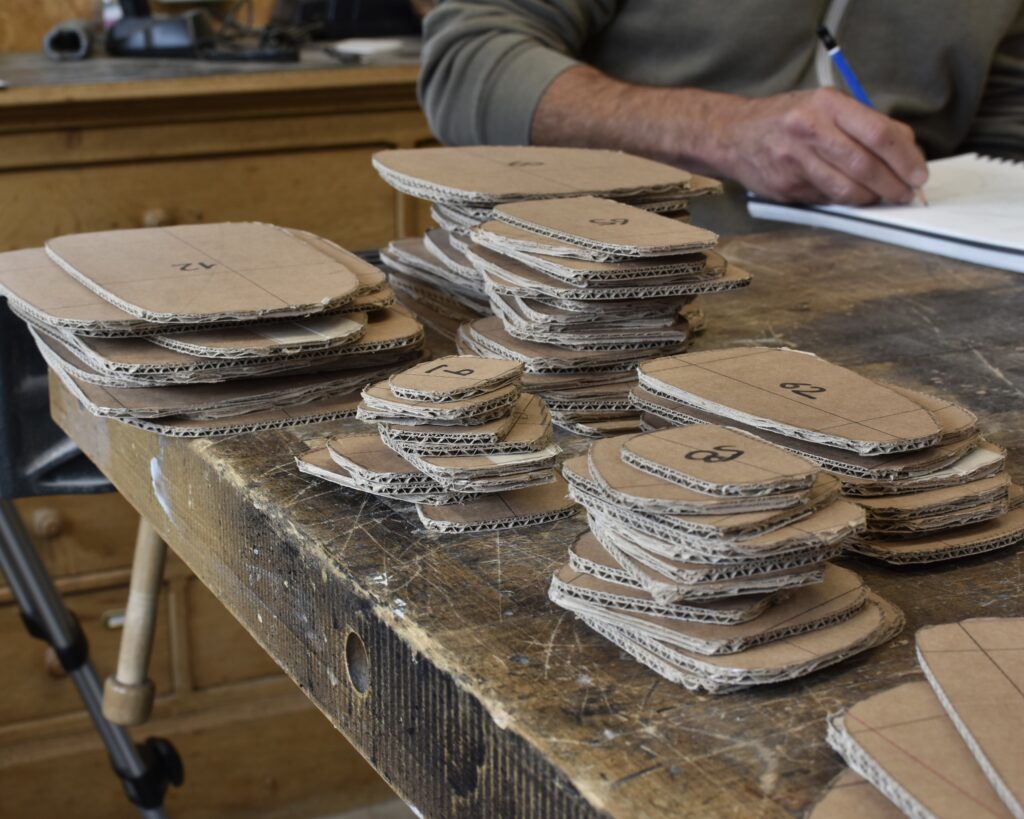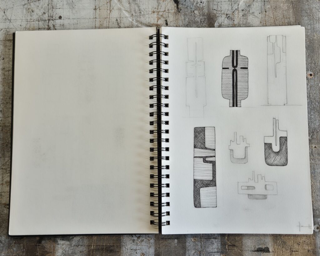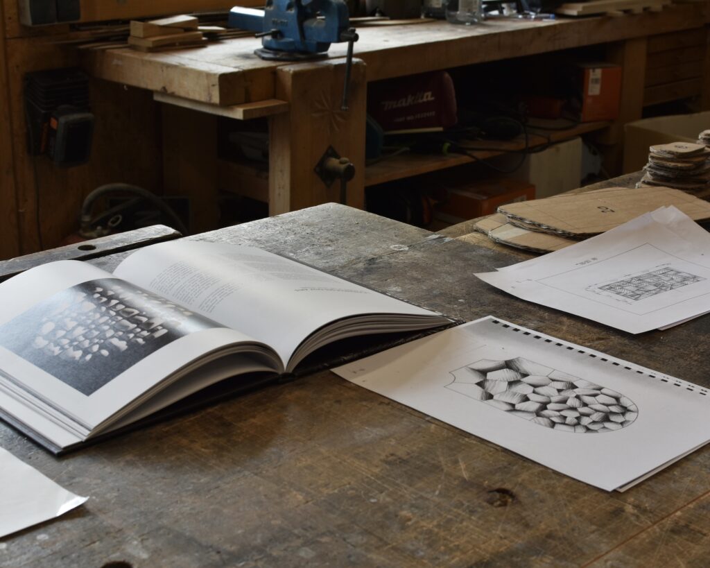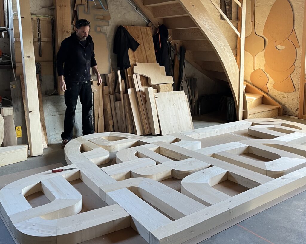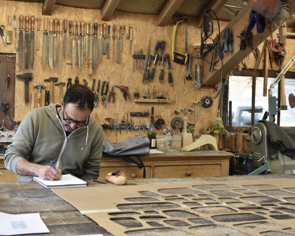 The contemporary sculptor has a deep respect for wood, which he sees as a noble, rare and ancient material that should not be wasted. That’s why his creative process always begins with drawings and sketches. This stage, which can last several days, allows him to eliminate less relevant ideas and retain only those that are worth developing. Once the ideal shape emerges on paper, the artist makes a cardboard template to actual scale, reminiscent of the patterns used in fashion. For his most complex sculptures, Thierry Martenon also creates a miniature model in order to study the shapes, curves and volumes in greater depth in three dimensions.