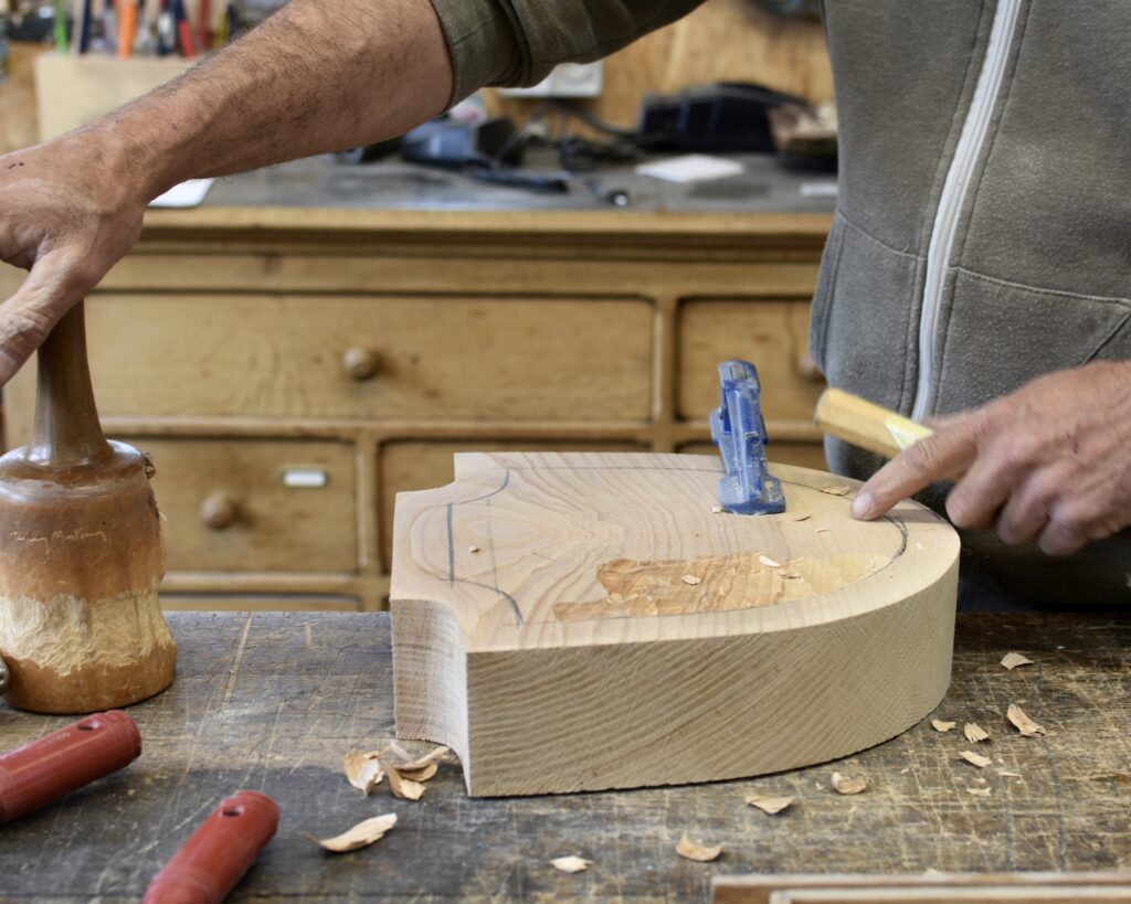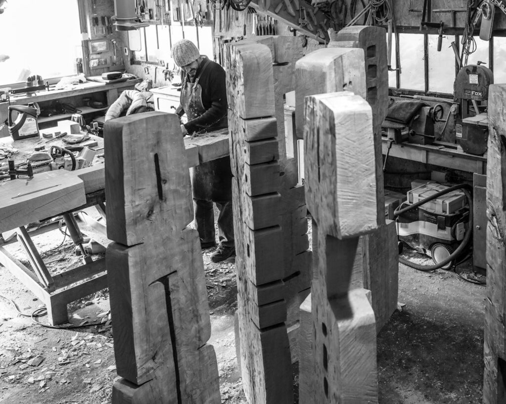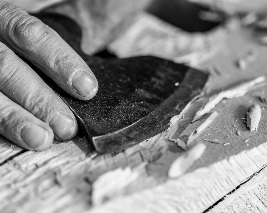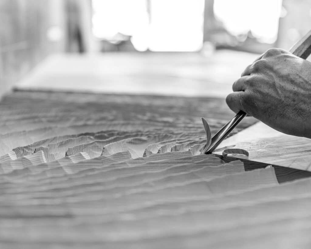 Next comes wood cutting. The sculptor uses traditional woodworking tools to first outline the general shape of the piece, then refine it: saw, chainsaw, planer, mallet, plane, gouges, jointer plane, riffler, marking gauge, rasp, sander… Although direct carving leaves little room for error, his expertise enables him to approach this phase with confidence and efficiency, choosing the most appropriate tools to achieve the desired result. Unlike the carpenter, Thierry Martenon works against the grain to create grain. Tools, materials and gestures play a central role in his work.