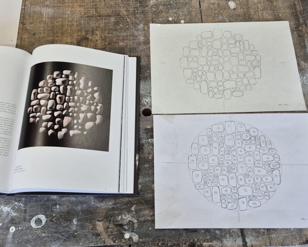 The artist’s first and foremost source of inspiration is the natural world that surrounds him on a daily basis: the textures and shapes of mushrooms, rocks, bark, low-angled light, and sometimes even a simple shoe print in the snow can give him the idea for his next sculpture.