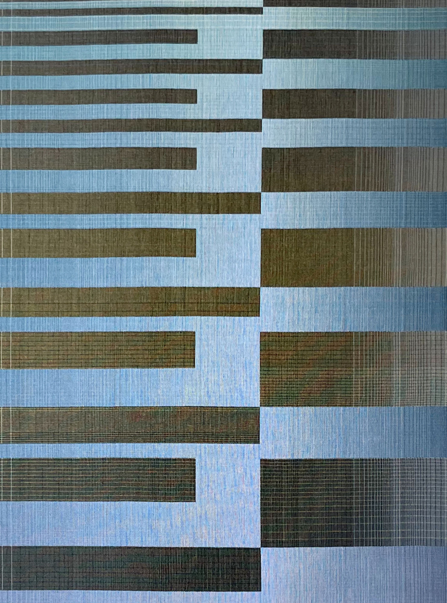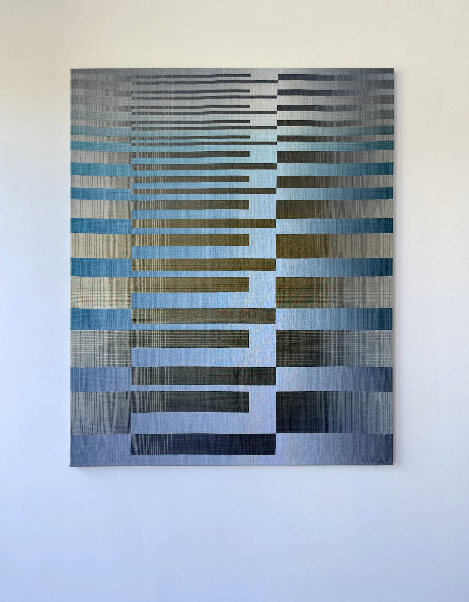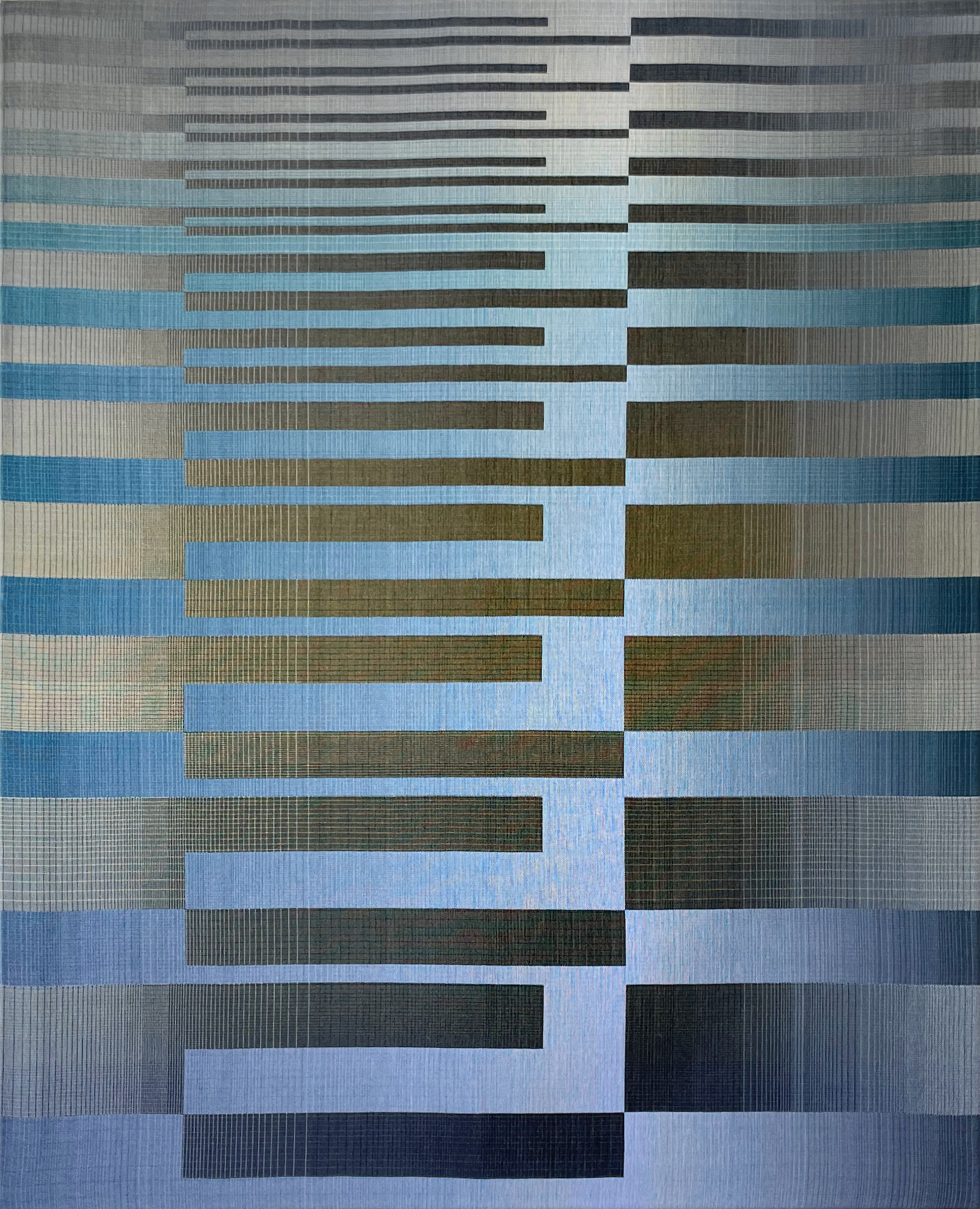 In this series, the artist uses rectangular and horizontal geometric patterns to explore combinations and transitions between different colours. The challenge for her is to explore these gradations not with paint, which can be mixed, but with individual threads that must interact with the nuances of the adjacent threads.