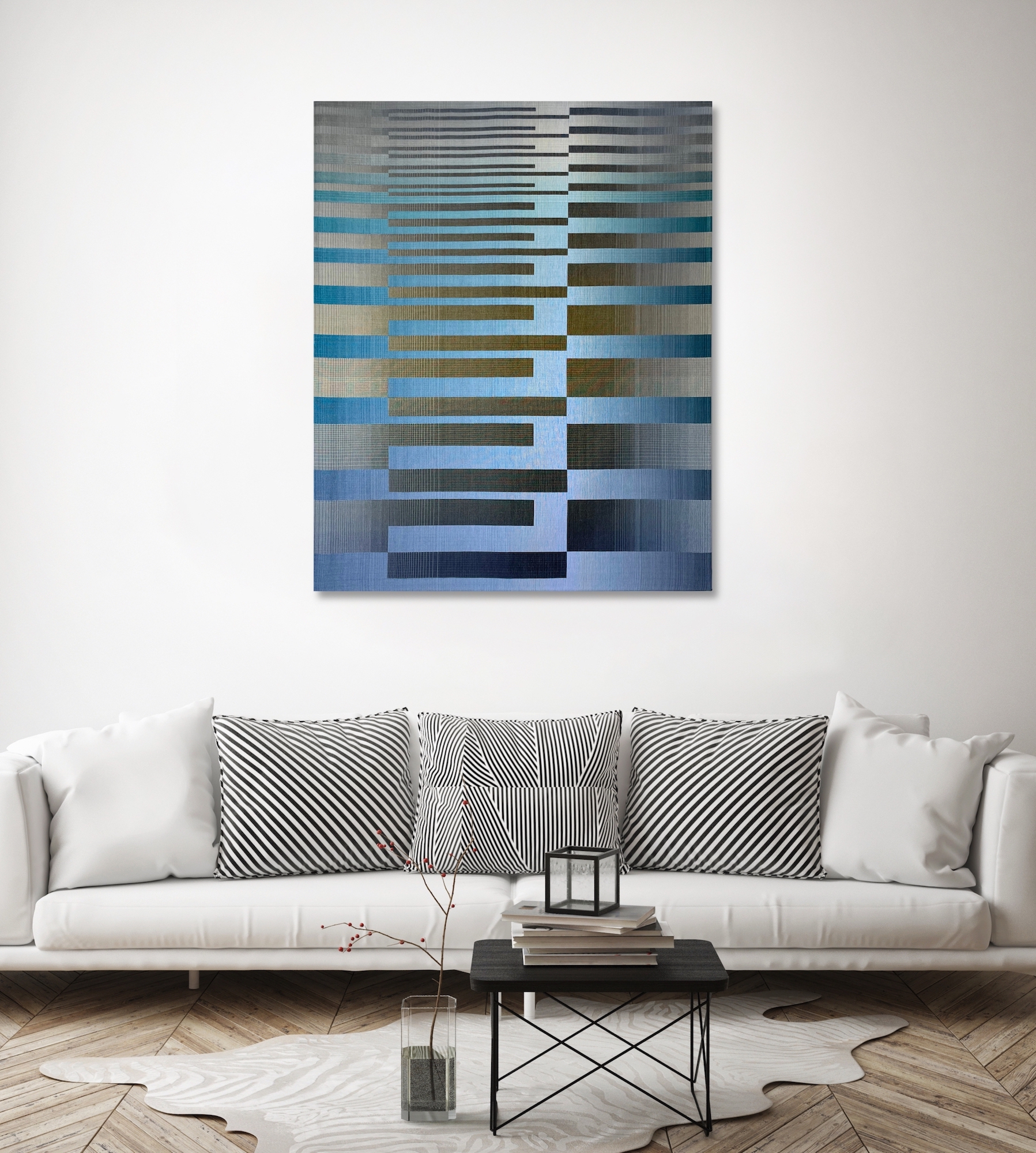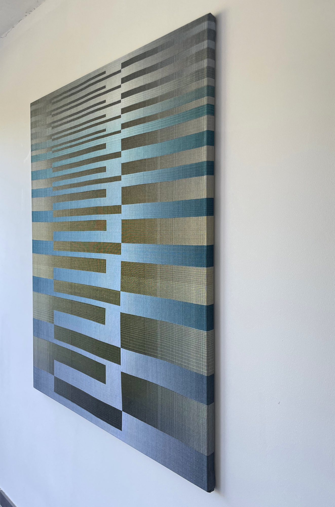 Christiane Maurer’s creative process skilfully blends traditional skills and expertise with modern digital methods. The creative part takes place on the computer: using a graphic design program, the artist works on colour studies to turn her initial idea into a digital design. Using another program, this is then transposed into a weaving draft, where the colours of each warp and weft thread are determined. Once the loom is set up, with all the coloured thread spools in their exact sequence, the artist begins to work using the ancient technique of double weaving. The woven work is stretched on a wooden frame, like a canvas. This process requires a great deal of precision and concentration, as well as a fairly lengthy working process that can last several months, from the artistic conception of the work to its production.