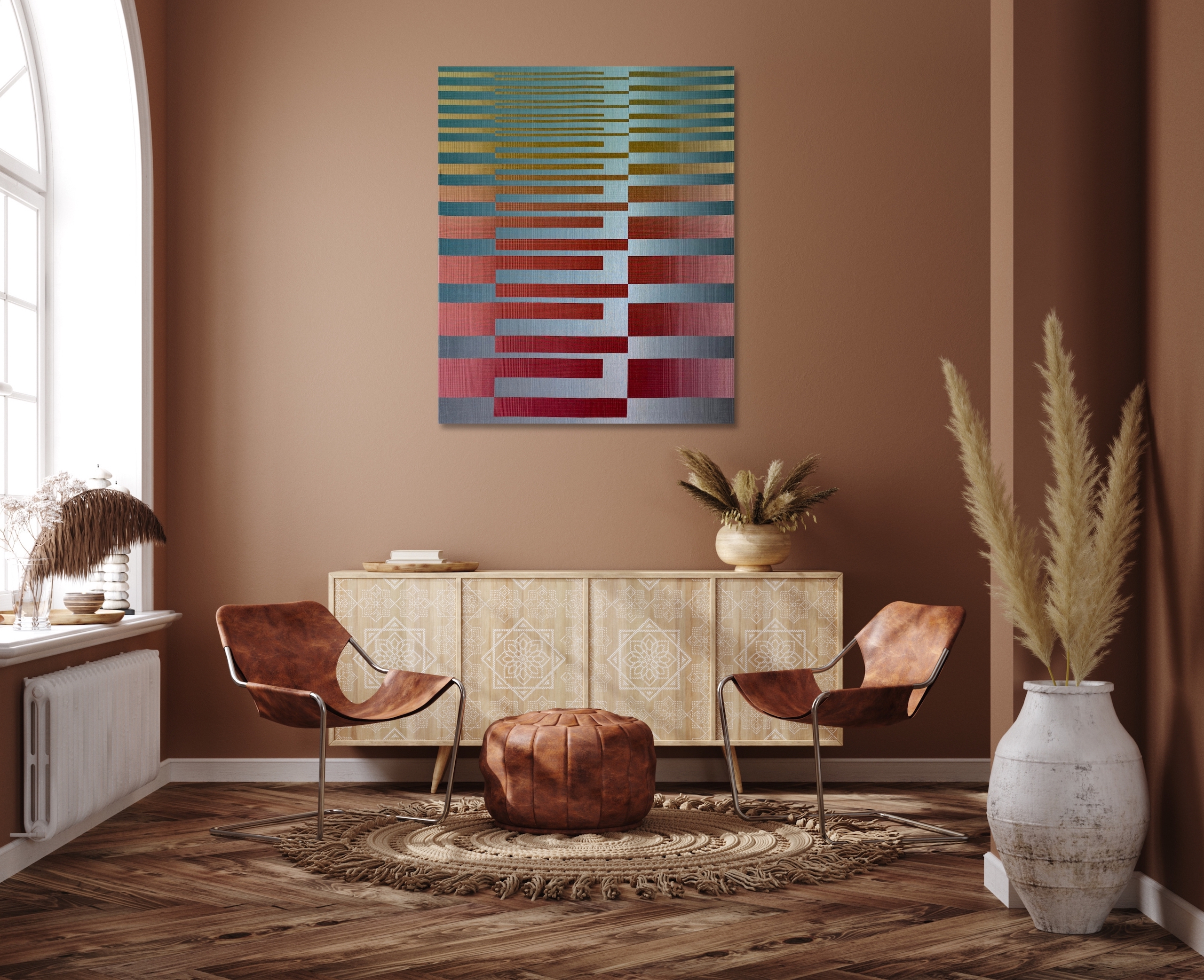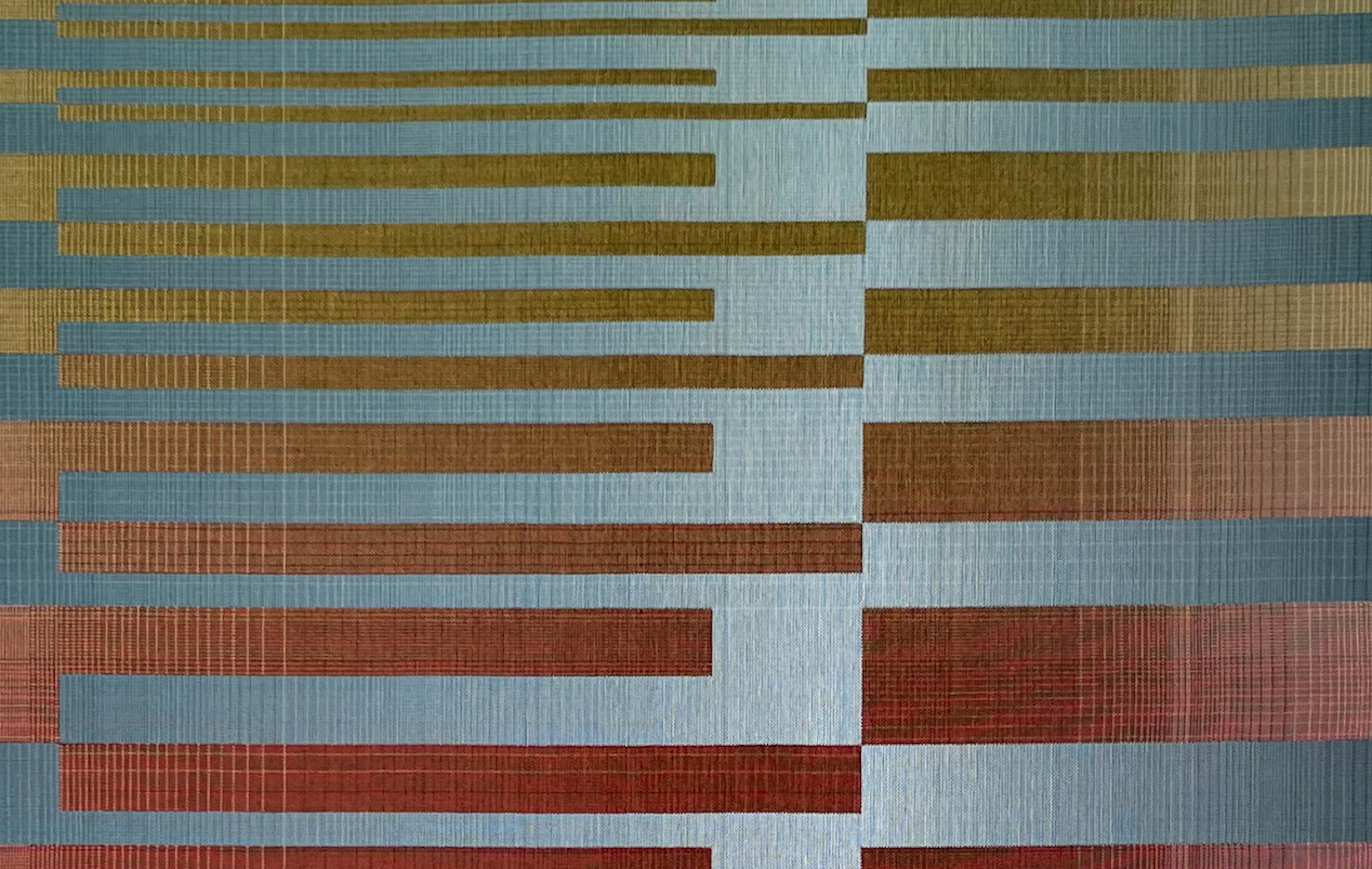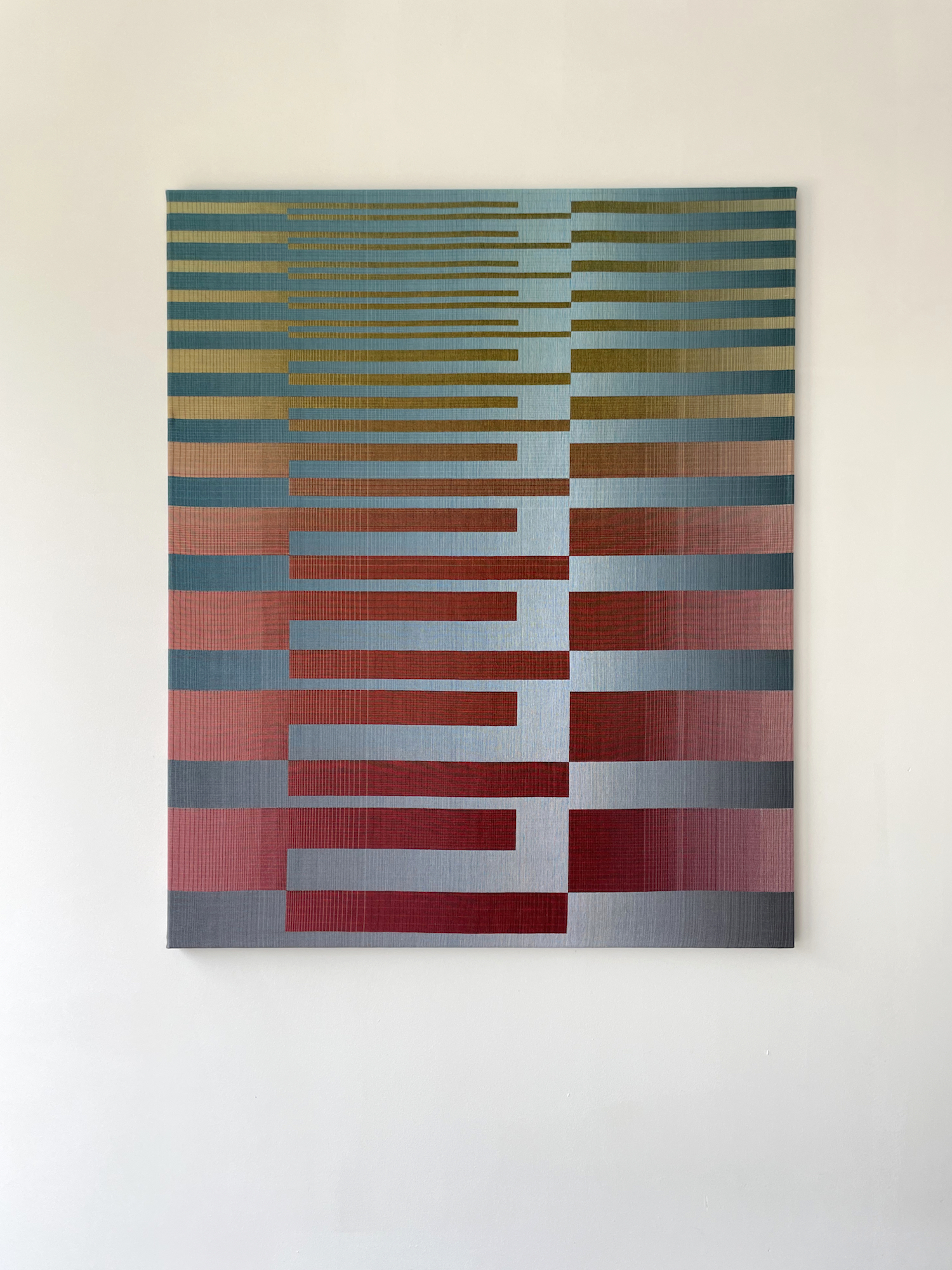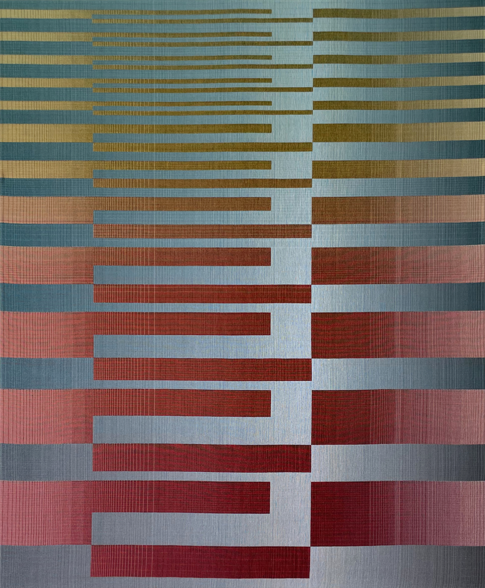 In this series, the artist uses rectangular and horizontal geometric patterns to explore combinations and transitions between different colours. The challenge for her is to explore these gradations not with paint, which can be mixed, but with individual threads that must interact with the nuances of the adjacent threads.