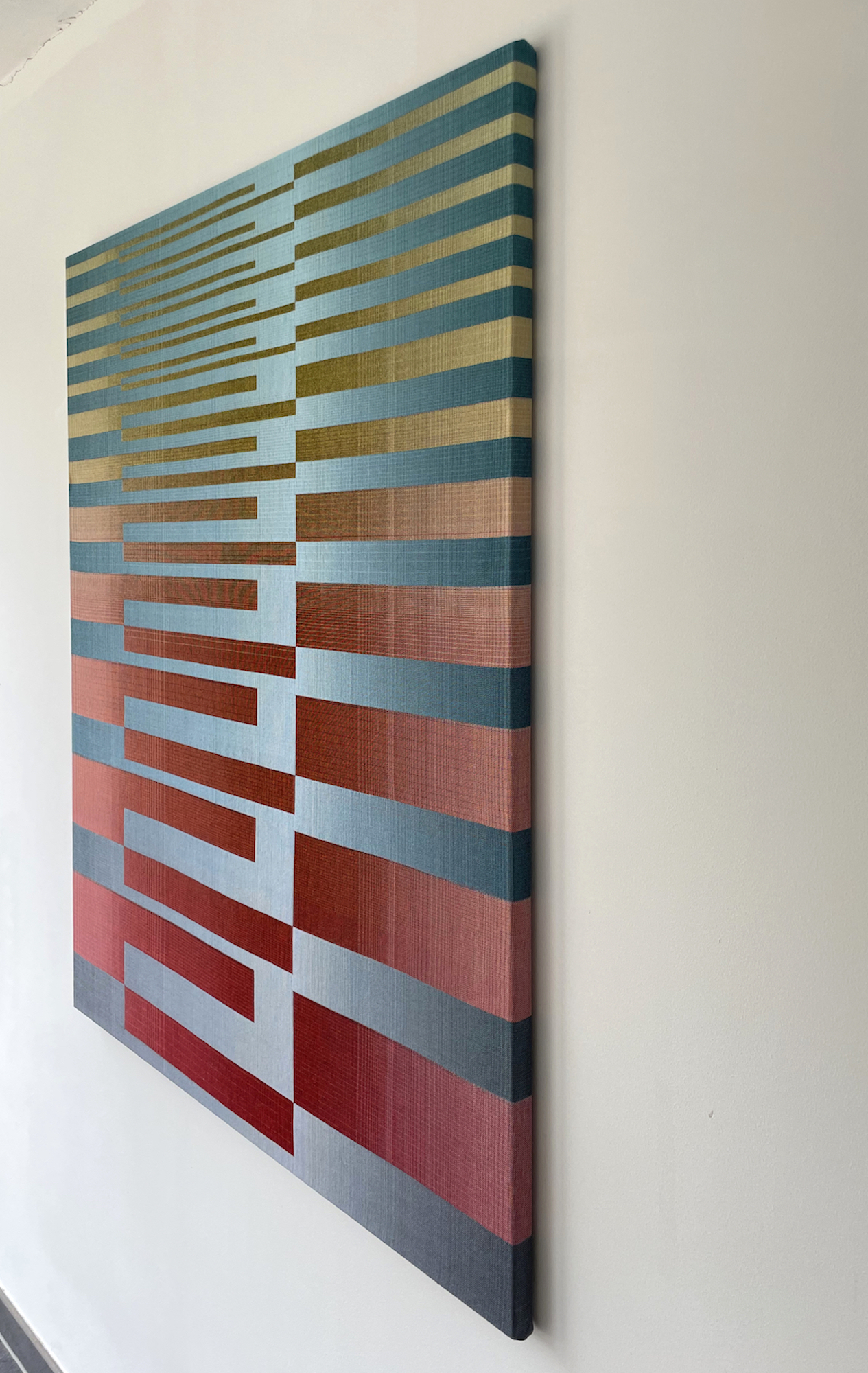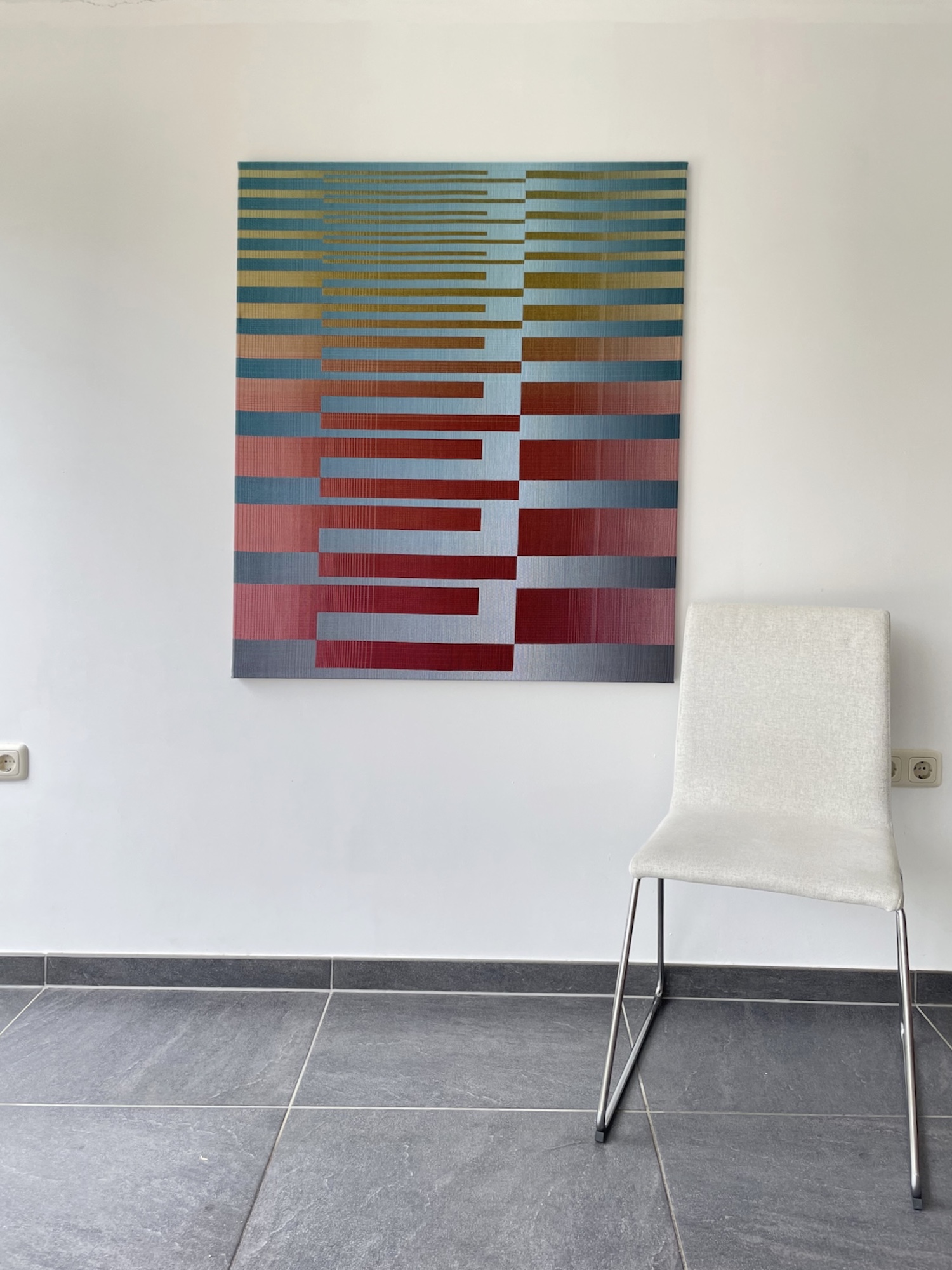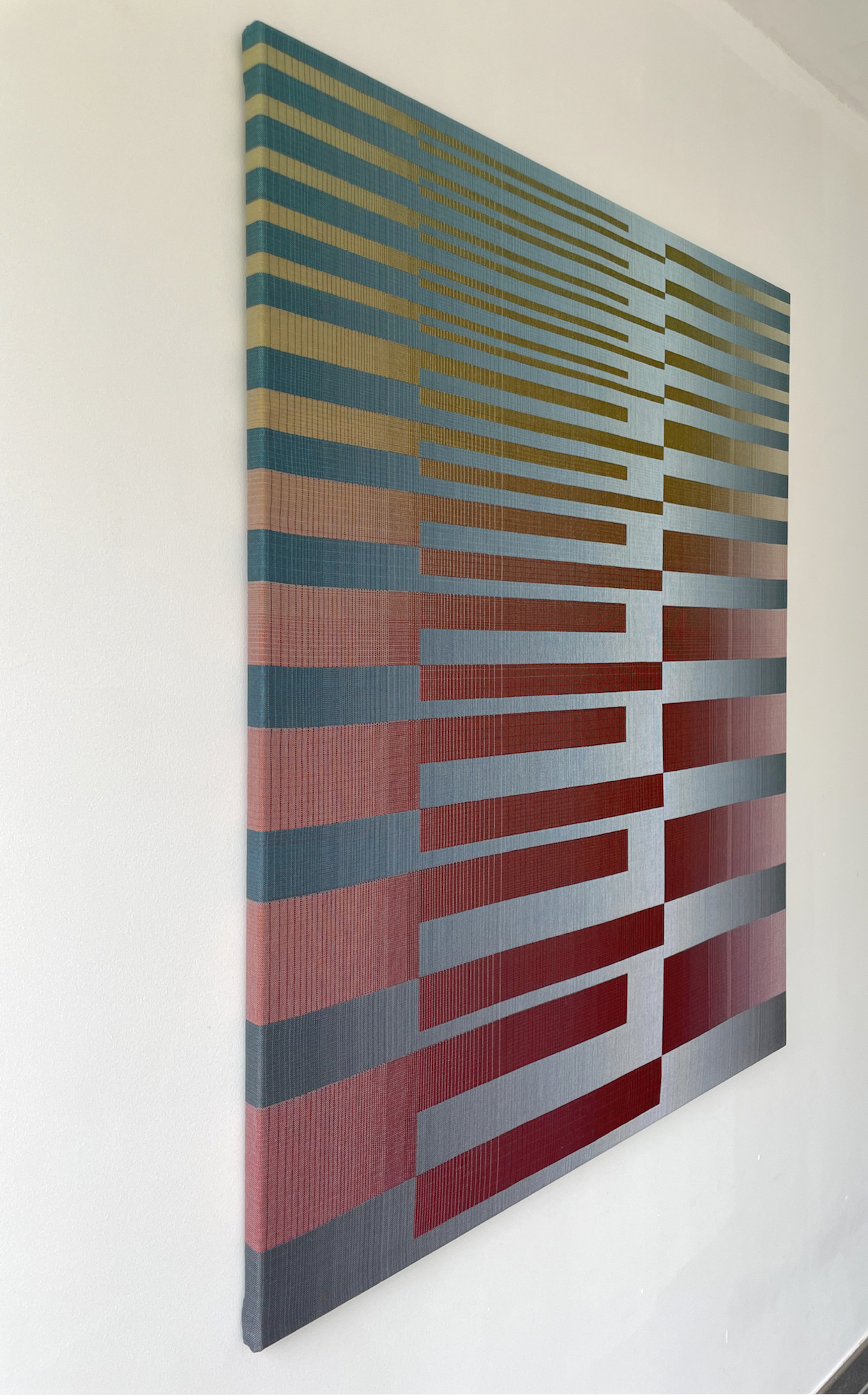 Christiane Maurer’s creative process skilfully blends traditional skills and expertise with modern digital methods. The creative part takes place on the computer: using a graphic design program, the artist works on colour studies to turn her initial idea into a digital design. Using another program, this is then transposed into a weaving draft, where the colours of each warp and weft thread are determined. Once the loom is set up, with all the coloured thread spools in their exact sequence, the artist begins to work using the ancient technique of double weaving. The woven work is stretched on a wooden frame, like a canvas. This process requires a great deal of precision and concentration, as well as a fairly lengthy working process that can last several months, from the artistic conception of the work to its production.