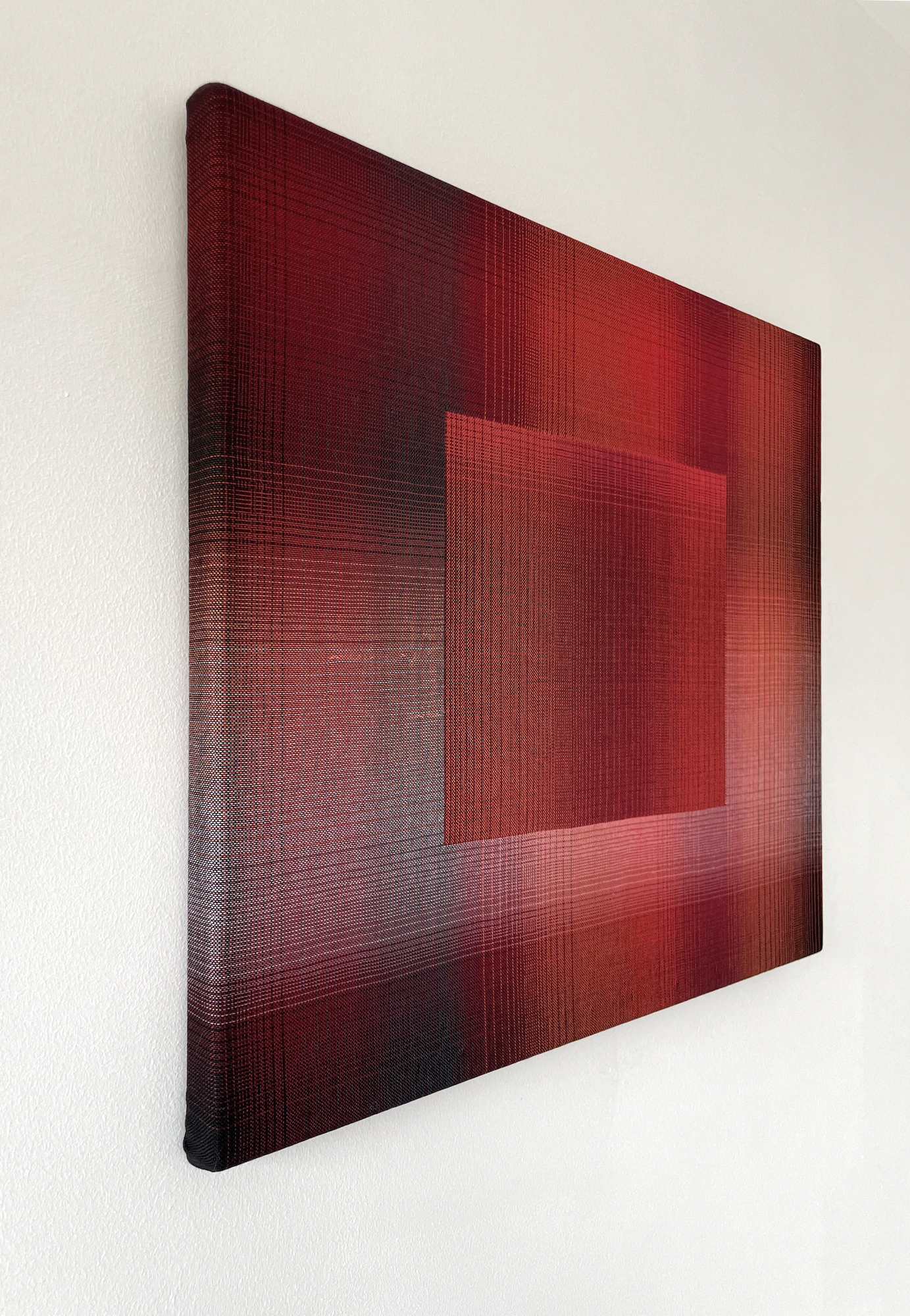 Christiane Maurer’s creative process skilfully blends traditional skills and expertise with modern digital methods. The creative part takes place on the computer: using a graphic design program, the artist works on colour studies to turn her initial idea into a digital design. Using another program, this is then transposed into a weaving draft, where the colours of each warp and weft thread are determined. Once the loom is set up, with all the coloured thread spools in their exact sequence, the artist begins to work using the ancient technique of double weaving. The woven work is stretched on a wooden frame, like a canvas. This process requires a great deal of precision and concentration, as well as a fairly lengthy working process that can last several months, from the artistic conception of the work to its production.