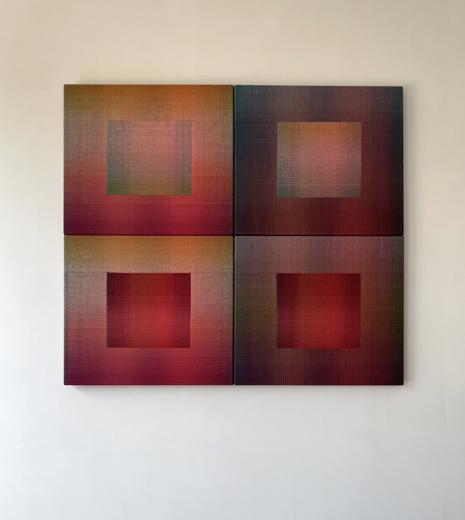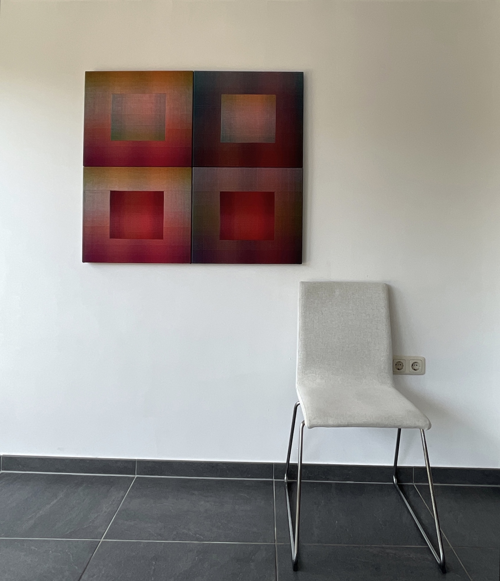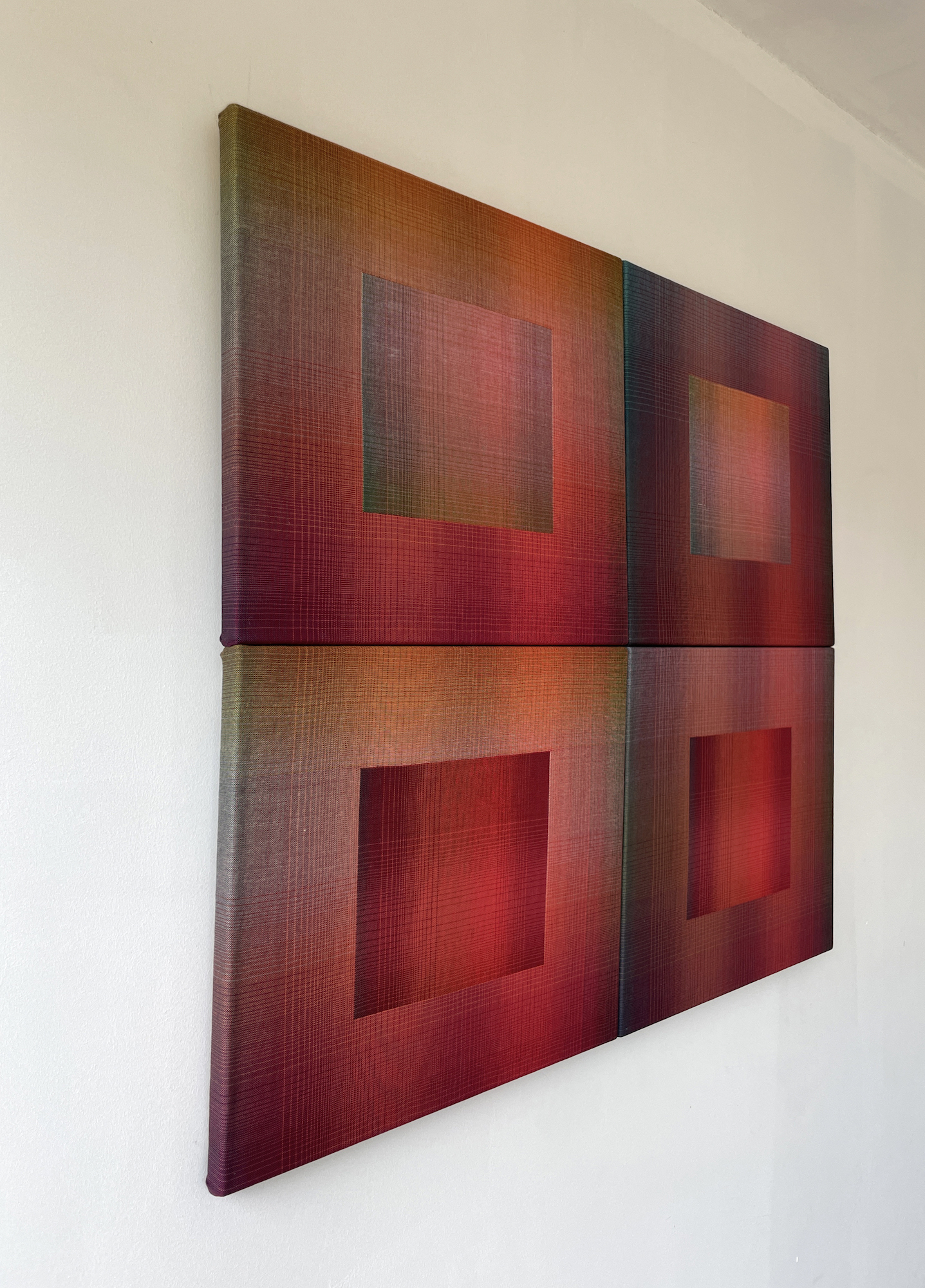 2023 I – 16 (combination of 2023 I – 4, 5, 7, 8) is a set of four works of textile art by the artist Christiane Maurer, from the series 2023 I.