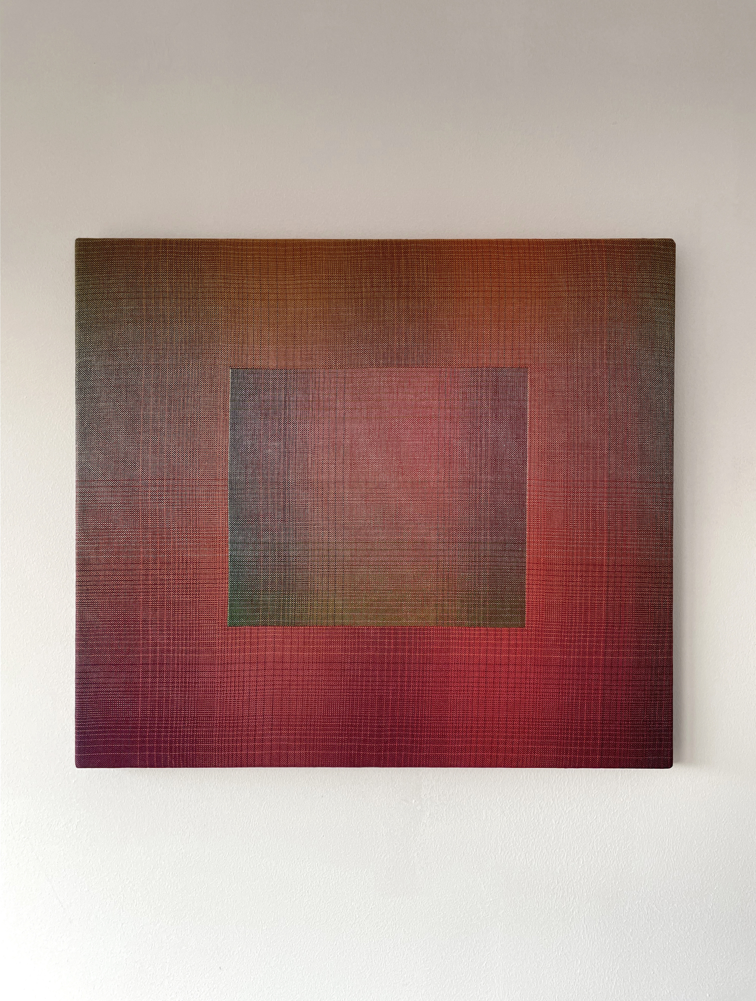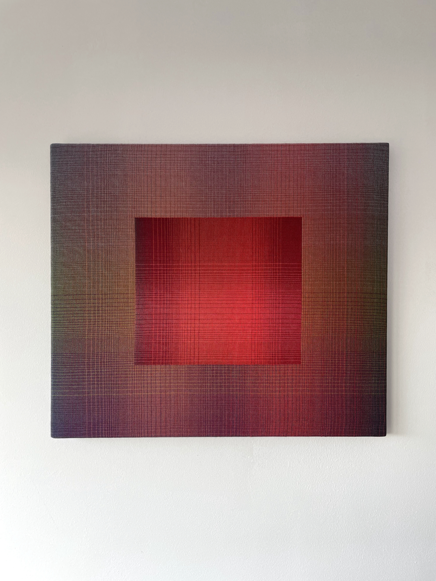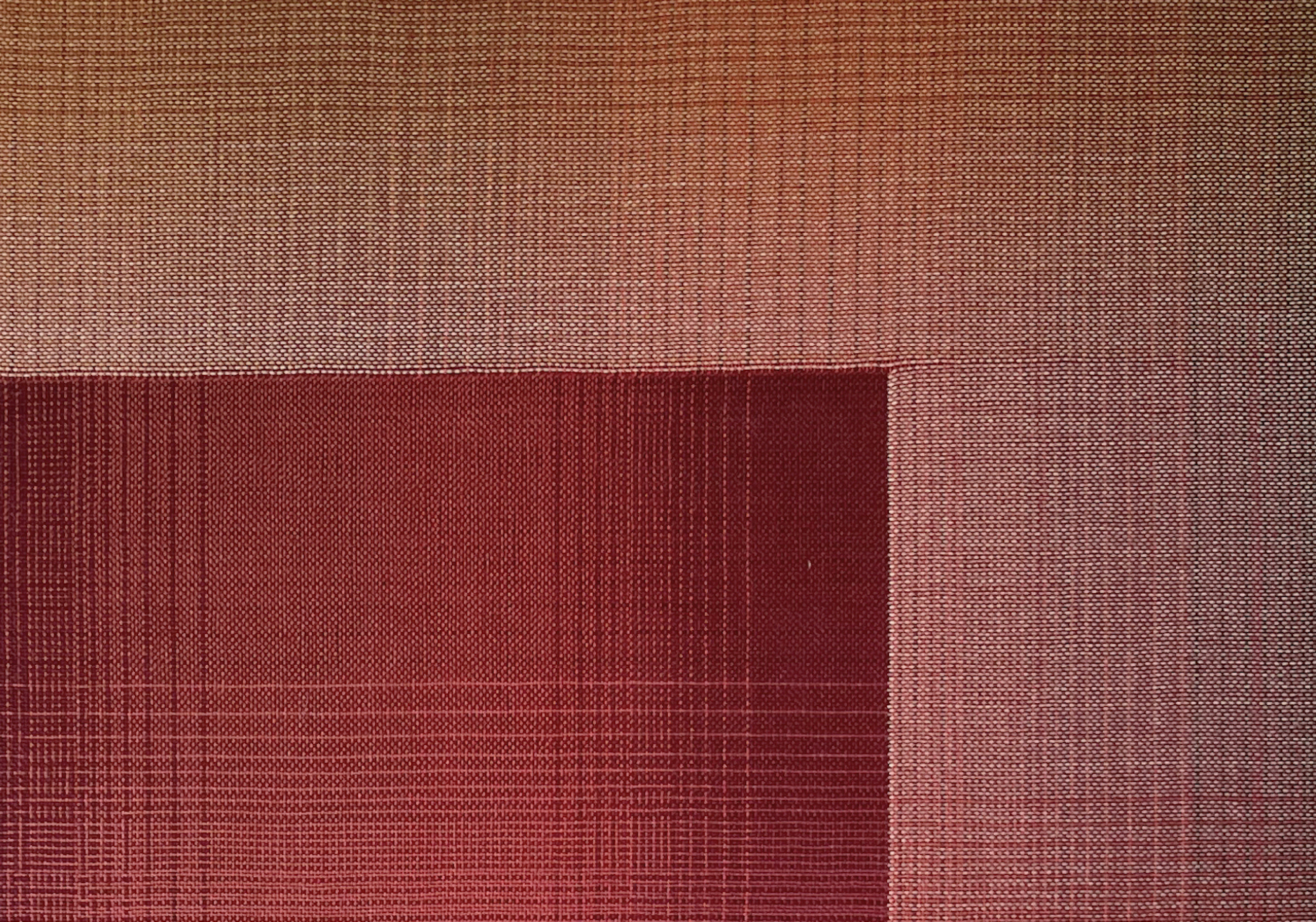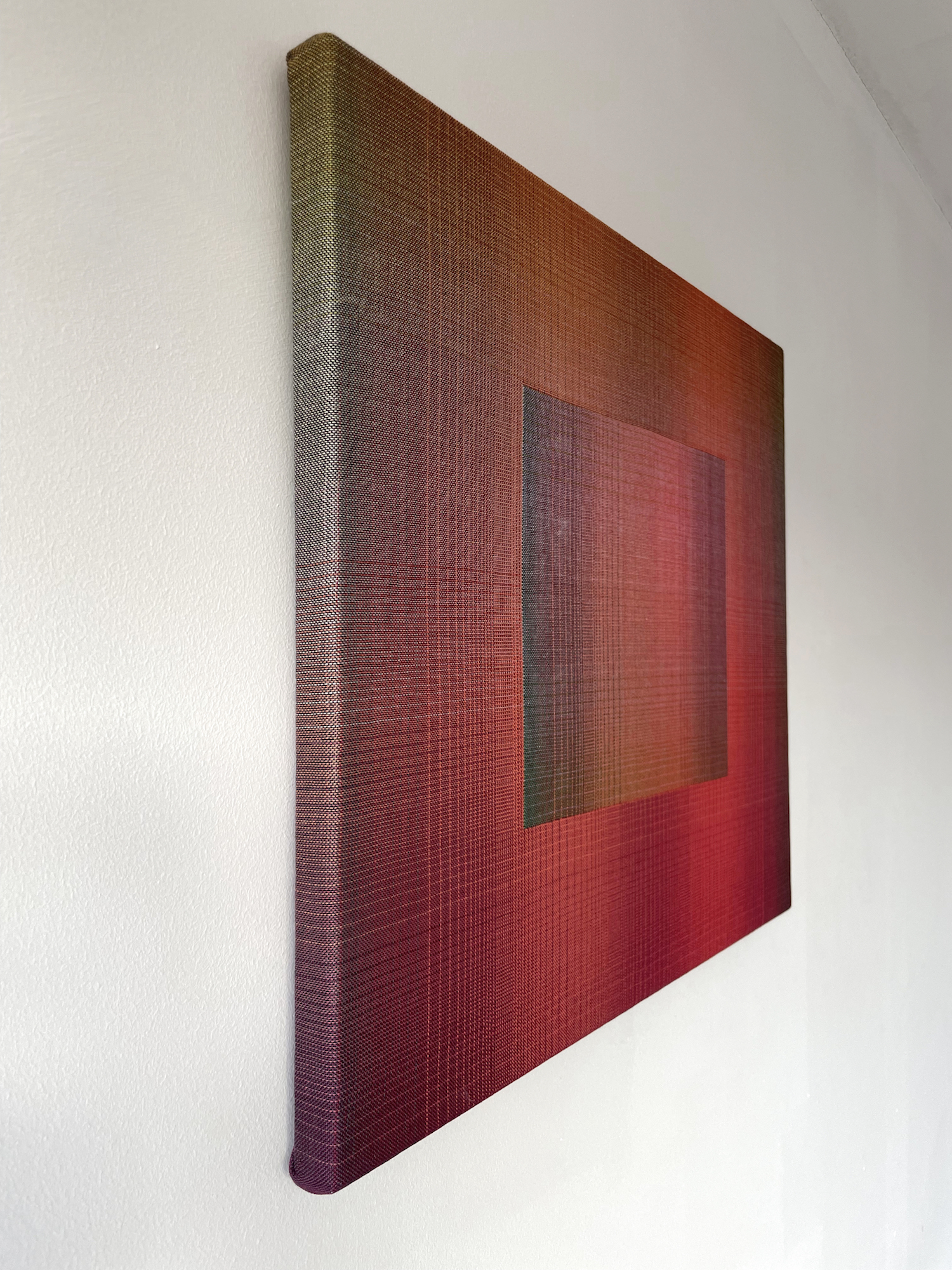 Christiane Maurer’s creative process skilfully blends traditional skills and expertise with modern digital methods. The creative part takes place on the computer: using a graphic design program, the artist works on colour studies to turn her initial idea into a digital design. Using another program, this is then transposed into a weaving draft, where the colours of each warp and weft thread are determined. Once the loom is set up, with all the coloured thread spools in their exact sequence, the artist begins to work using the ancient technique of double weaving. The woven work is stretched on a wooden frame, like a canvas. This process requires a great deal of precision and concentration, as well as a fairly lengthy working process that can last several months, from the artistic conception of the work to its production.