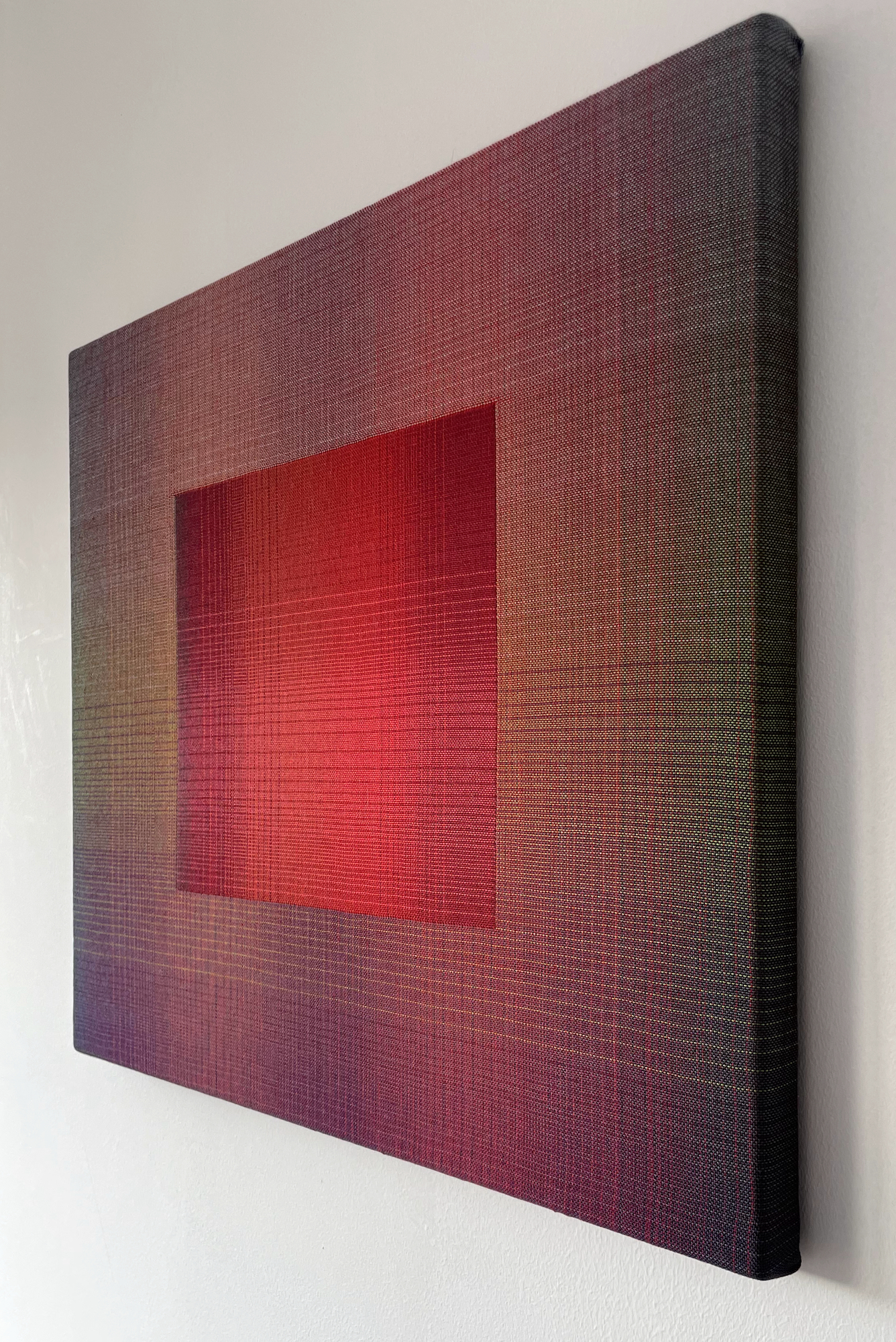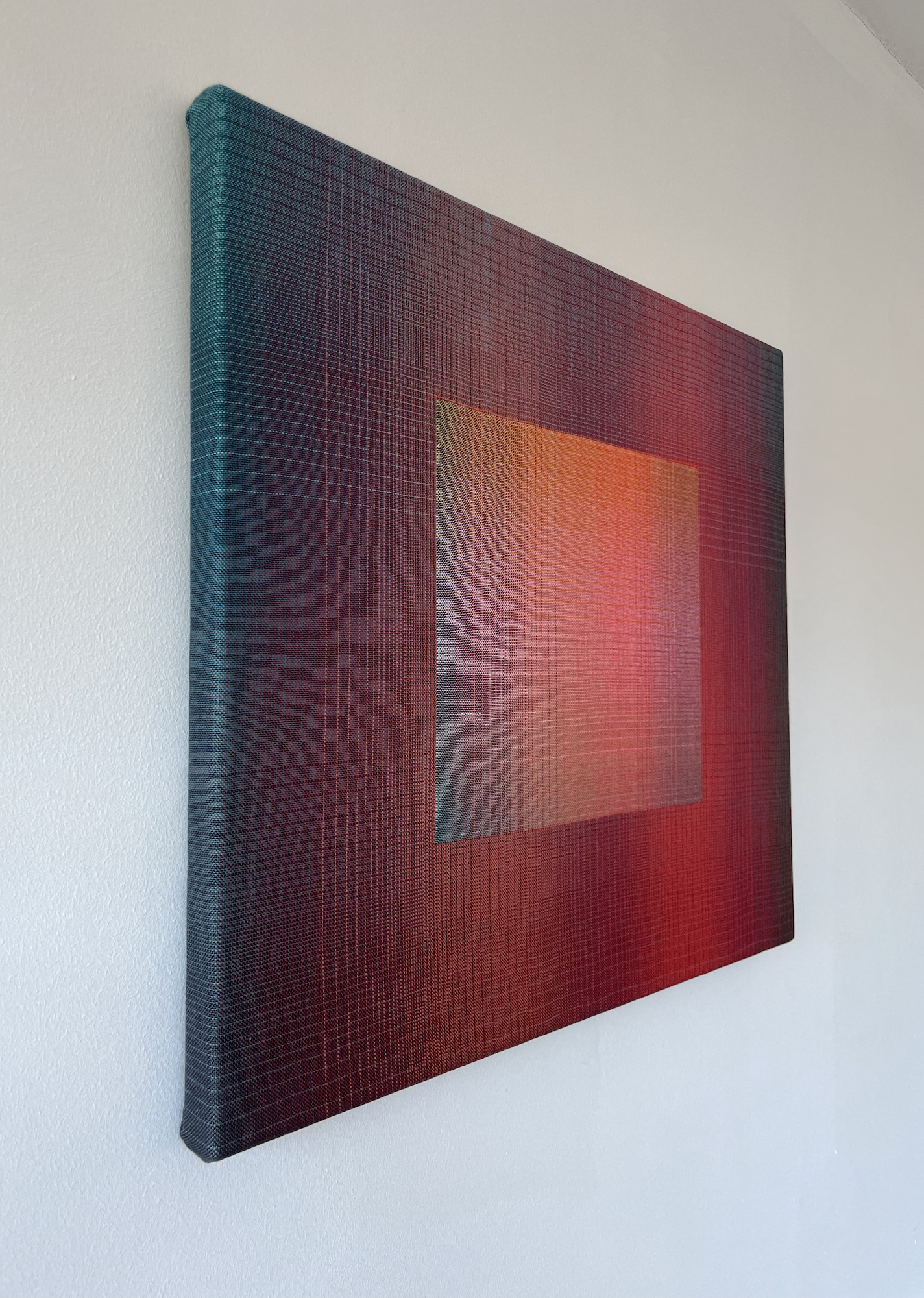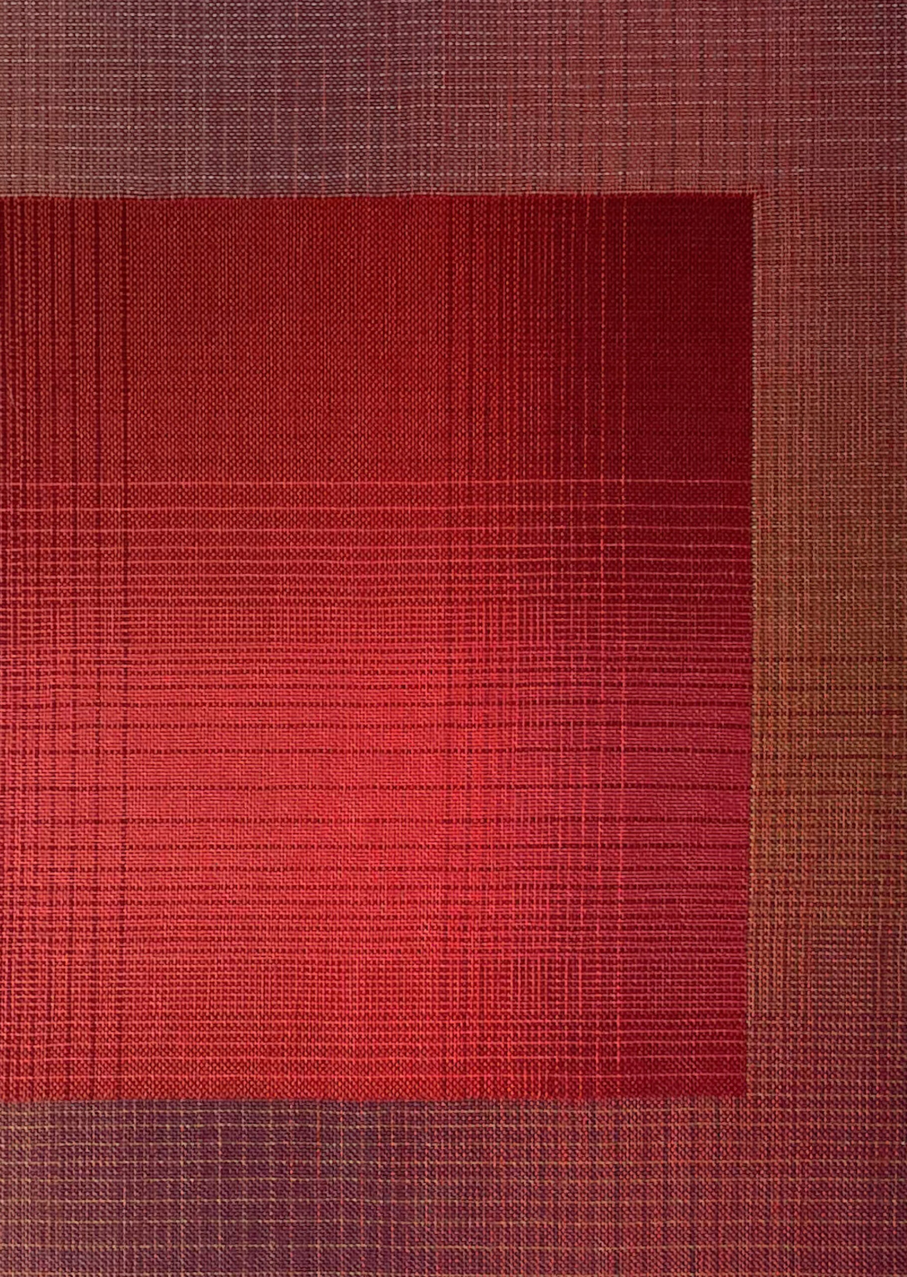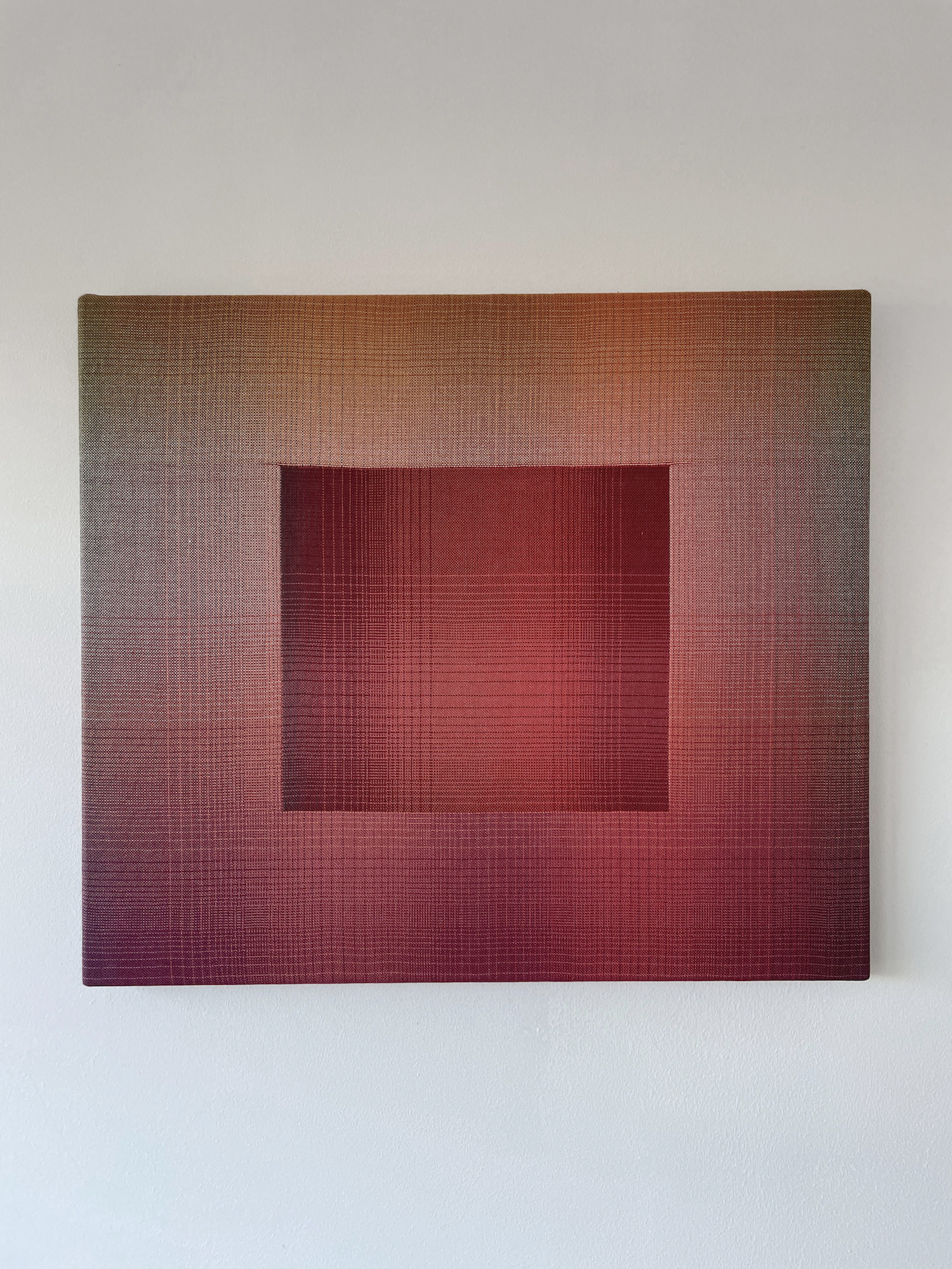 Christiane Maurer’s creative process skilfully blends traditional skills and expertise with modern digital methods. The creative part takes place on the computer: using a graphic design program, the artist works on colour studies to turn her initial idea into a digital design. Using another program, this is then transposed into a weaving draft, where the colours of each warp and weft thread are determined. Once the loom is set up, with all the coloured thread spools in their exact sequence, the artist begins to work using the ancient technique of double weaving. The woven work is stretched on a wooden frame, like a canvas. This process requires a great deal of precision and concentration, as well as a fairly lengthy working process that can last several months, from the artistic conception of the work to its production.