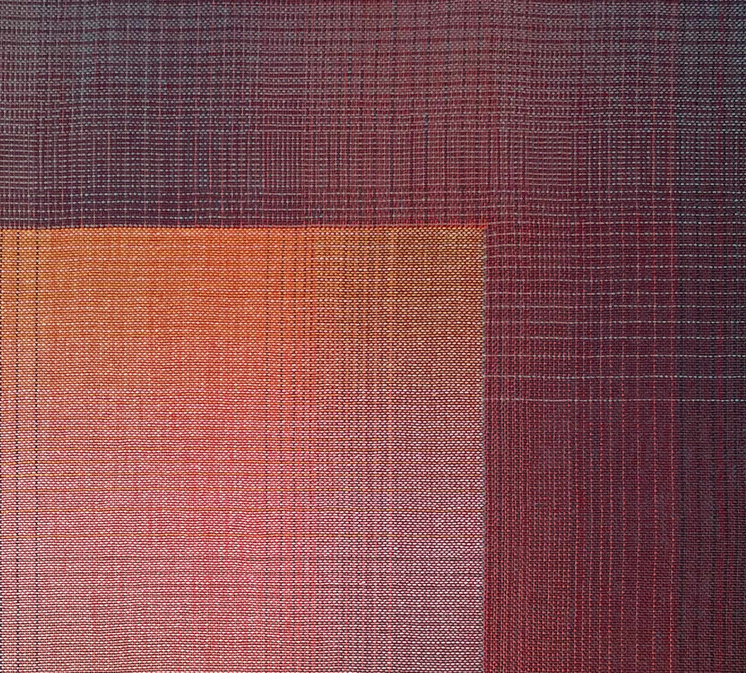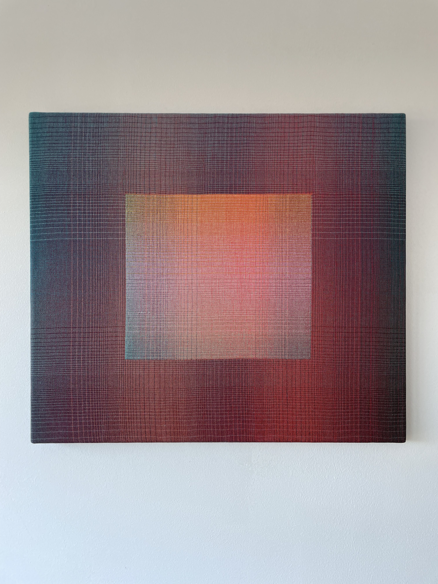 Christiane Maurer’s works, hand-woven on a loom, explore interactions, transitions and combinations of colours. The language chosen is that of abstraction: simple geometric patterns are used to create intersecting lines of different colours. Each of the artist’s series explores a different combination of colours and motifs in a constantly evolving quest. Her works, which range from very vivid to more delicate chromatic tones, reveal shifting nuances and subtle iridescence influenced by the light in their environment and the movement of the viewer.