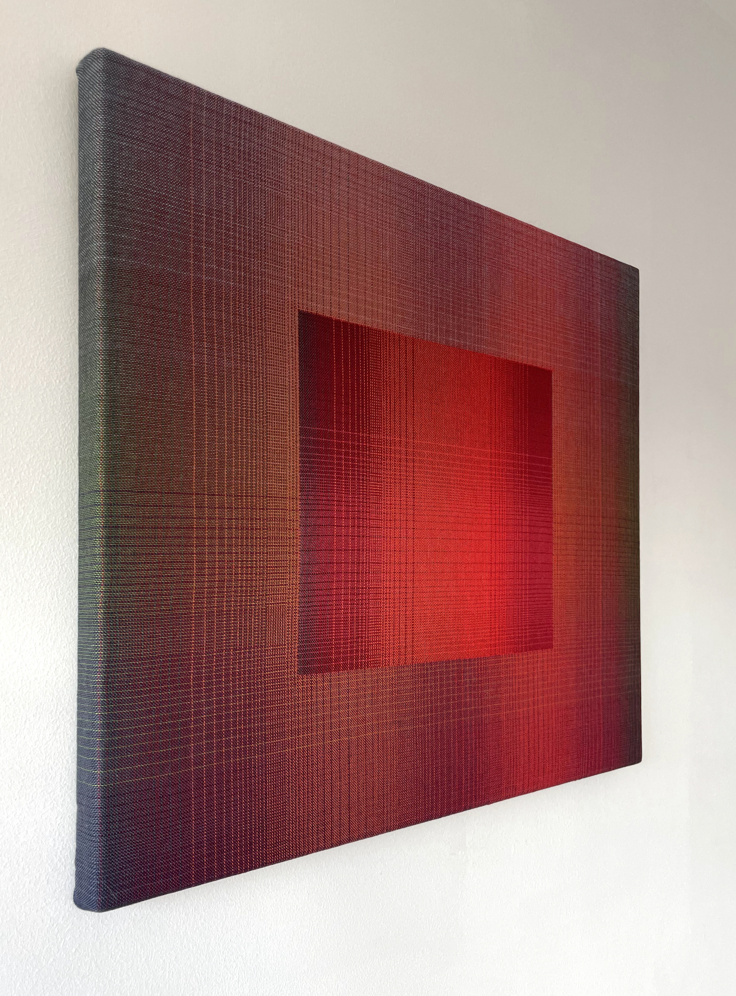 Christiane Maurer’s creative process skilfully blends traditional skills and expertise with modern digital methods. The creative part takes place on the computer: using a graphic design program, the artist works on colour studies to turn her initial idea into a digital design. Using another program, this is then transposed into a weaving draft, where the colours of each warp and weft thread are determined. Once the loom is set up, with all the coloured thread spools in their exact sequence, the artist begins to work using the ancient technique of double weaving. The woven work is stretched on a wooden frame, like a canvas. This process requires a great deal of precision and concentration, as well as a fairly lengthy working process that can last several months, from the artistic conception of the work to its production.