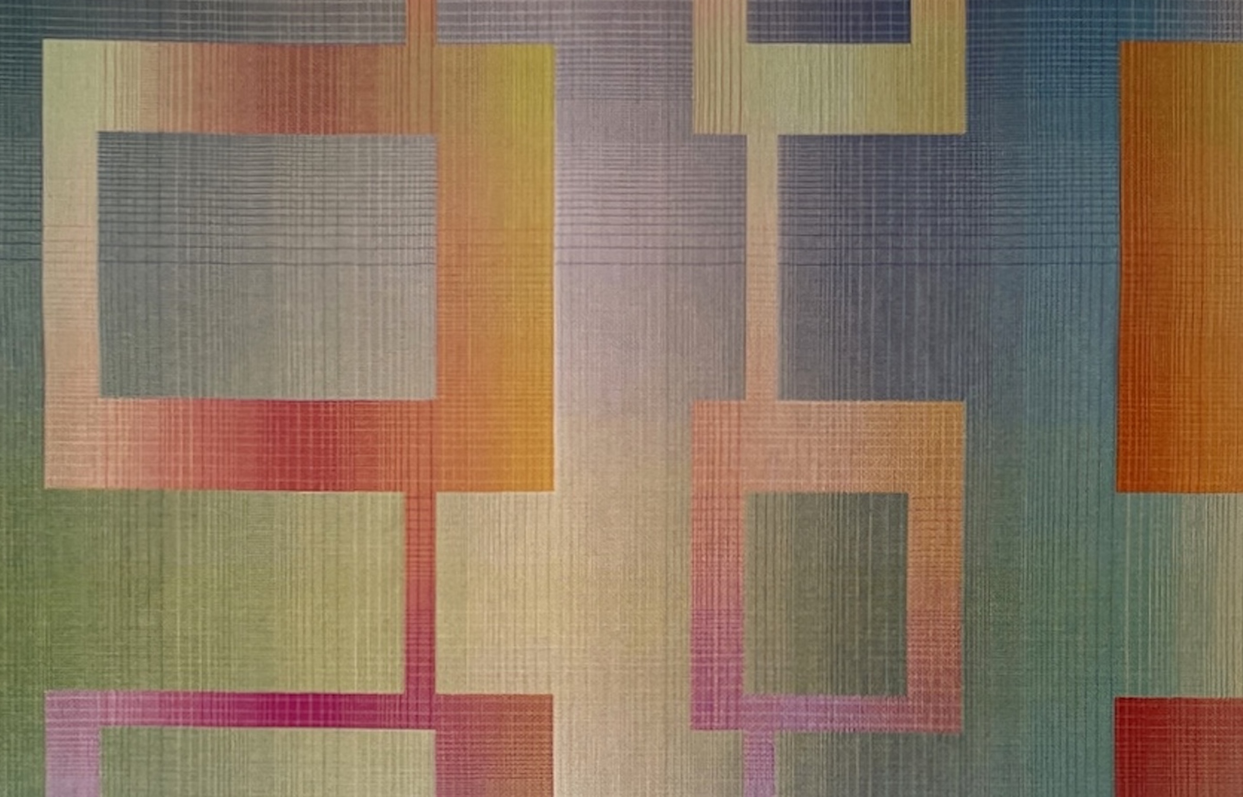 Christiane Maurer’s works, hand-woven on a loom, explore interactions, transitions and combinations of colours. The language chosen is that of abstraction: simple geometric patterns are used to create intersecting lines of different colours. Each of the artist’s series explores a different combination of colours and motifs in a constantly evolving quest. Her works, which range from very vivid to more delicate chromatic tones, reveal shifting nuances and subtle iridescence influenced by the light in their environment and the movement of the viewer.