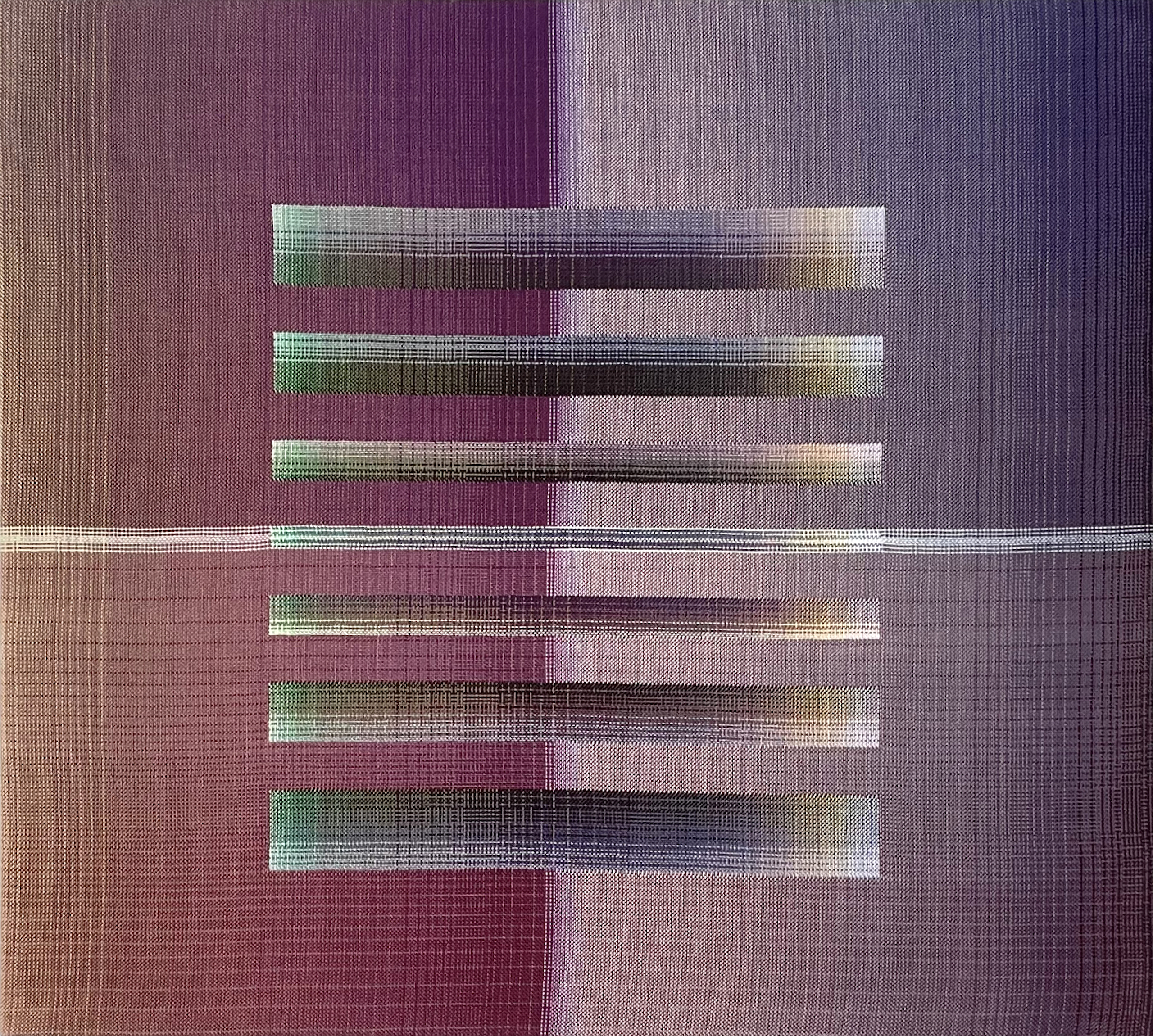 Christiane Maurer’s works, hand-woven on a loom, explore interactions, transitions and combinations of colours. The language chosen is that of abstraction: simple geometric patterns are used to create intersecting lines of different colours. Each of the artist’s series explores a different combination of colours and motifs in a constantly evolving quest. Her works, which range from very vivid to more delicate chromatic tones, reveal shifting nuances and subtle iridescence influenced by the light in their environment and the movement of the viewer.