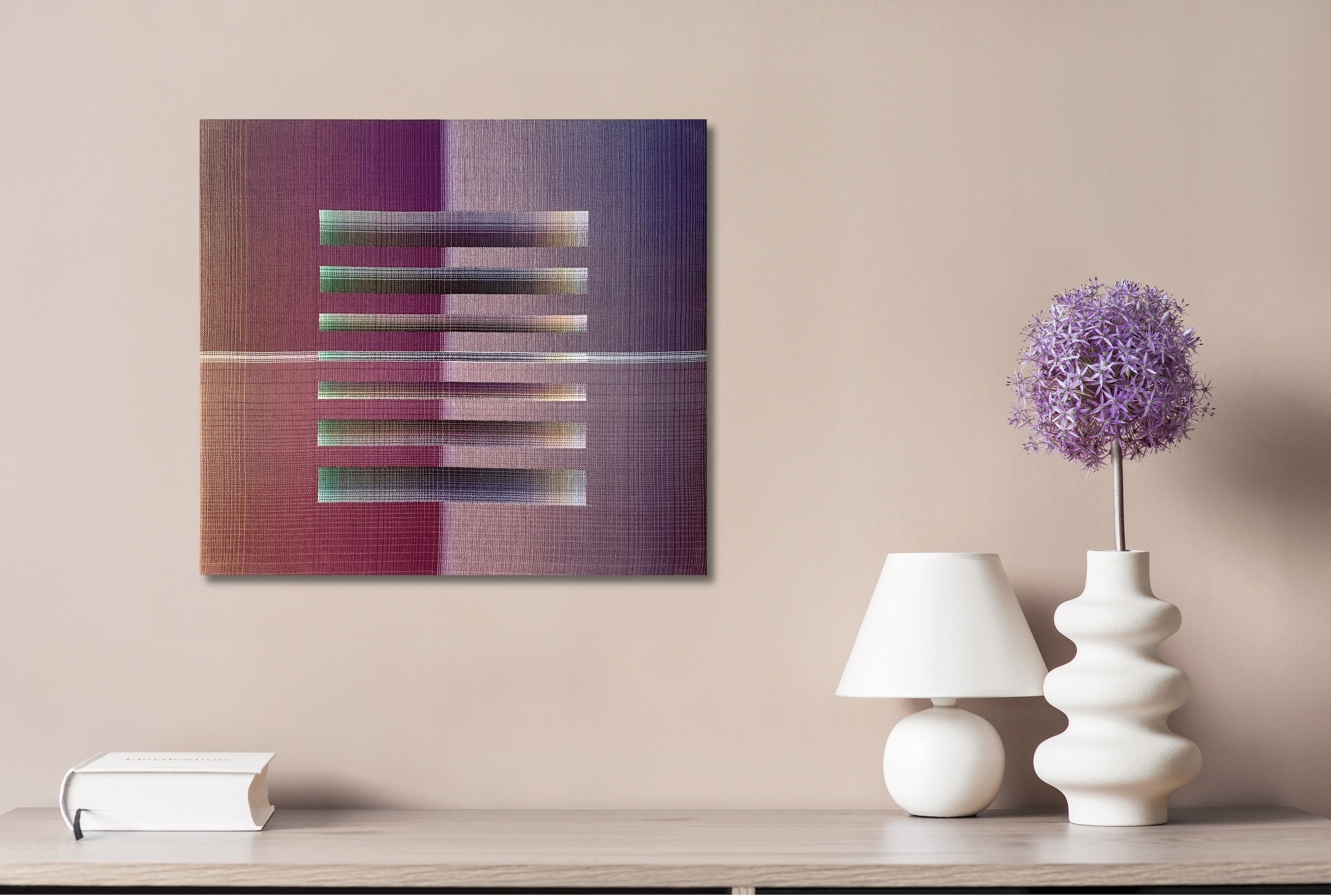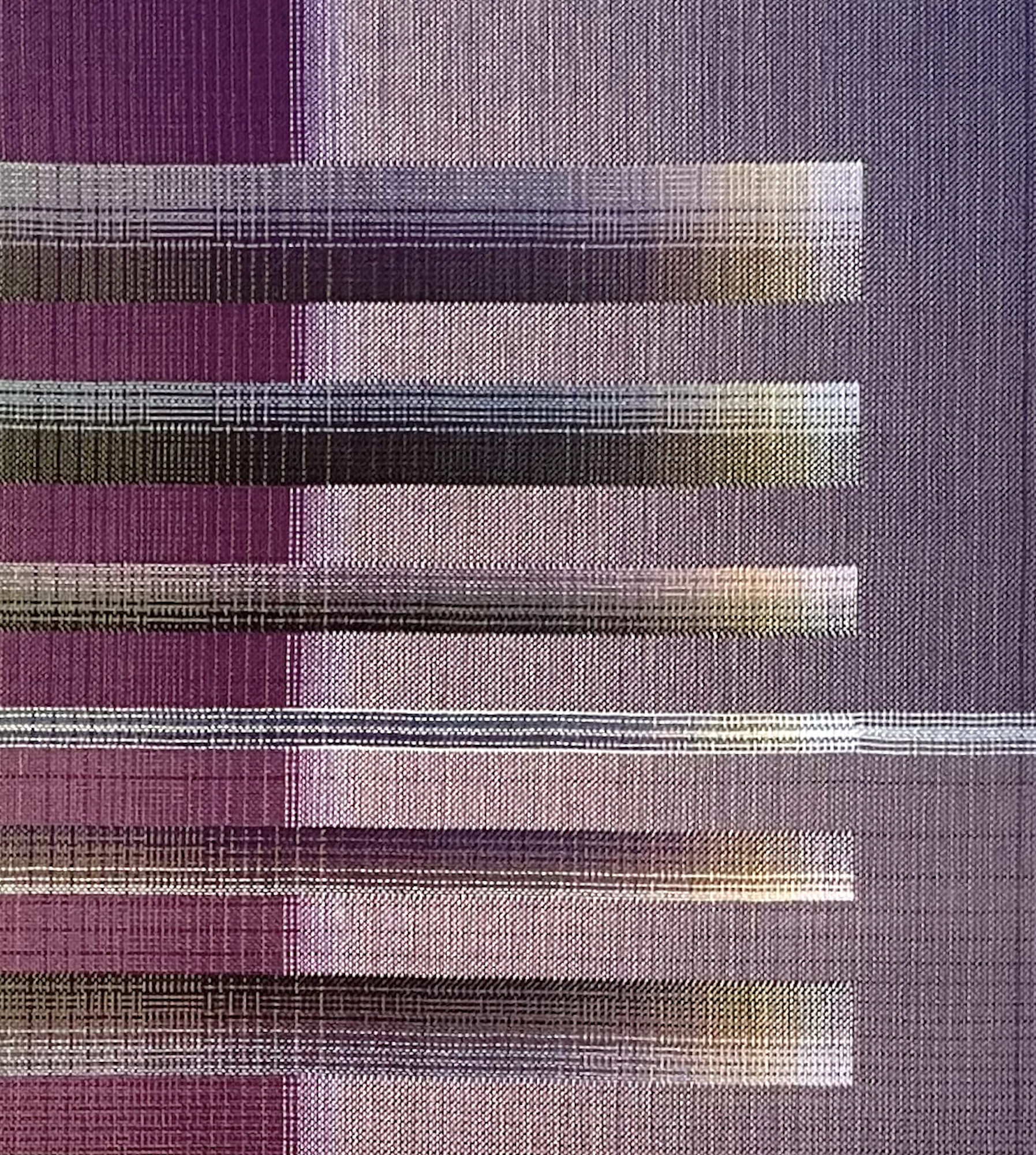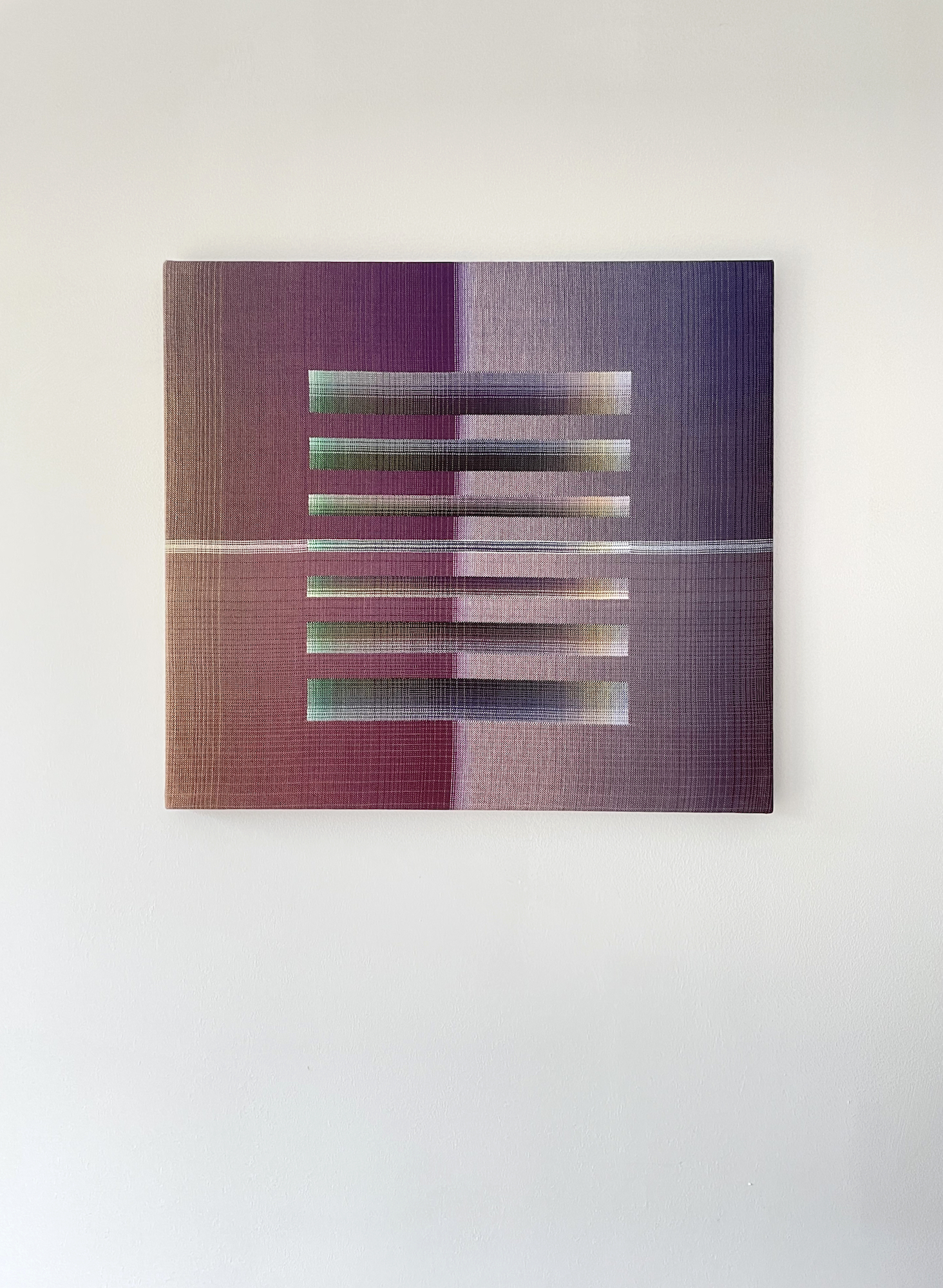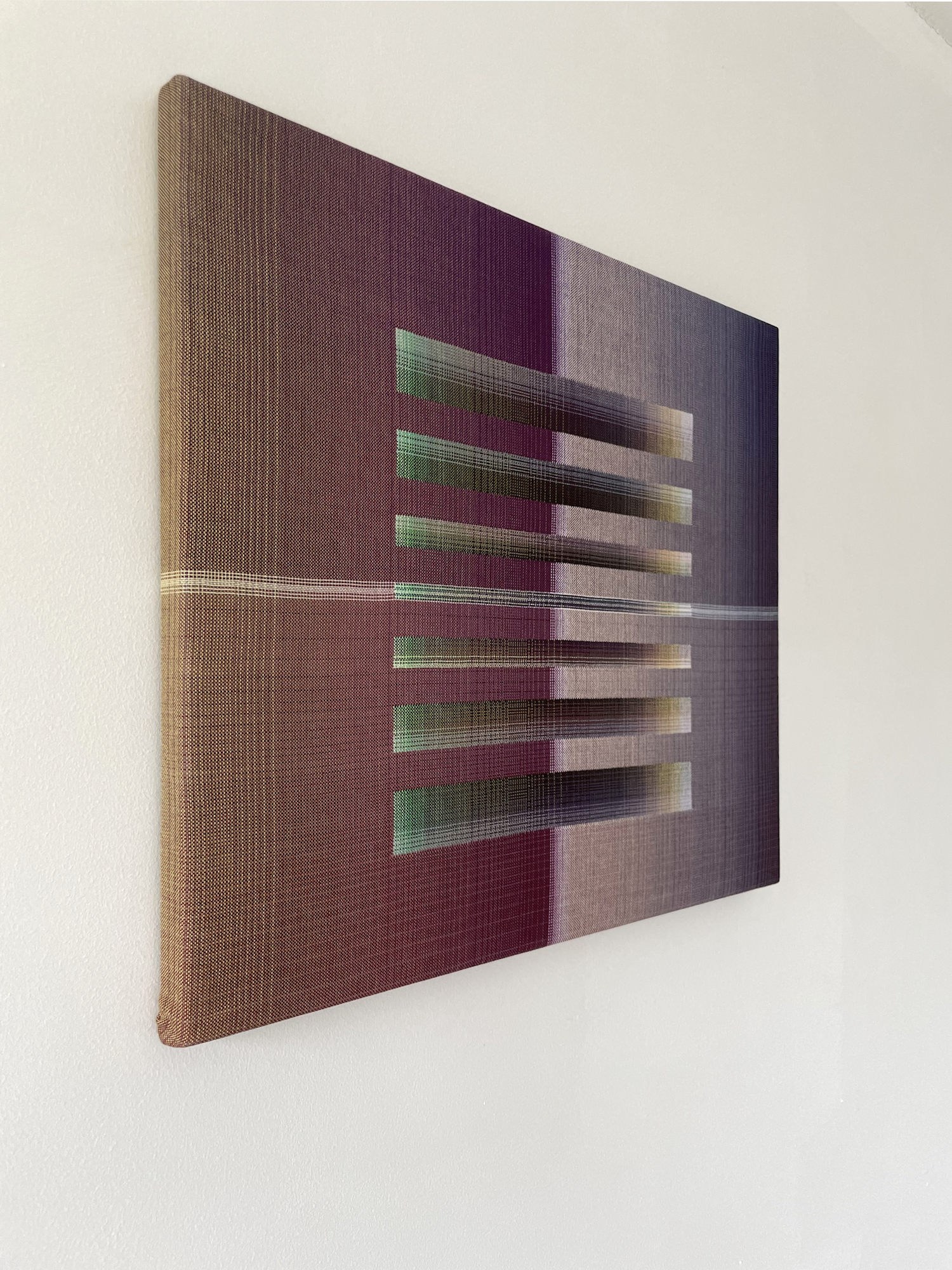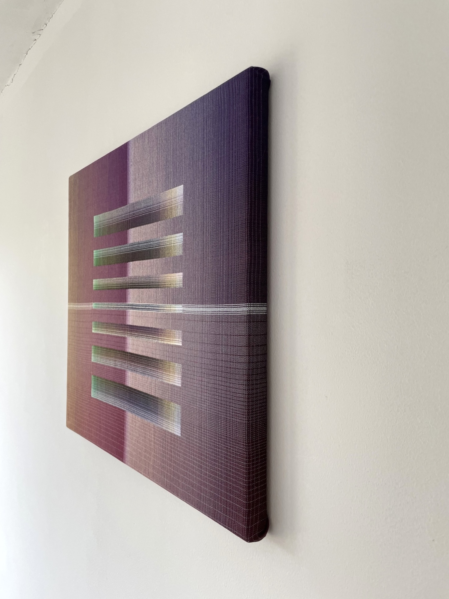 Christiane Maurer’s creative process skilfully blends traditional skills and expertise with modern digital methods. The creative part takes place on the computer: using a graphic design program, the artist works on colour studies to turn her initial idea into a digital design. Using another program, this is then transposed into a weaving draft, where the colours of each warp and weft thread are determined. Once the loom is set up, with all the coloured thread spools in their exact sequence, the artist begins to work using the ancient technique of double weaving. The woven work is stretched on a wooden frame, like a canvas. This process requires a great deal of precision and concentration, as well as a fairly lengthy working process that can last several months, from the artistic conception of the work to its production.