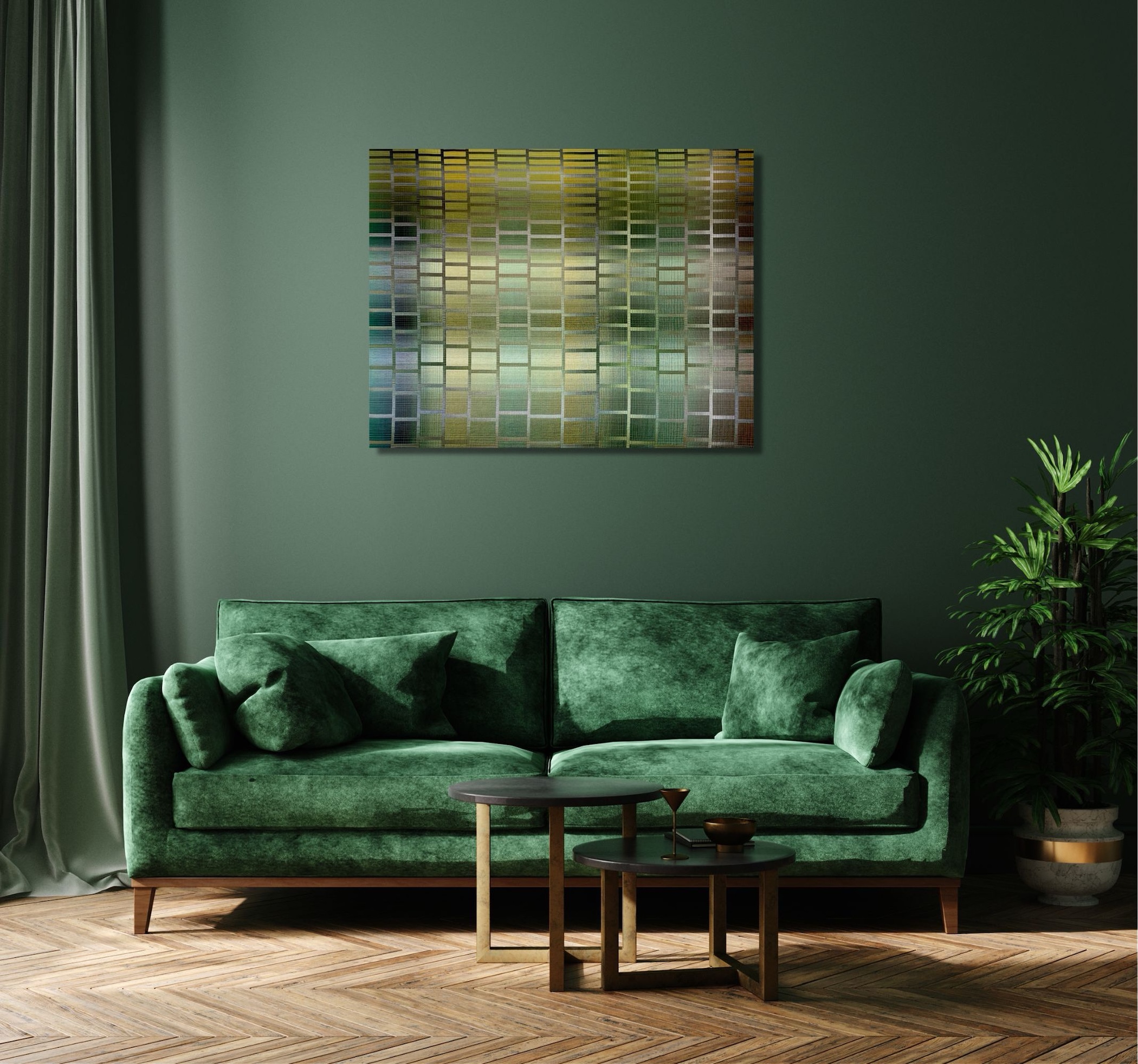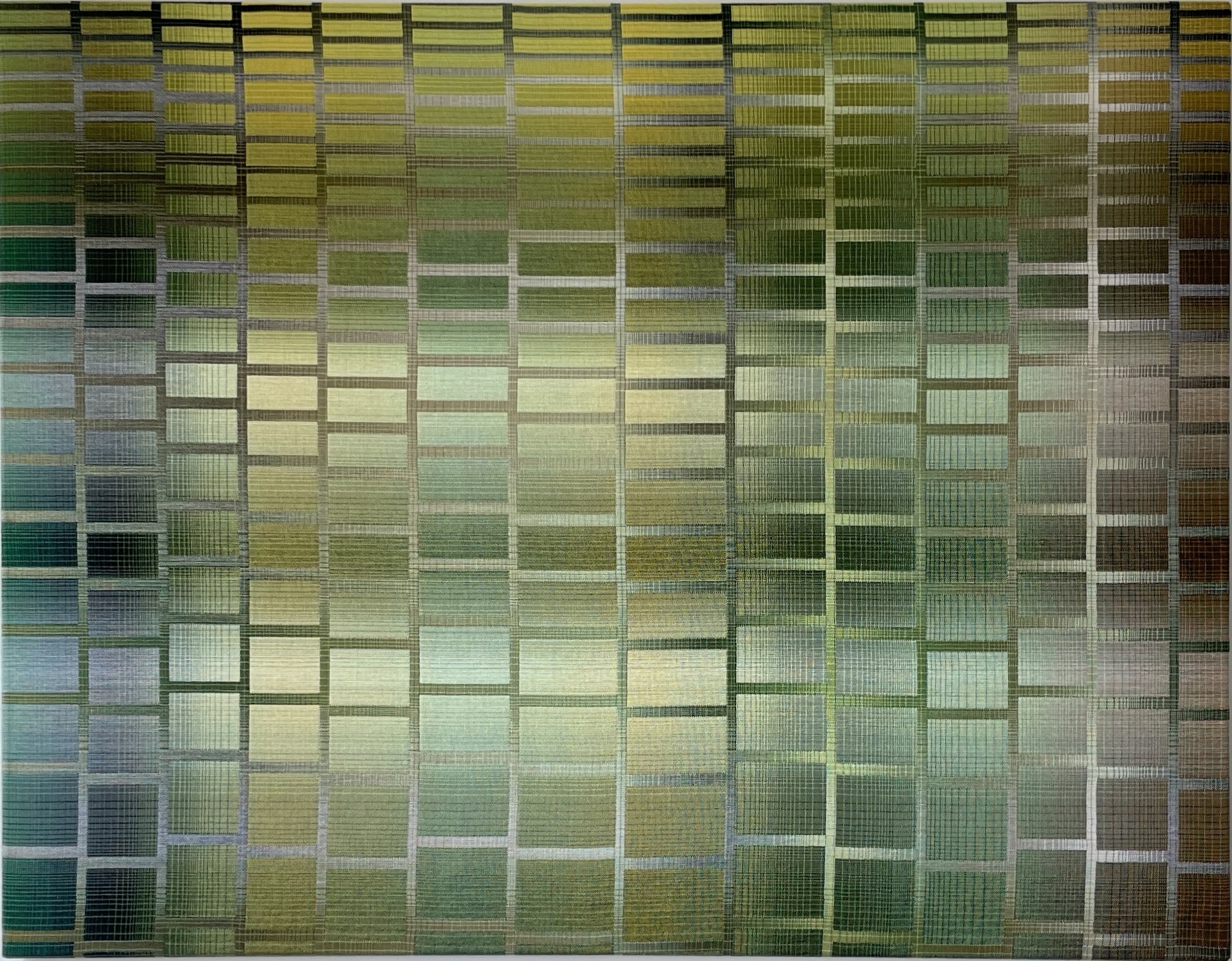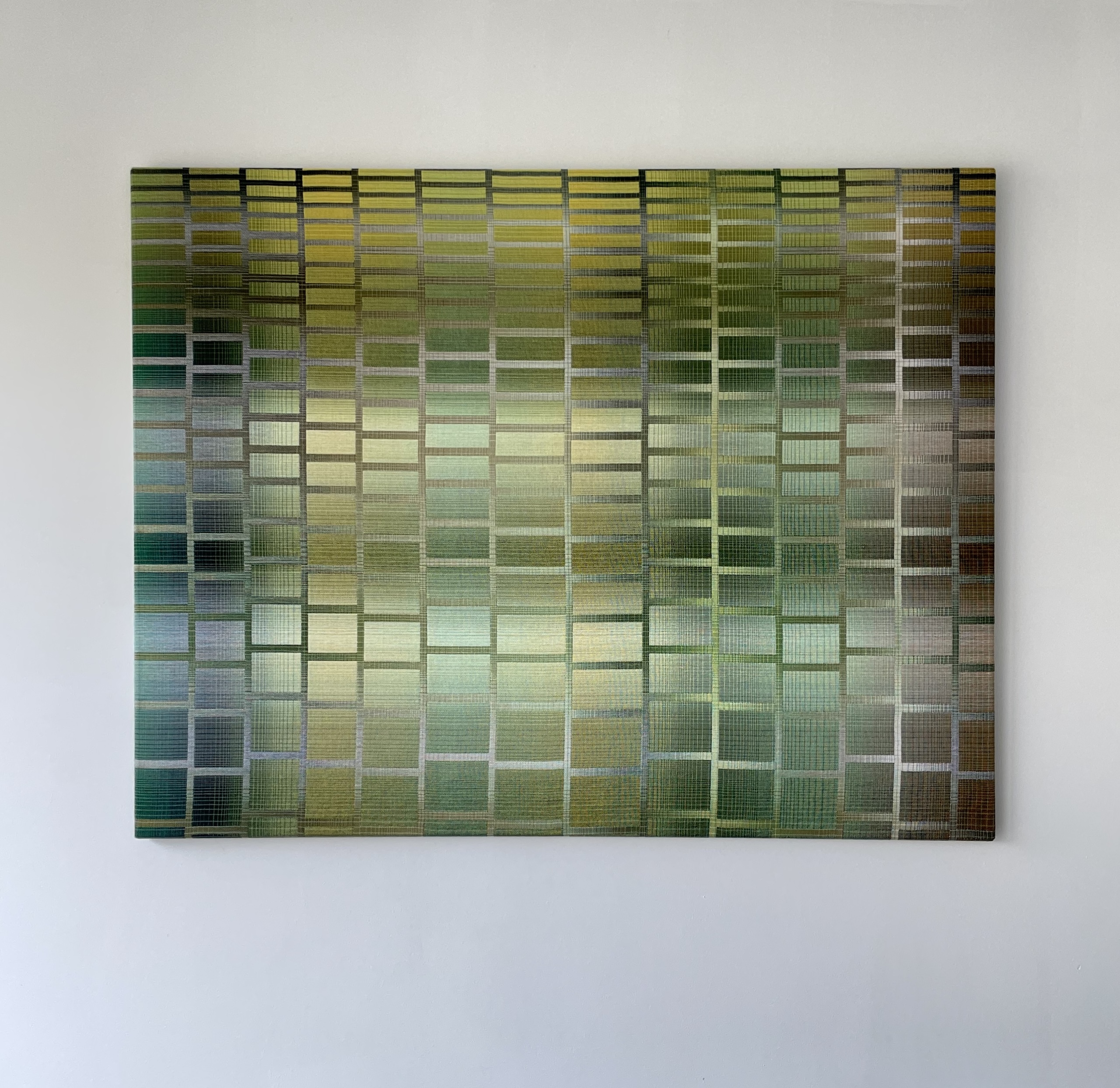 In this series, the artist divides the canvas space into a grid. These geometrical patterns are not aligned, creating a play of shapes and colors. These devices allow her to multiply the interactions between the colours she has chosen and their different tones. Here, she has chosen shades of green, yellow, brown and blue.