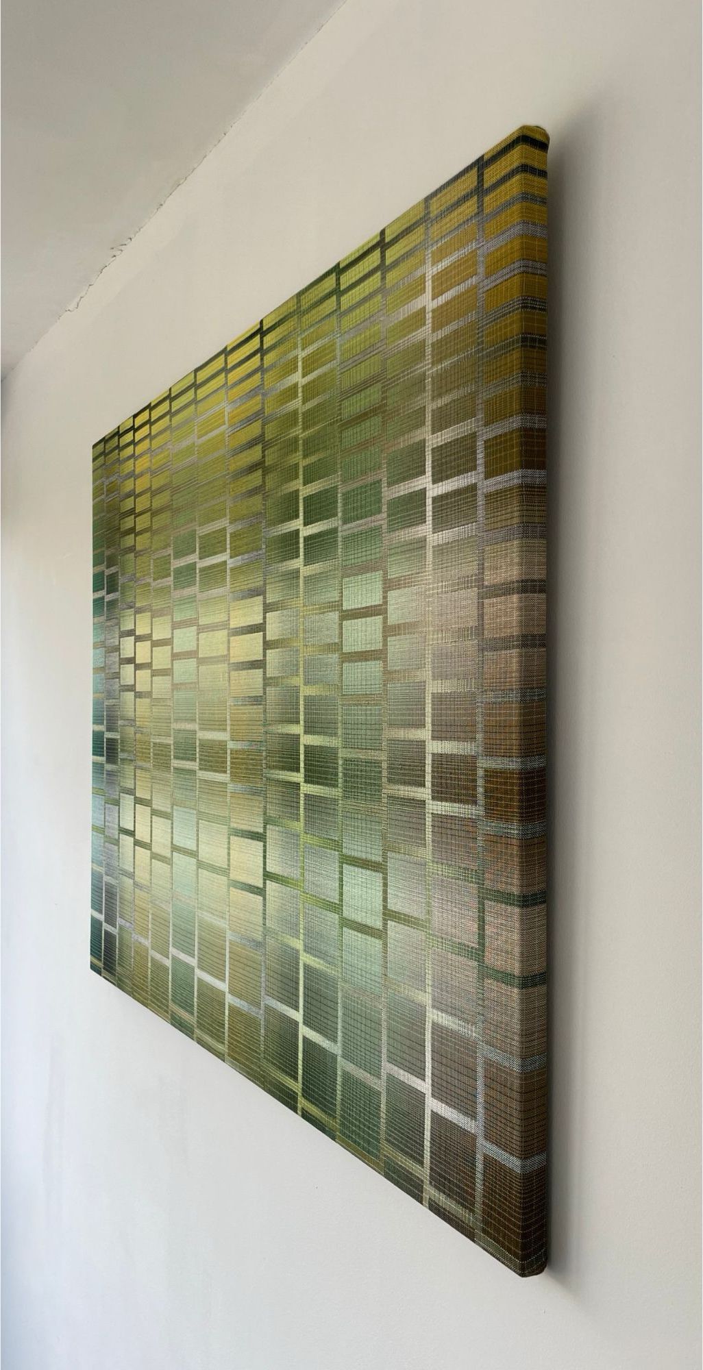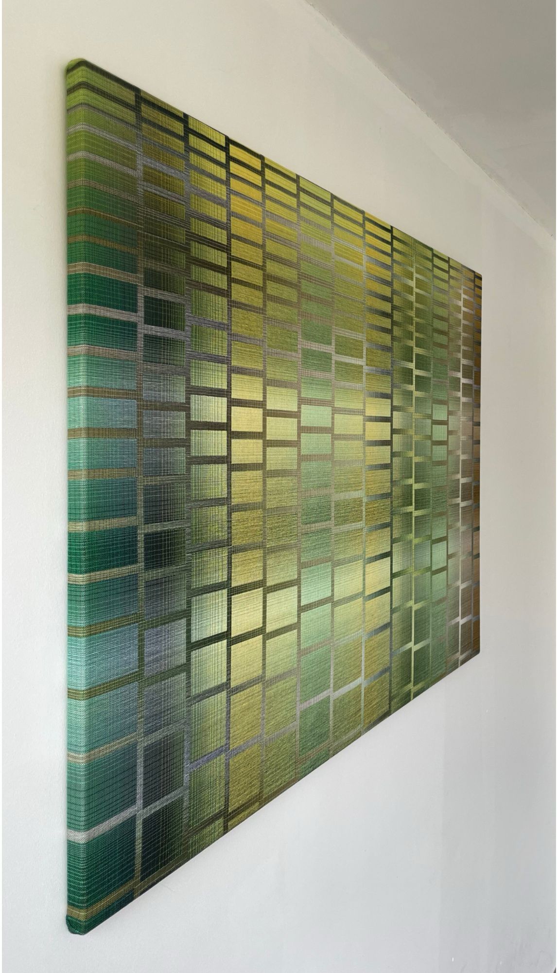 Christiane Maurer’s creative process skilfully blends traditional skills and expertise with modern digital methods. The creative part takes place on the computer: using a graphic design program, the artist works on colour studies to turn her initial idea into a digital design. Using another program, this is then transposed into a weaving draft, where the colours of each warp and weft thread are determined. Once the loom is set up, with all the coloured thread spools in their exact sequence, the artist begins to work using the ancient technique of double weaving. The woven work is stretched on a wooden frame, like a canvas. This process requires a great deal of precision and concentration, as well as a fairly lengthy working process that can last several months, from the artistic conception of the work to its production.