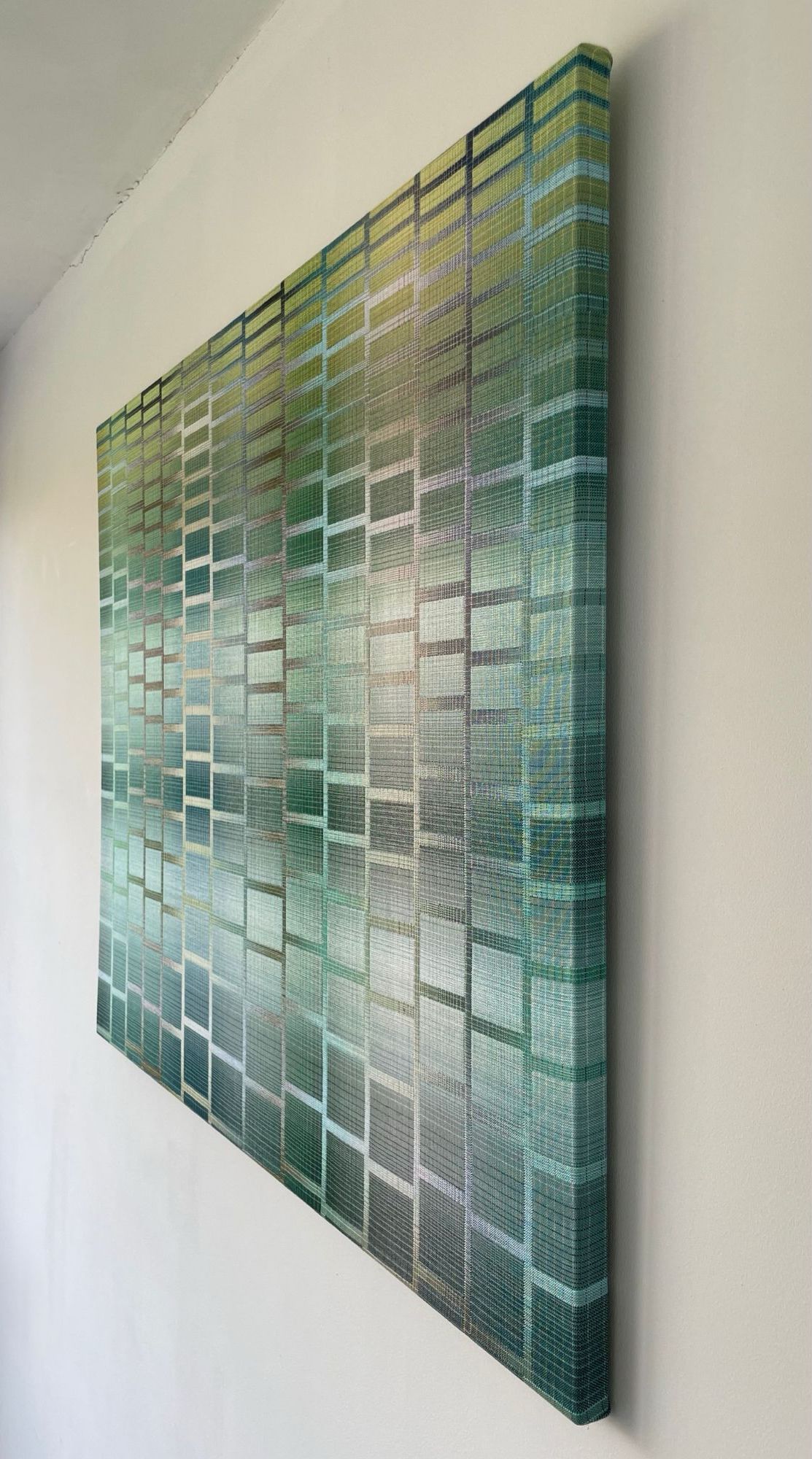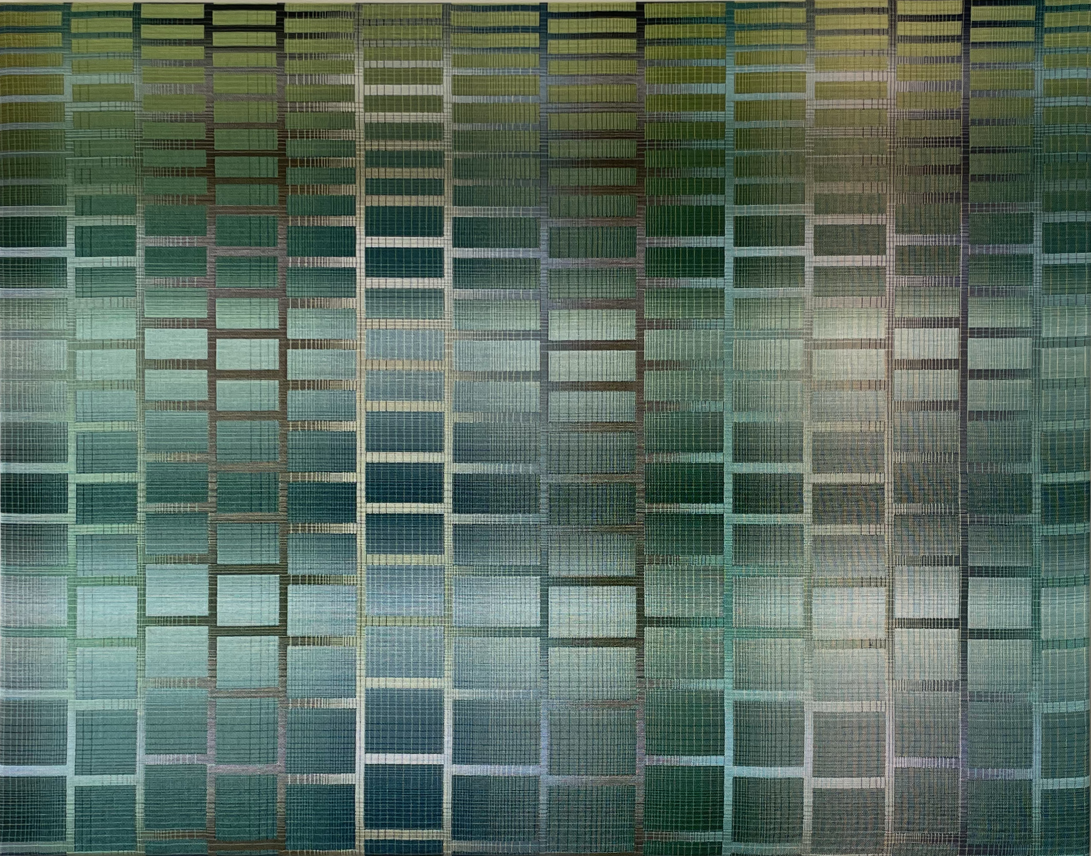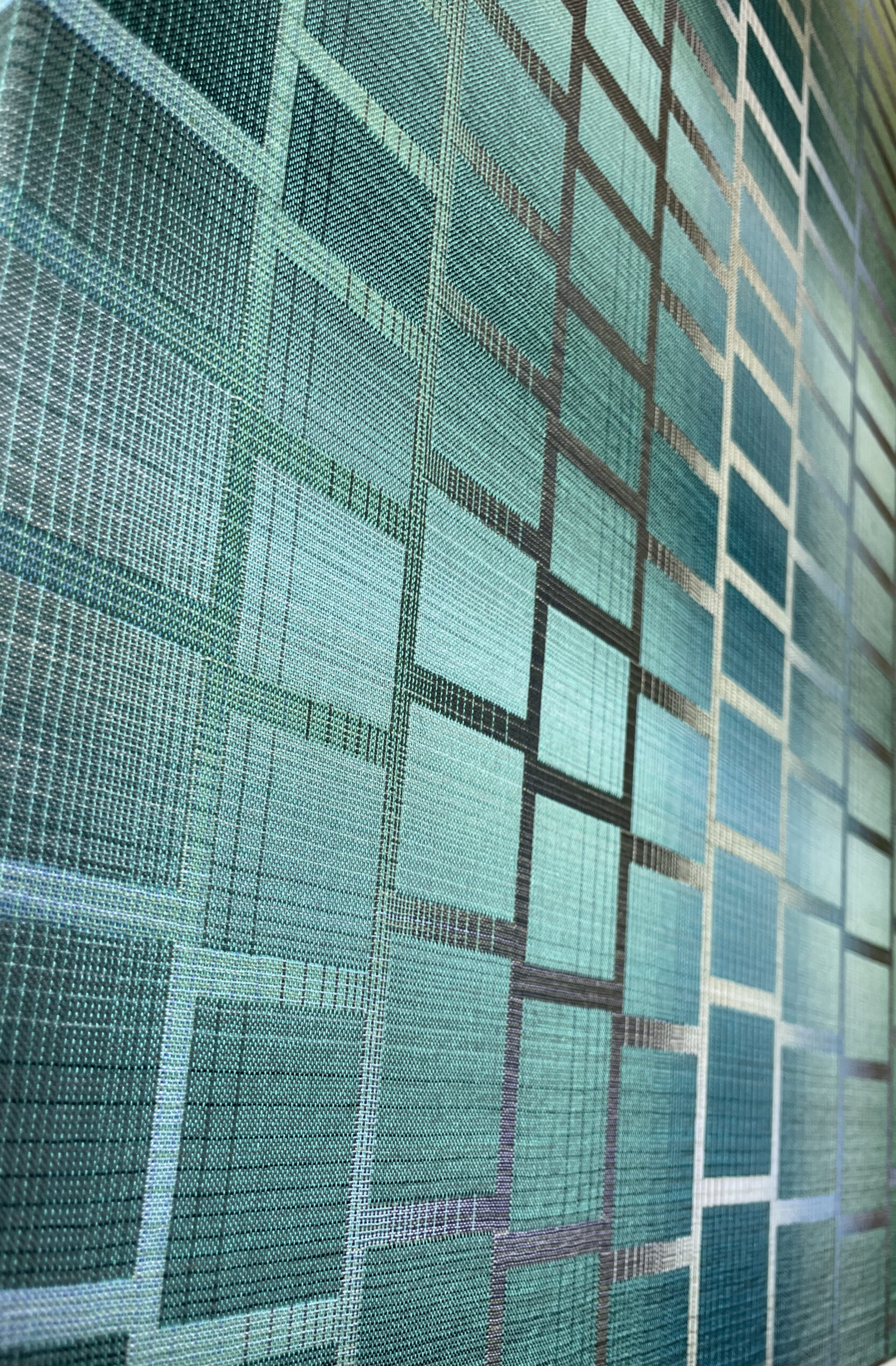 Christiane Maurer’s creative process skilfully blends traditional skills and expertise with modern digital methods. The creative part takes place on the computer: using a graphic design program, the artist works on colour studies to turn her initial idea into a digital design. Using another program, this is then transposed into a weaving draft, where the colours of each warp and weft thread are determined. Once the loom is set up, with all the coloured thread spools in their exact sequence, the artist begins to work using the ancient technique of double weaving. The woven work is stretched on a wooden frame, like a canvas. This process requires a great deal of precision and concentration, as well as a fairly lengthy working process that can last several months, from the artistic conception of the work to its production.