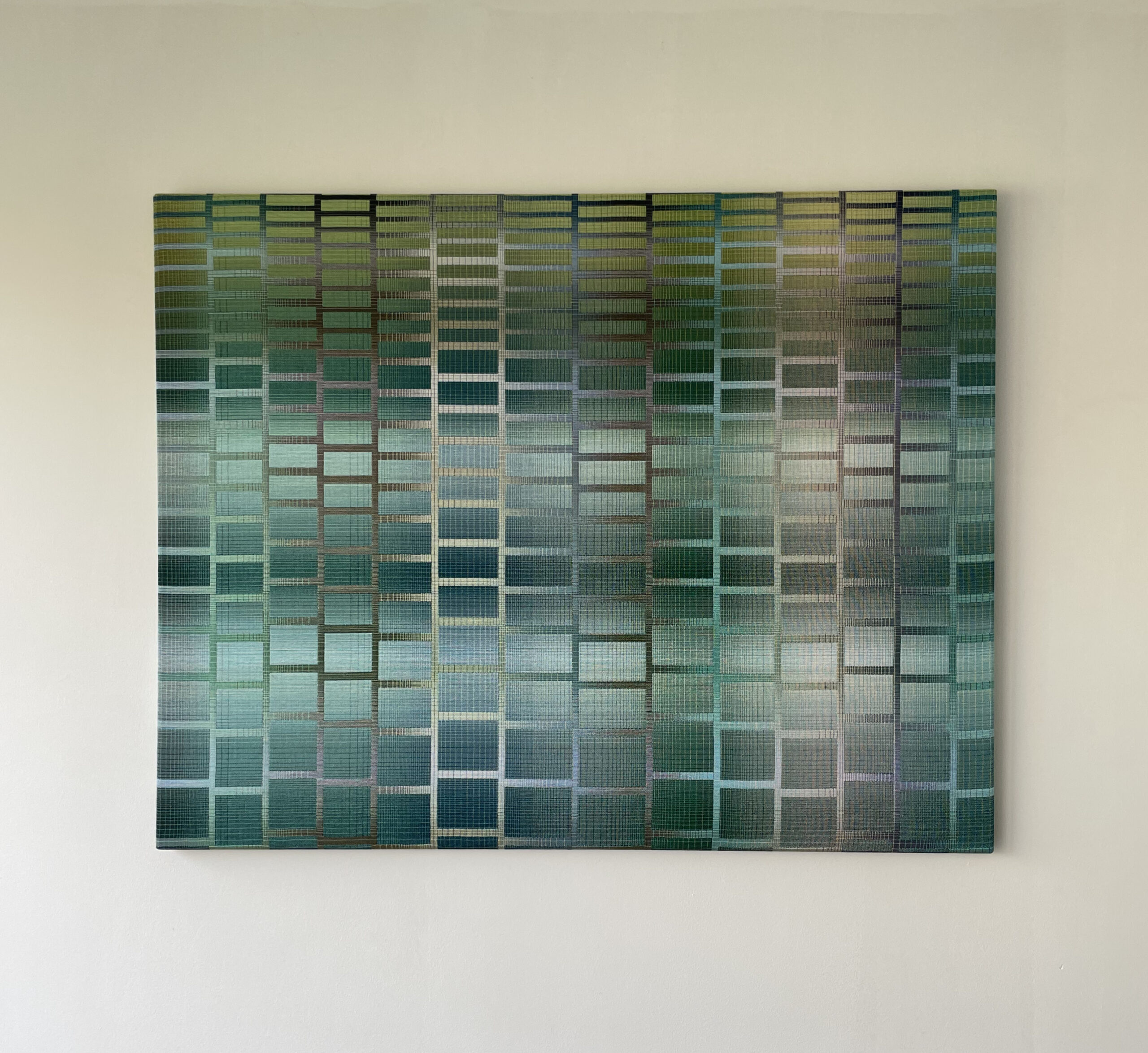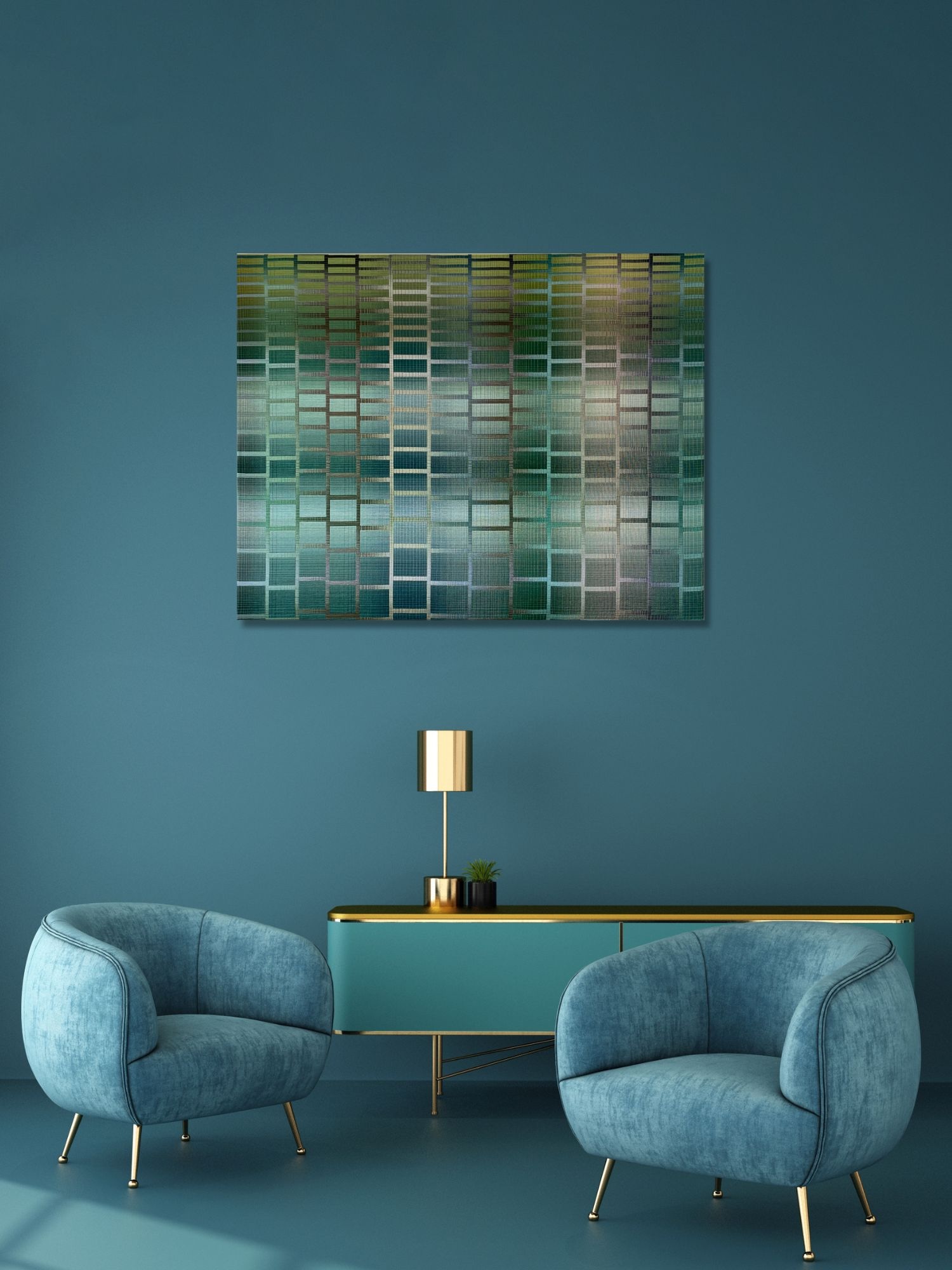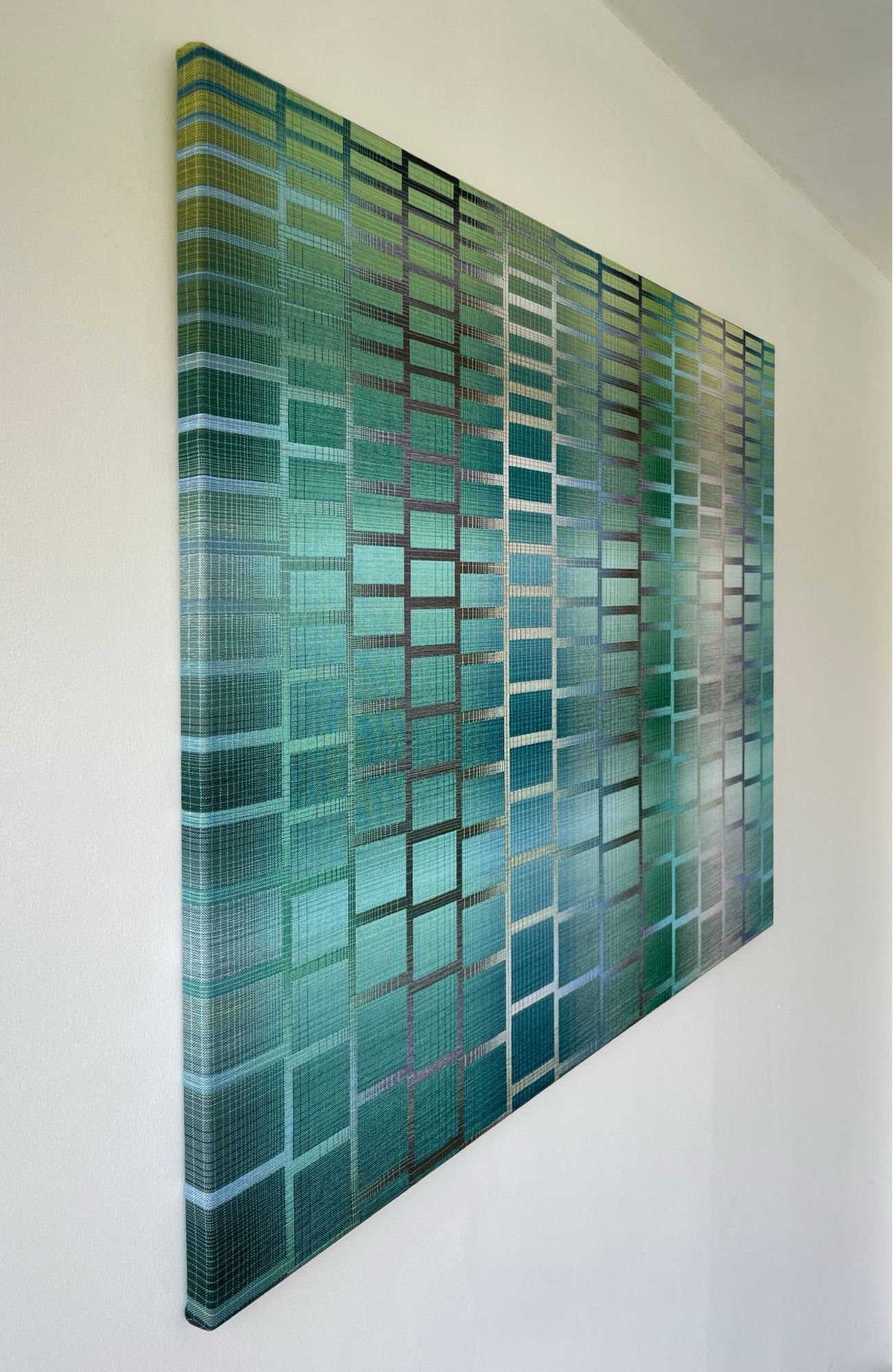 In this series, the artist divides the canvas space into a grid. These geometrical patterns are not aligned, creating a play of shapes and colors. These devices allow her to multiply the interactions between the colours she has chosen and their different tones. Here, she has chosen shades of turquoise blue.
