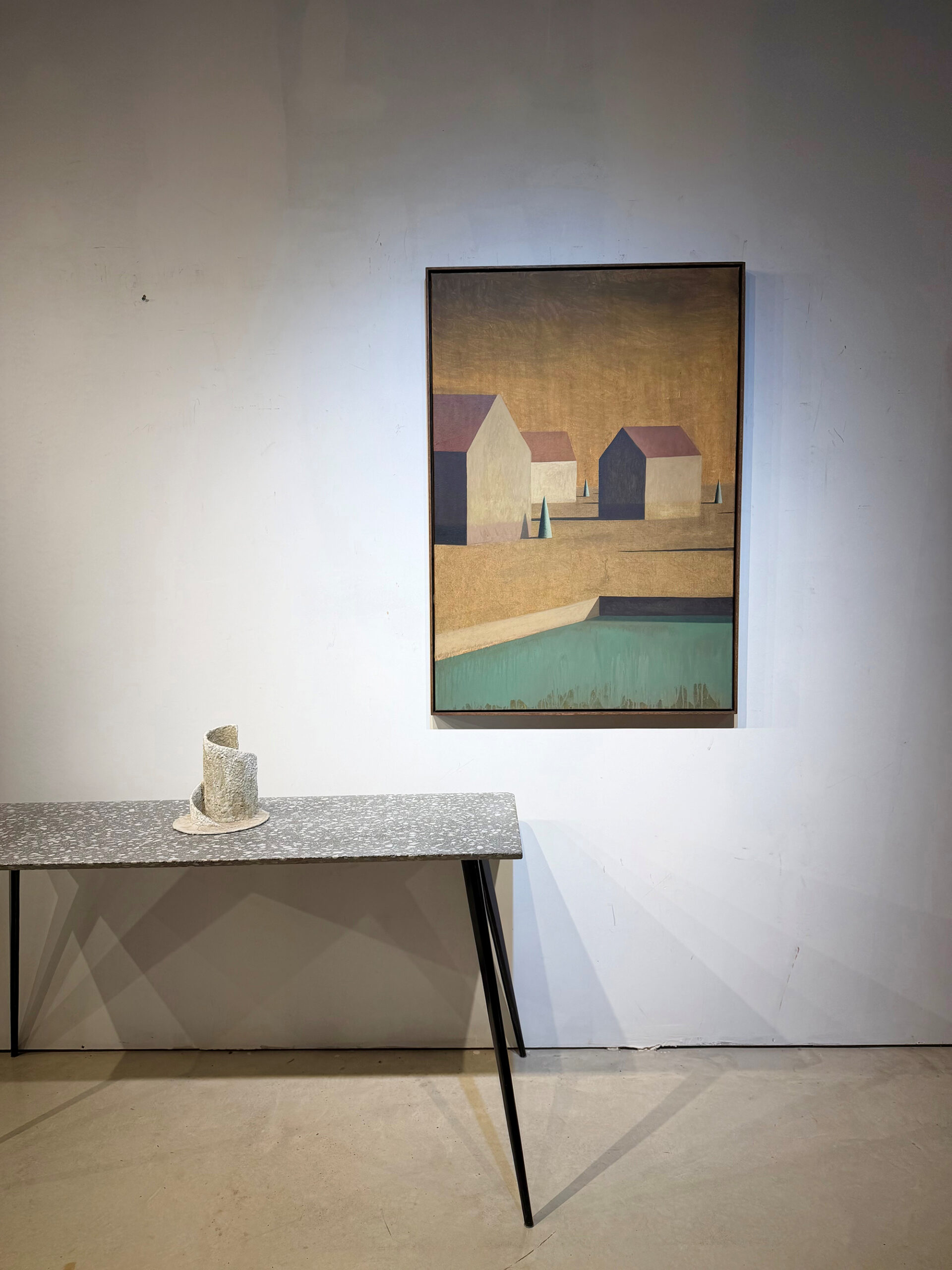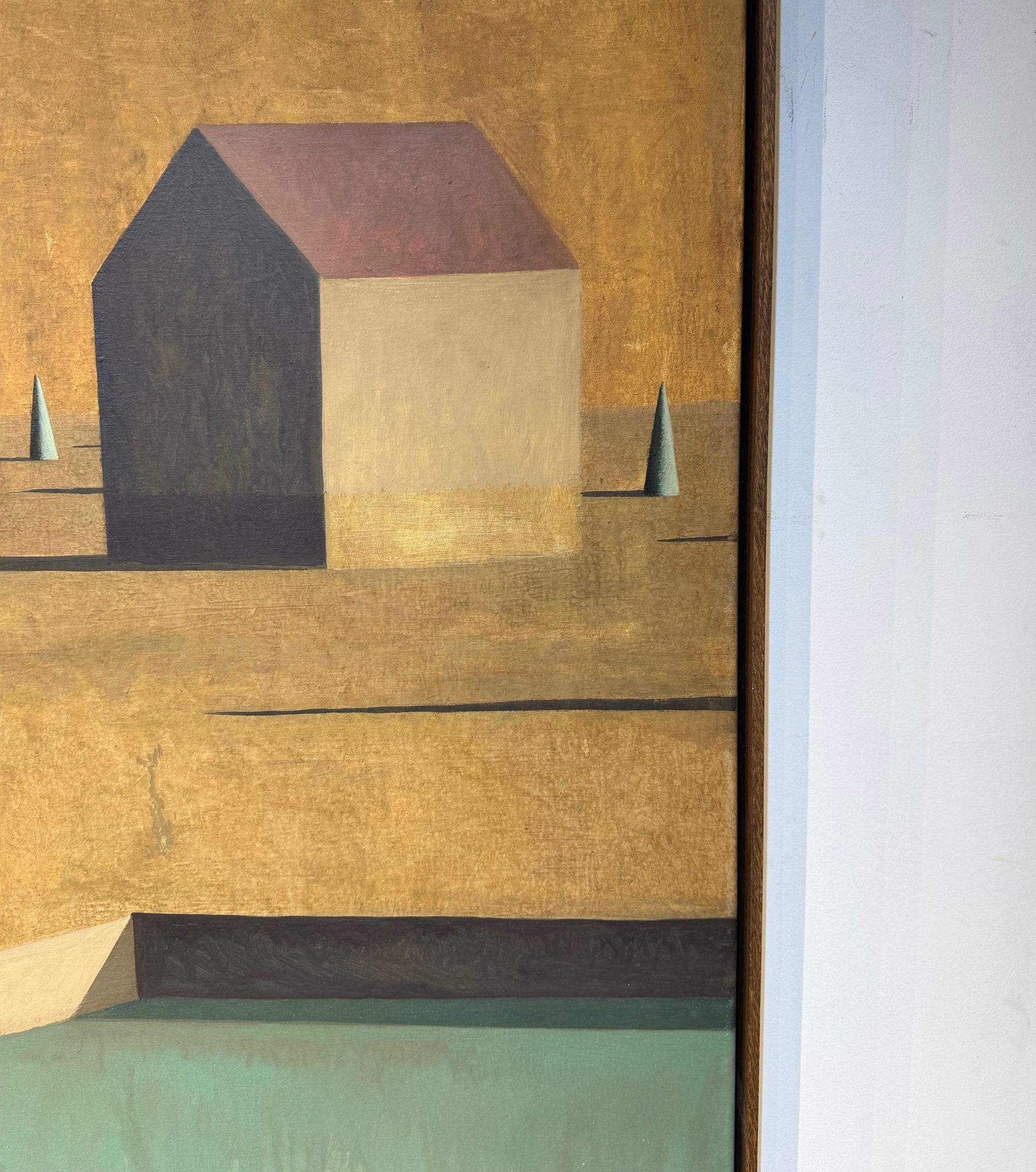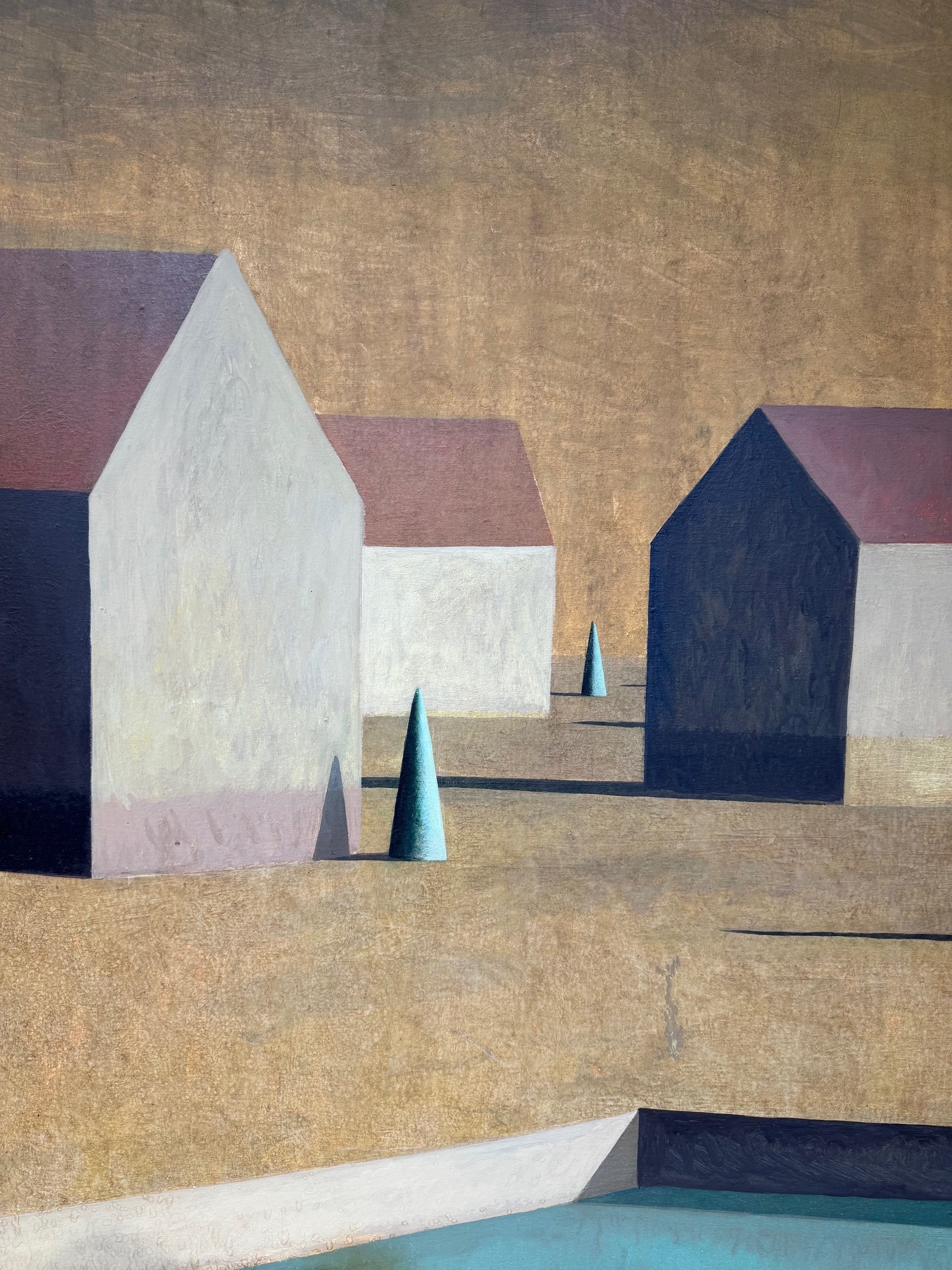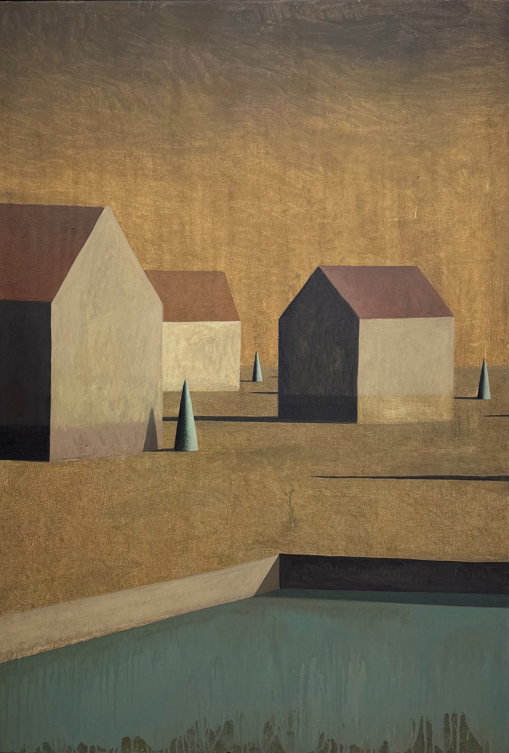 At its center stand three solid, minimalist structures—rectangular volumes that look like housesof a small village. Scattered around them, conical forms punctuate the scene like silent markers, adding rhythm and a hint of mystery to the composition. A brown sky reinforce the painting’s striking visual power and amplify the stillness of the scene. The interplay of light and shadow across the architectural forms heightens their theatrical presence. The composition create an environment where geometry, color, and silence converge to evoke contemplation and a sense of suspended time.