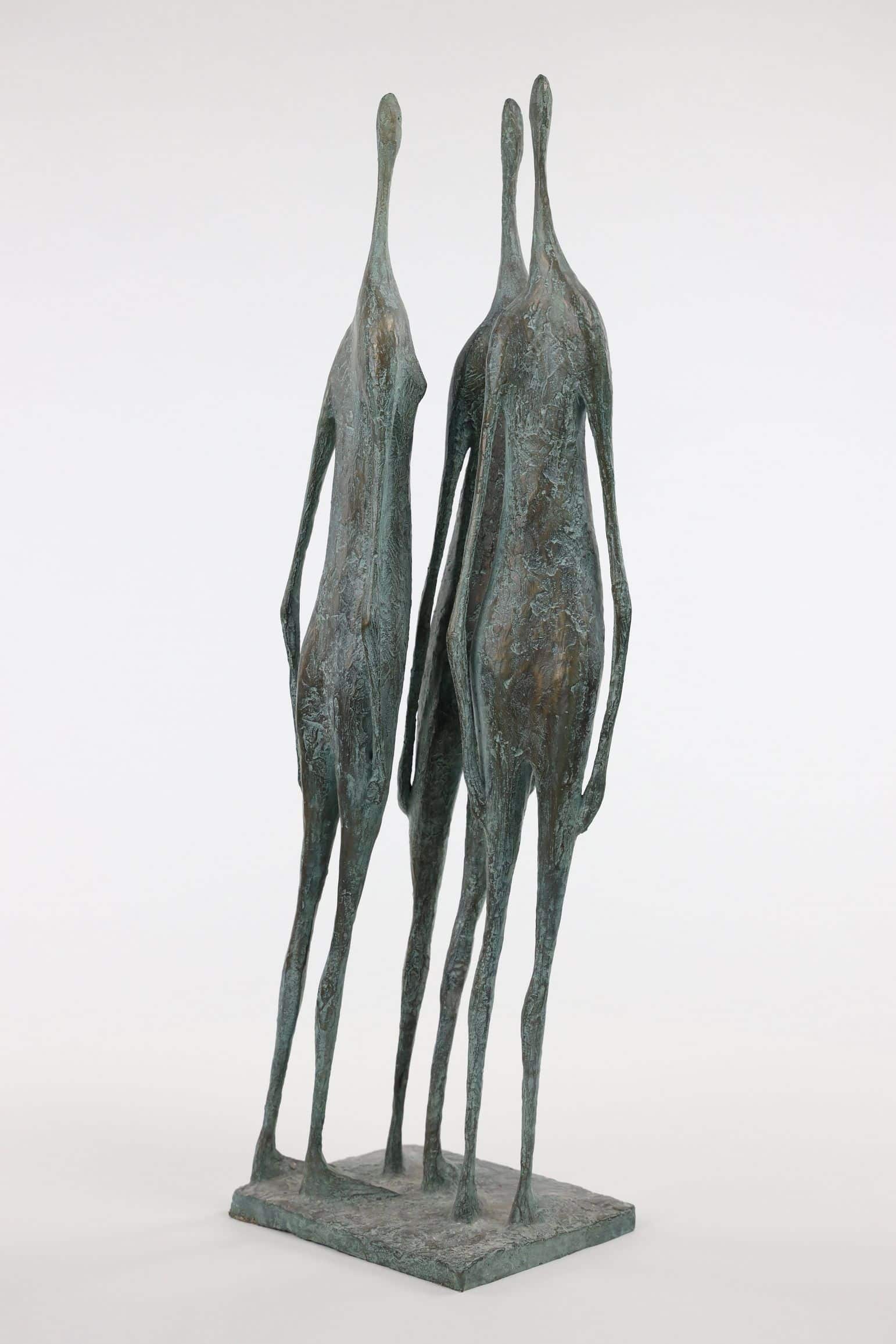 This figurative bronze sculpture depicts a group of three standing figures. They are arranged in quincunxes. The bodies of these statues are slender, their long, fragile limbs contrasting with their more massive torsos and pelvises. Finally, their heads, reduced to the essentials, rest on long, slender, tapering necks.