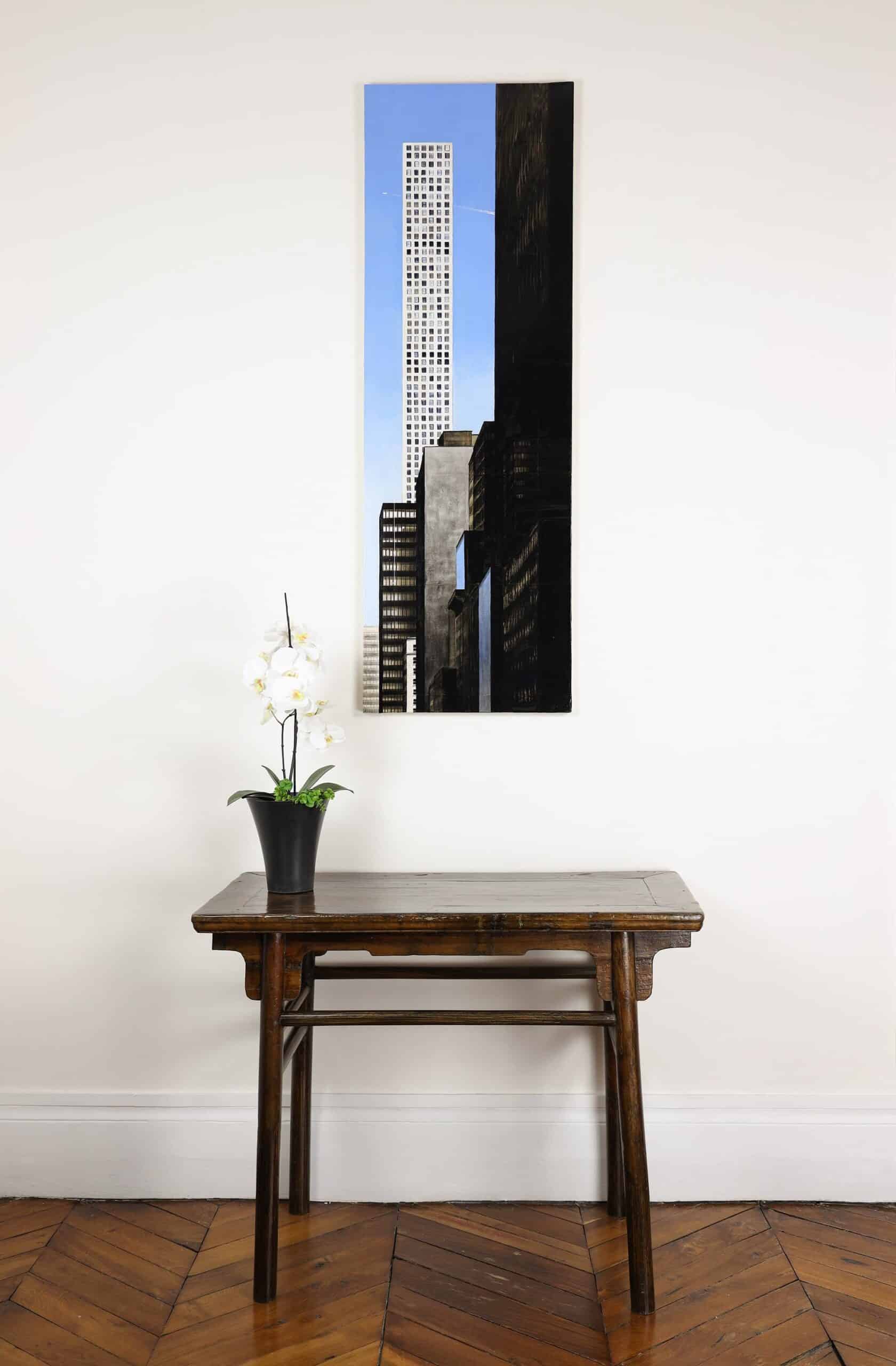 New York is one of Guillaume Chansarel’s major inspirations. The city, which graphic landscapes offer unlimited creative possibilities, is the object of the artist’s paintings. The painting 57th and Broadway represents one of the many buildings typical of this North American city, and offers a novel and very graphic depiction of a place that has already been portrayed so many times. This figurative picture brings to the fore the geometric, vertical and symmetrical harmony of the New York streets.