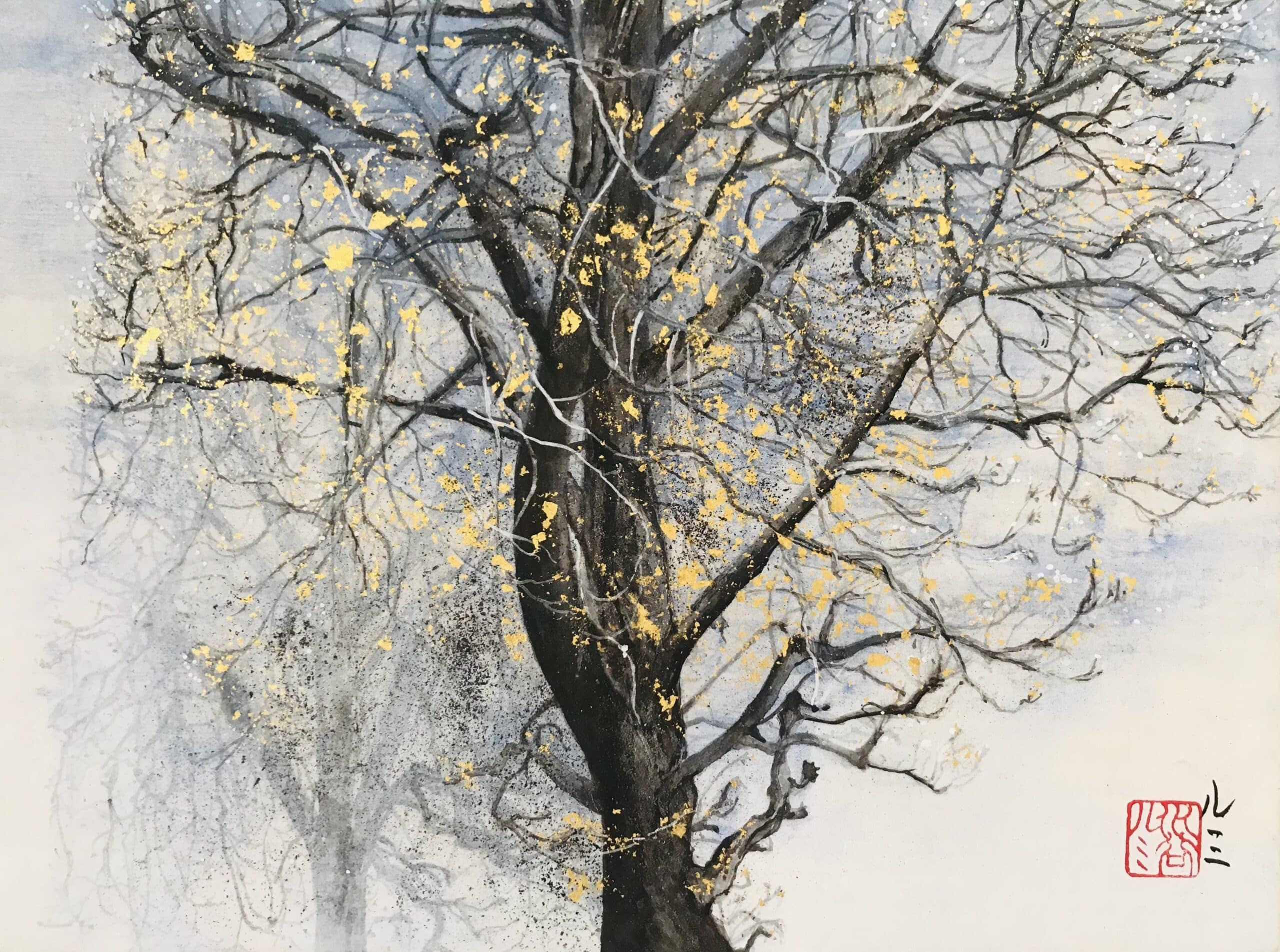 | Description | India ink, Japanese pigments, gold and black silver leaves on Japanese paper mounted on panel |