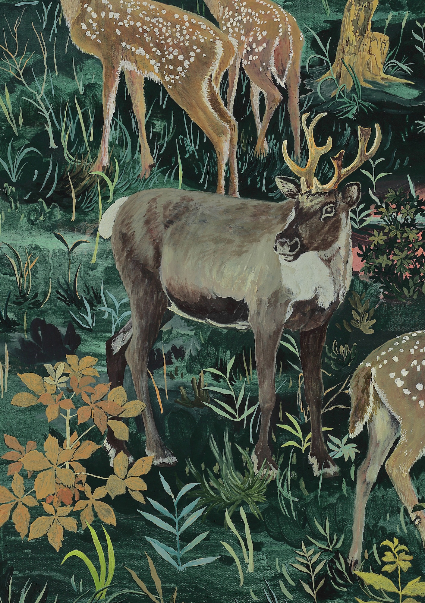 A Fortuitous Decline is an acrylic on canvas by the artist Rene Gonzalez representing a stag and three does accompanied by a fox in a lush forest.