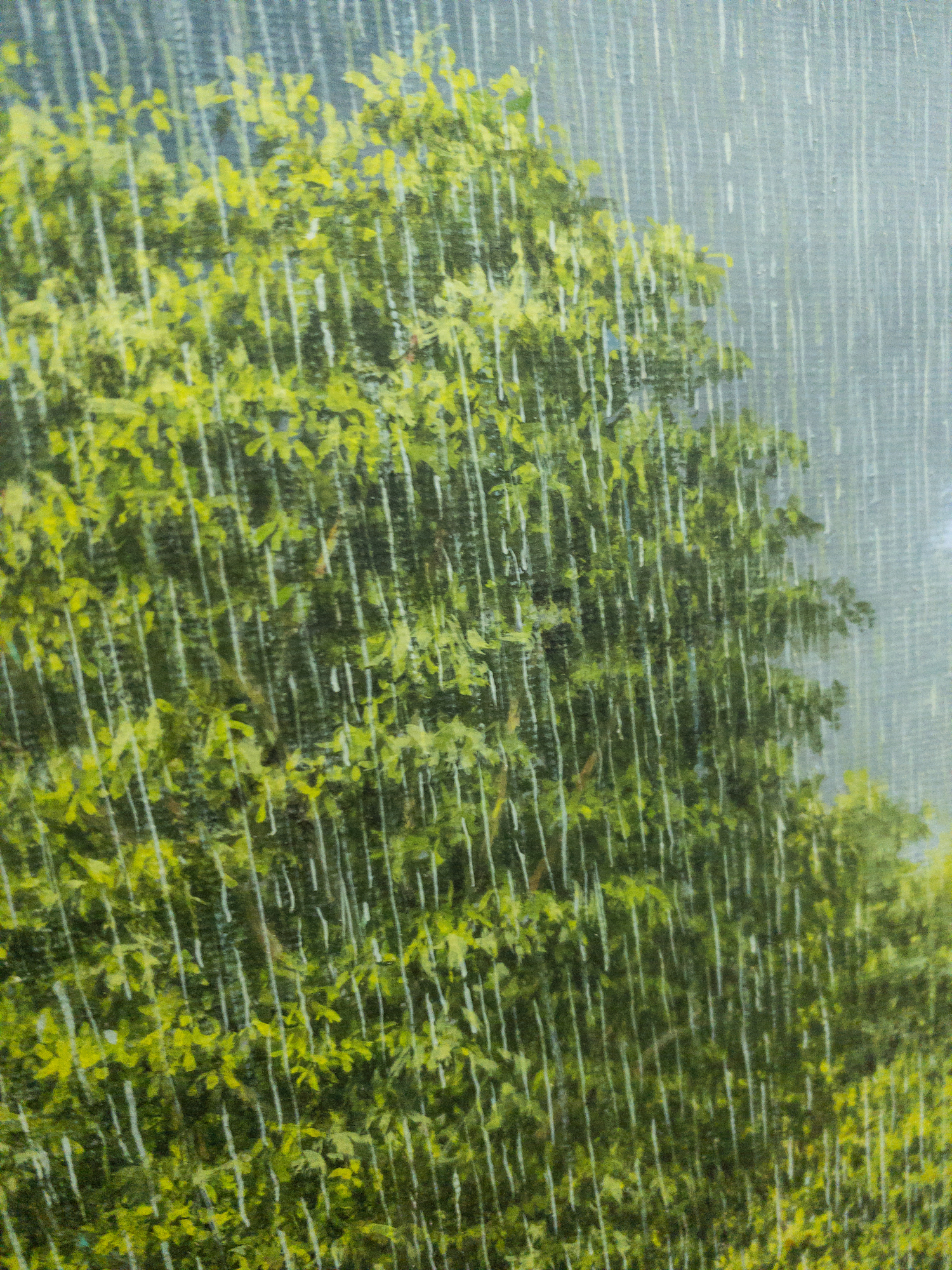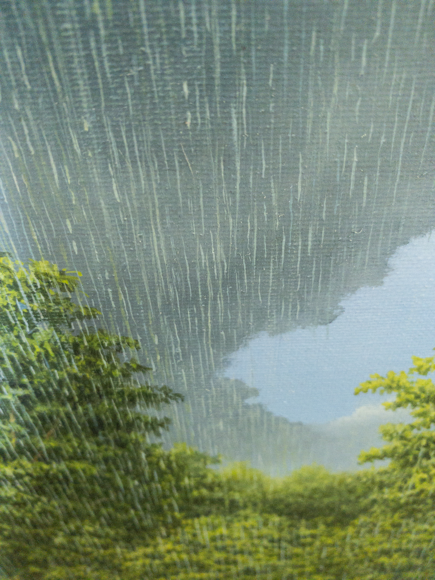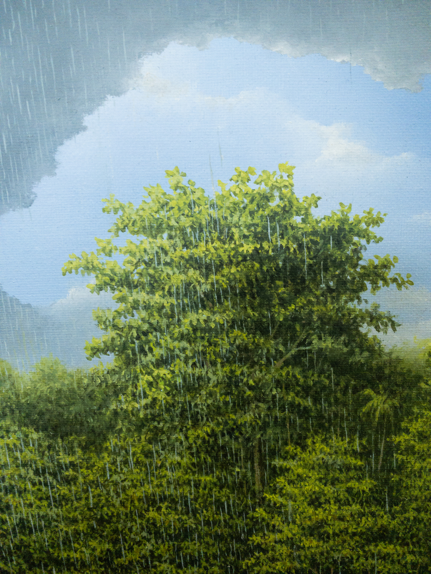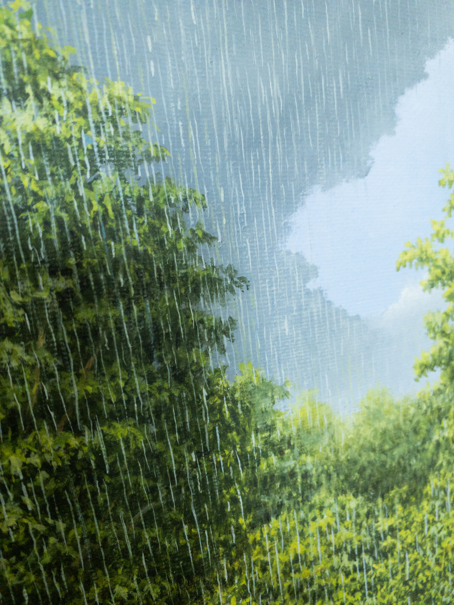 In this painting, the trees saturate the surface of the canvas, immersing the viewer in untouched nature. The sky above the vegetation is cloudy, lit up by a light source that pierces the clouds and gives depth to the landscape. Heavy rain is falling on the forest.