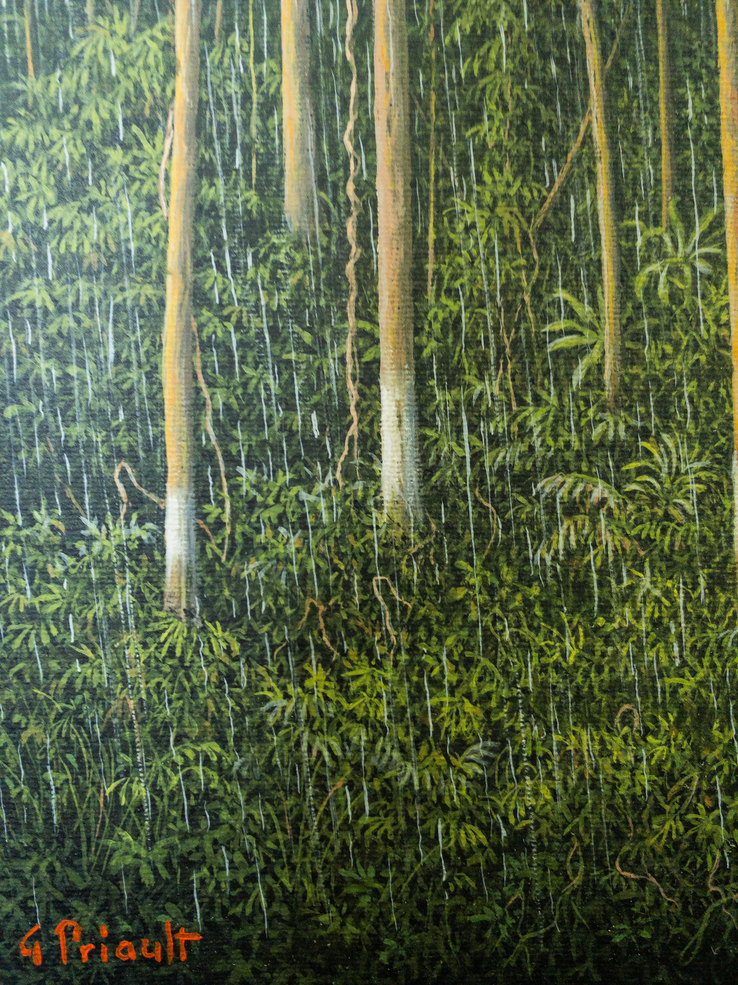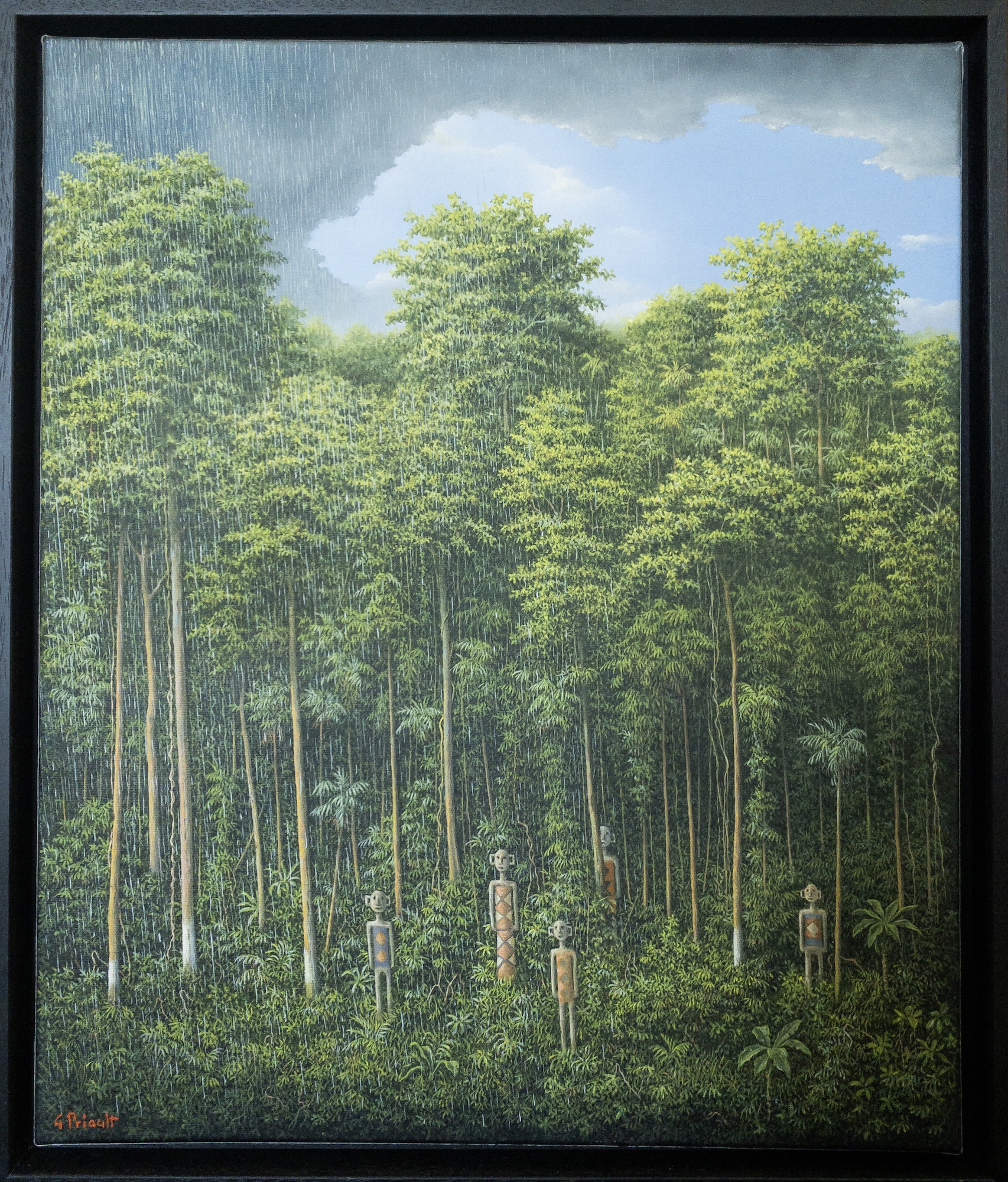 In Gérard Priault’s paintings, nature reigns supreme and the human figure is absent. The artist explains that introducing a figure would make the observer try to identify with them, even involuntarily. Instead, he wants the viewer to find their place in the painting: “I prefer the viewer to enter the jungle and enjoy listening, seeing and feeling. They are free to travel and wander through the painting”. The presence of people is sometimes suggested, as it is in this painting, by the presence of architectural remains of ancient civilisations: a totem pole, a temple, a pavilion, a statue… ‘signs’ that add mystery to the atmosphere evoked by the landscape.