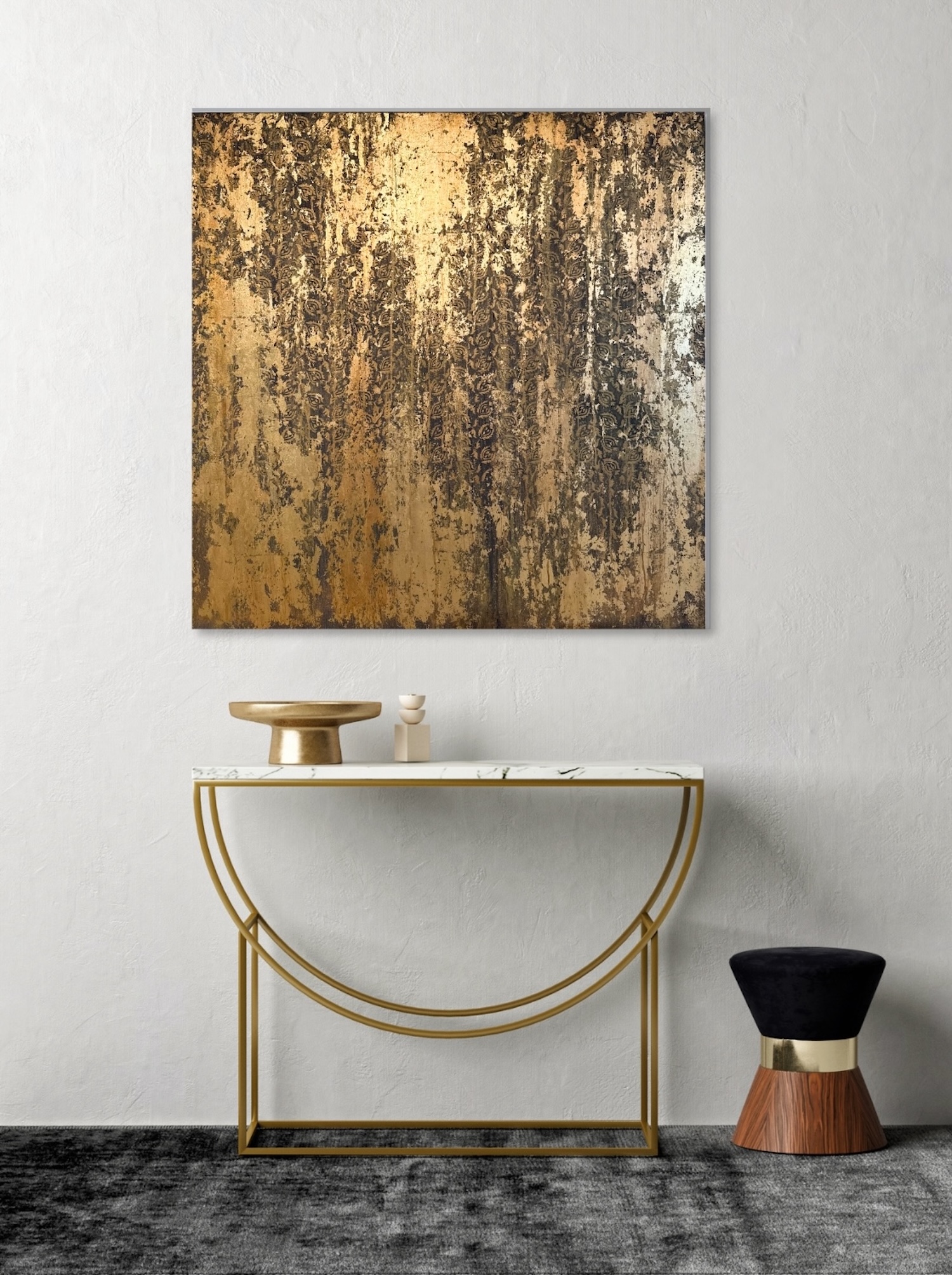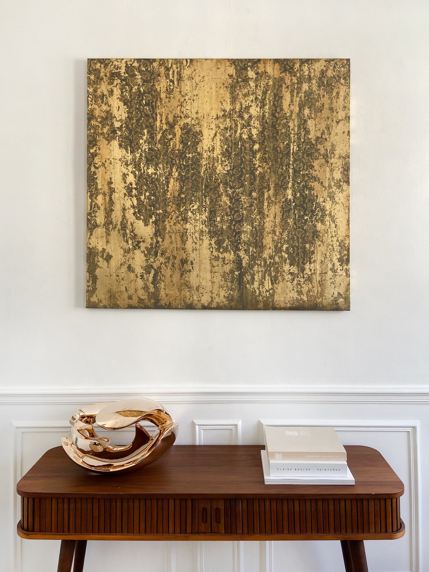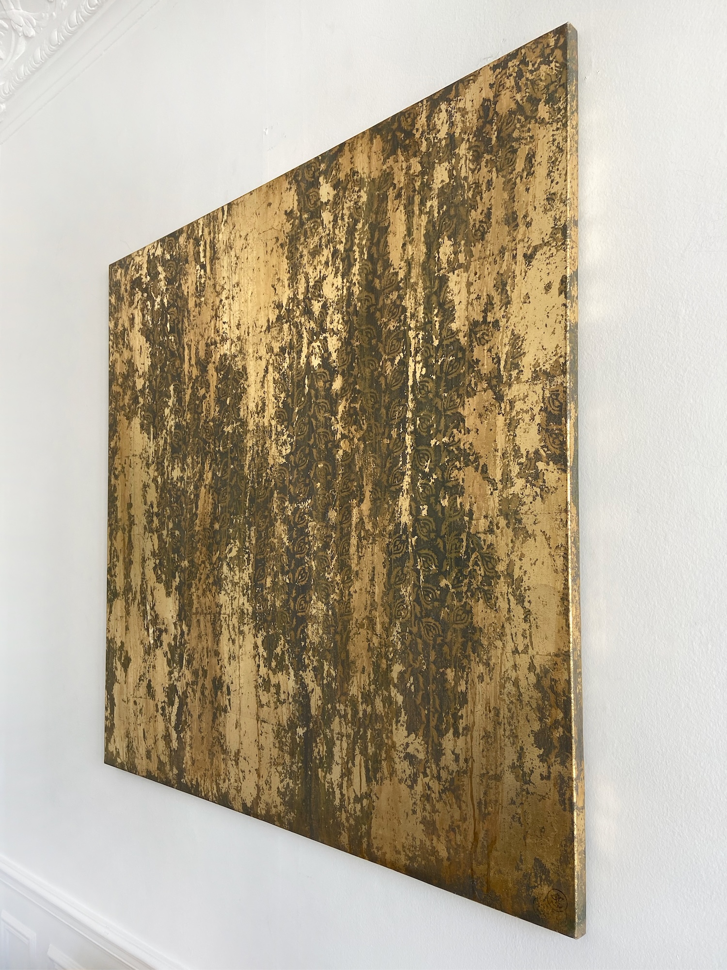 His canvases, born of a technique that is both intuitive and masterful, open up a contemplative universe bathed in light. Through the use of metallic powders and metal leaf, the artist creates shifting reflections on the surfaces of his paintings, while contrasting tones and textures lend his compositions a vibrant depth and a subtle sense of movement.
