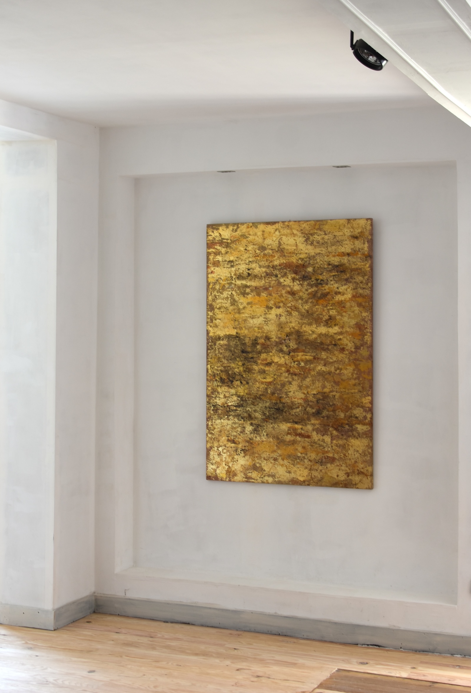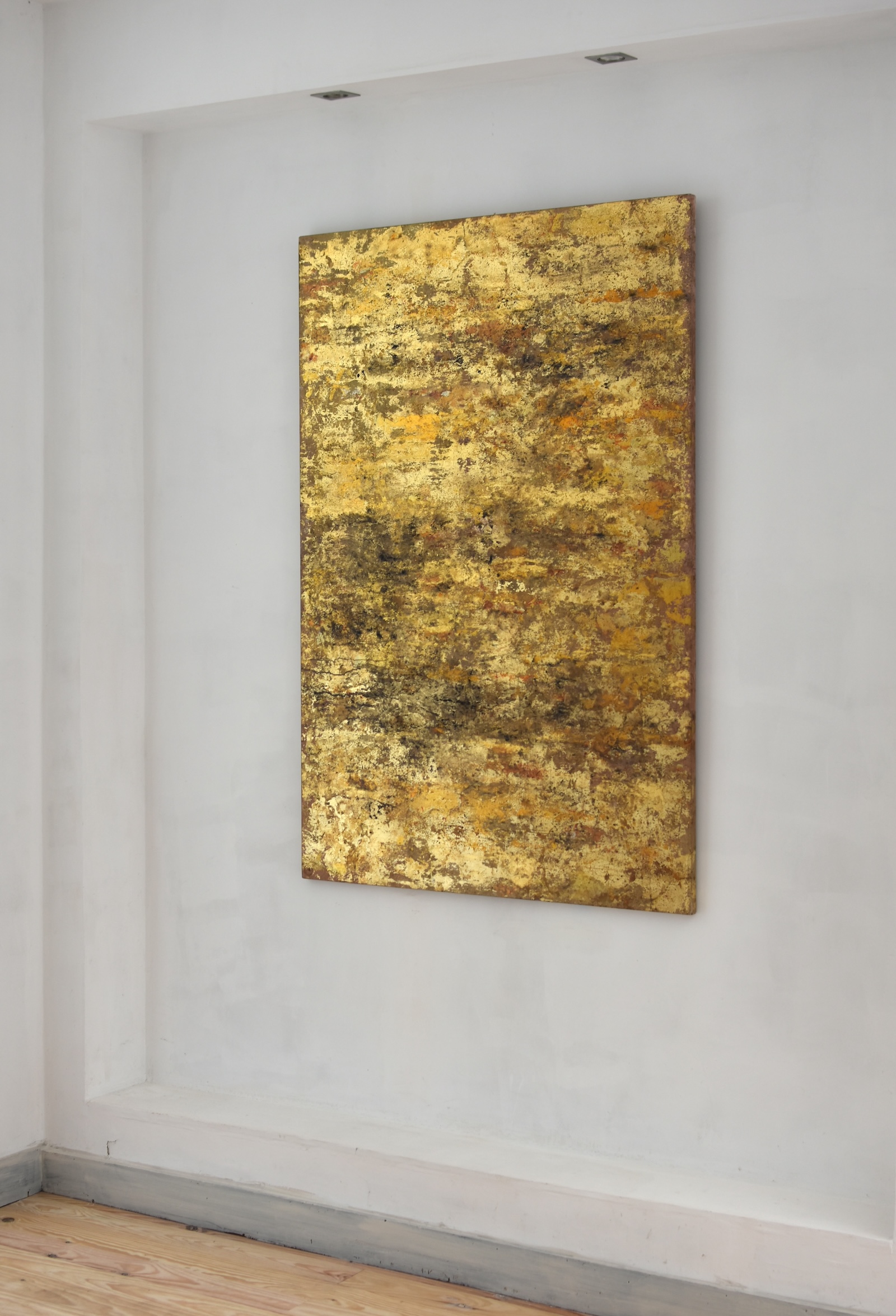 His canvases, born of a technique that is both intuitive and masterful, open up a contemplative universe bathed in light. Through the use of metallic powders and metal leaf, the artist creates shifting reflections on the surfaces of his paintings, while contrasting tones and textures lend his compositions a vibrant depth and a subtle sense of movement.