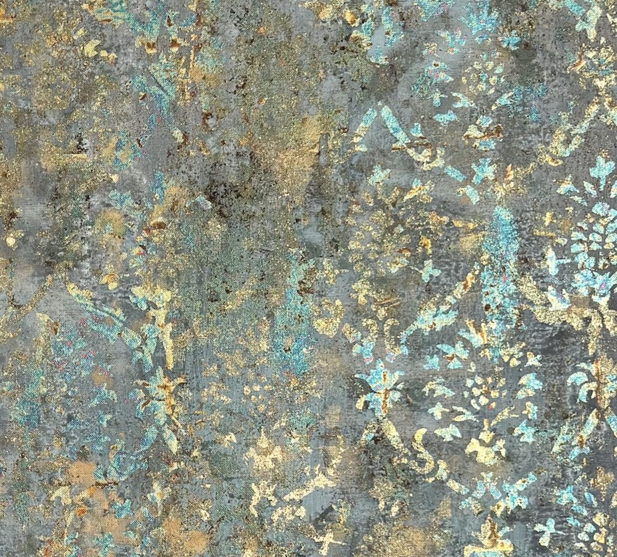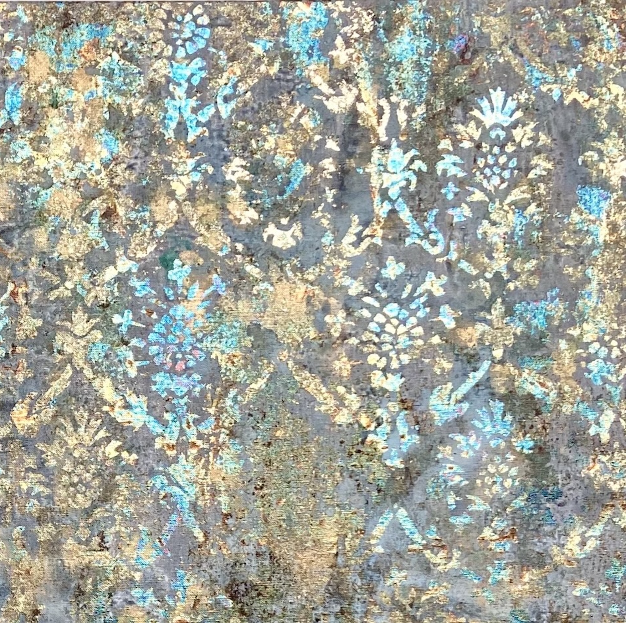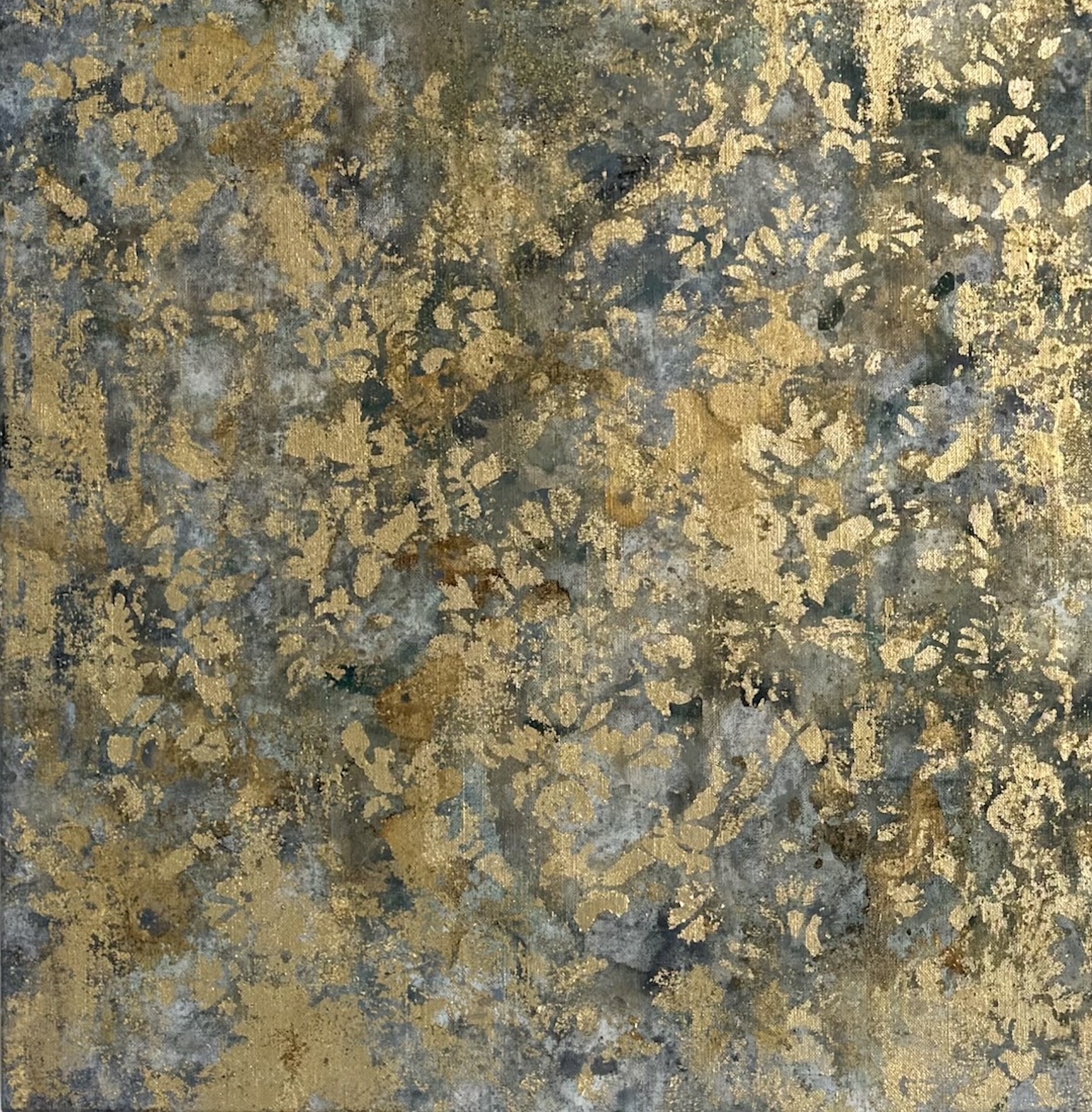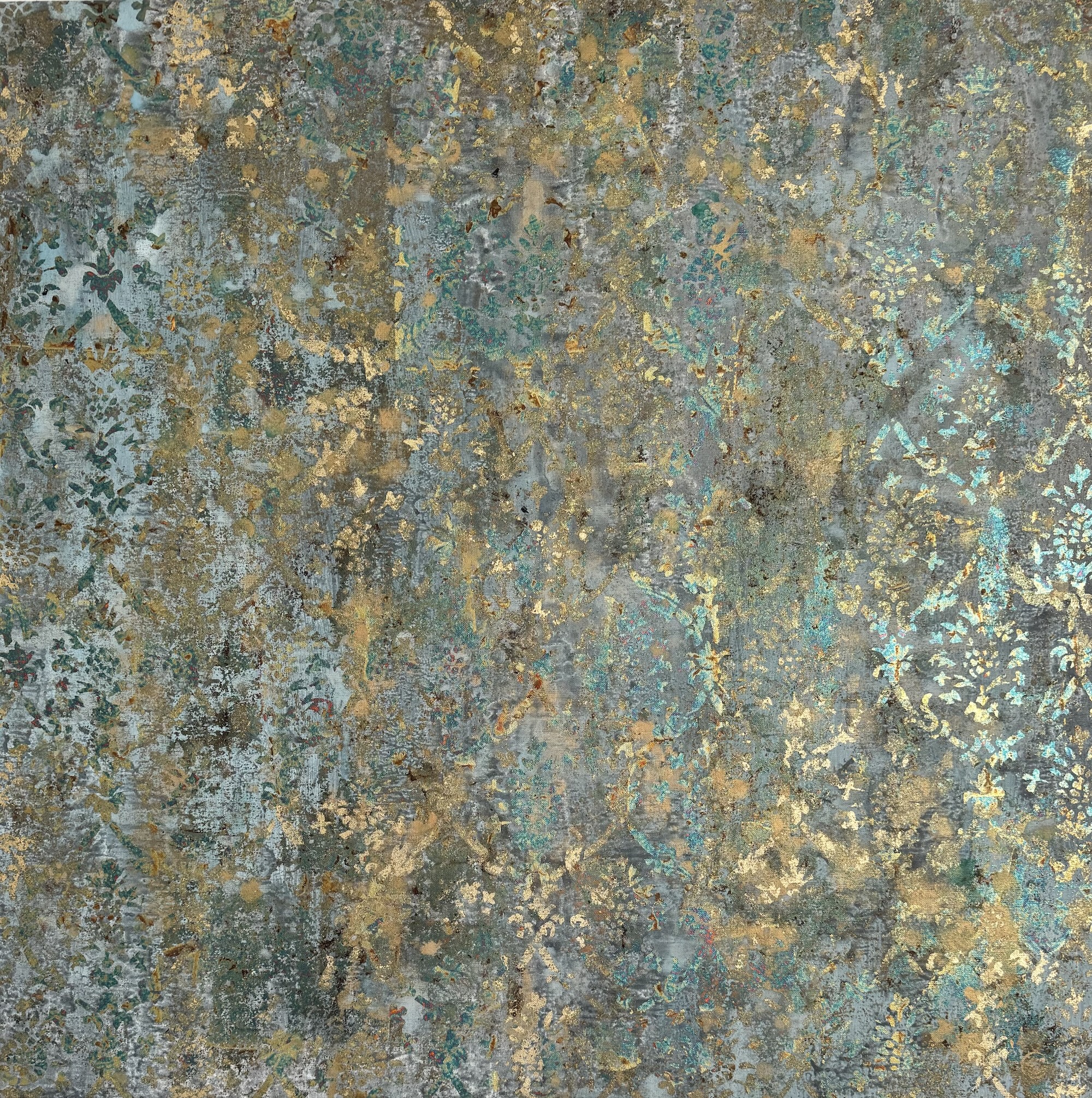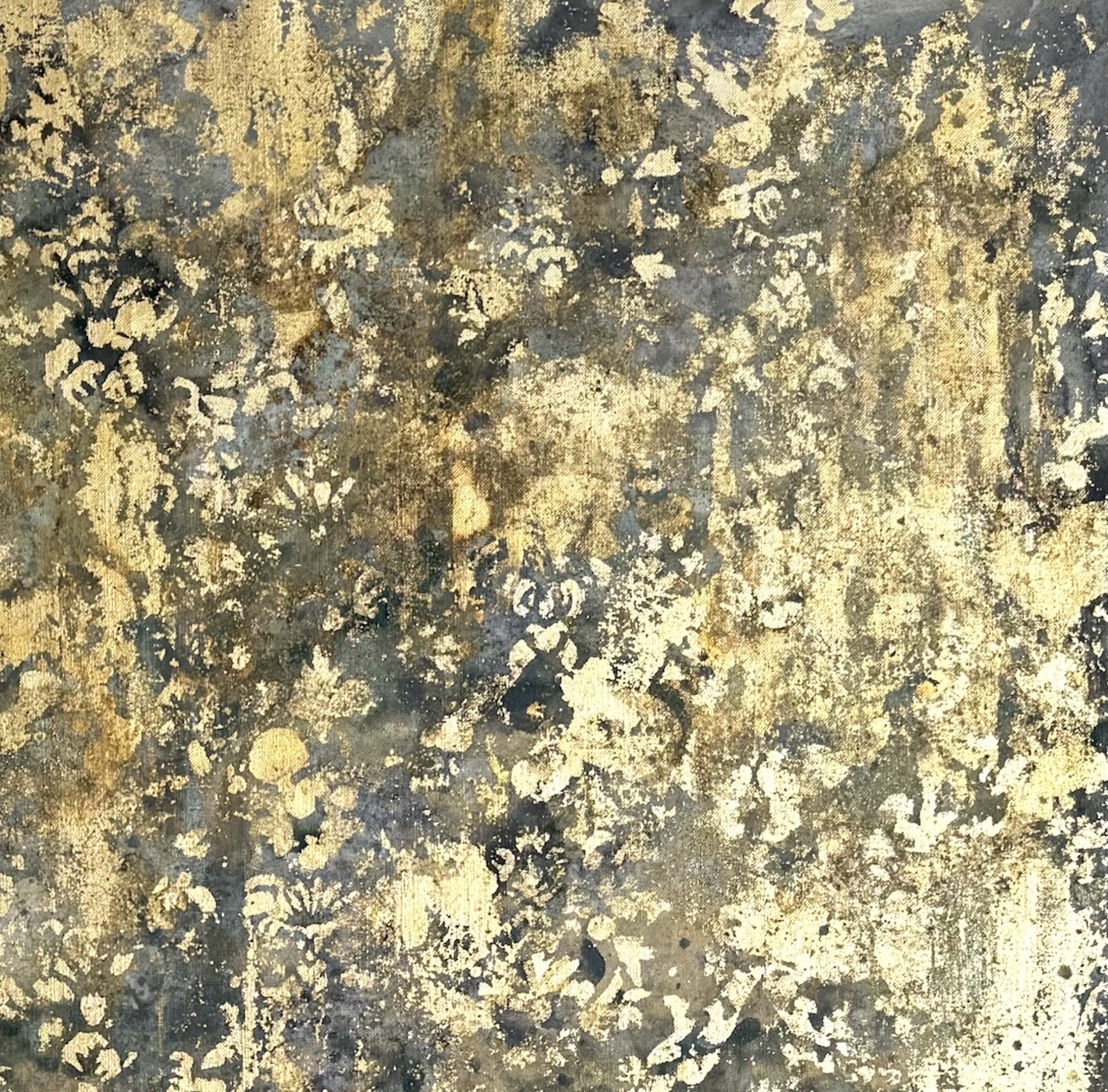 Description: Mixed media on linen canvas (pigments, binders, glues, powders, and various metal foils)