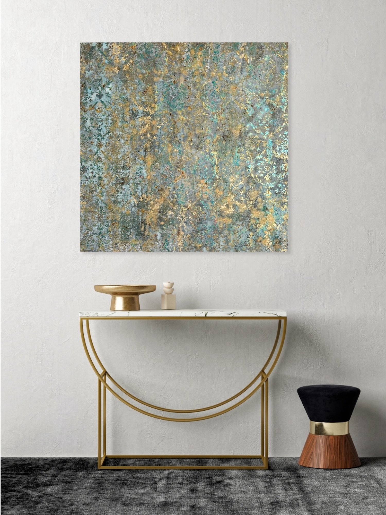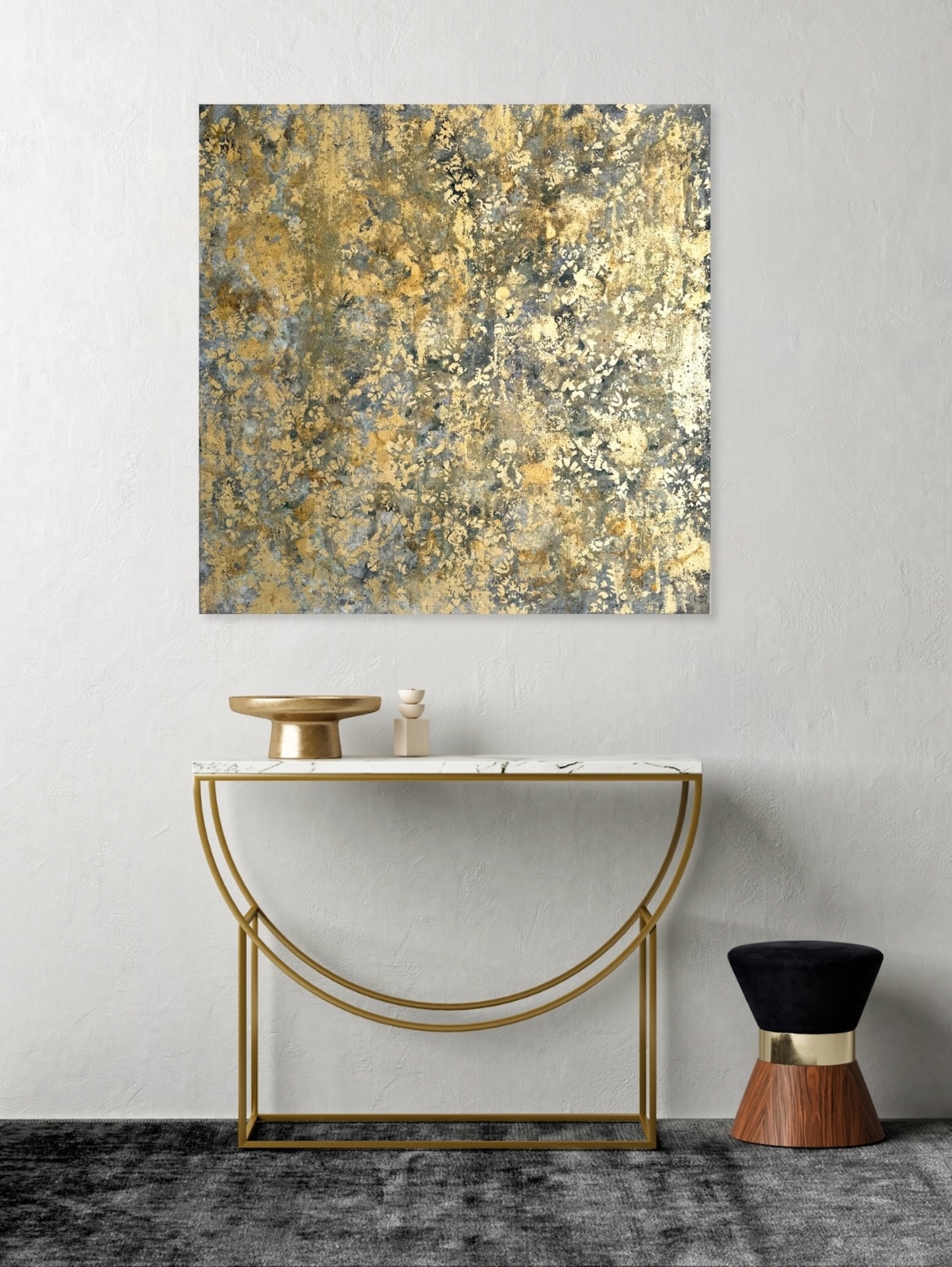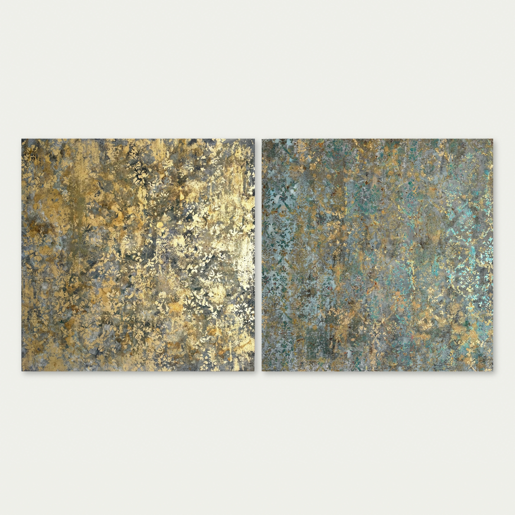 Abstraction 100-299 24 4 & Abstraction 100-298 24 is a set of two artworks by French artist Nicolas Galtier, each of them measuring 100 x 100 cm. The artist uses a mixed technique combining pigments, binders, glues and various metal powders and sheets. The composition is based on a colour palette cantered on shades of gold, turquoise and grey.