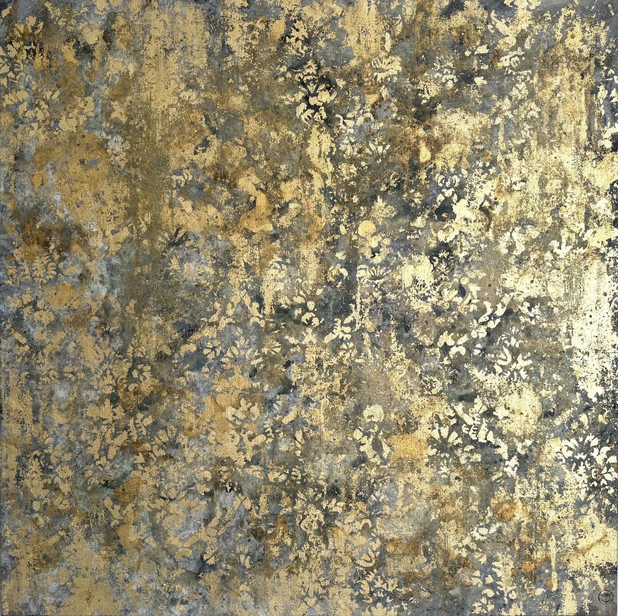 His canvases, born of a technique that is both intuitive and masterful, open up a contemplative universe bathed in light. Through the use of metallic powders and metal leaf, the artist creates shifting reflections on the surfaces of his paintings, while contrasting tones and textures lend his compositions a vibrant depth and a subtle sense of movement.