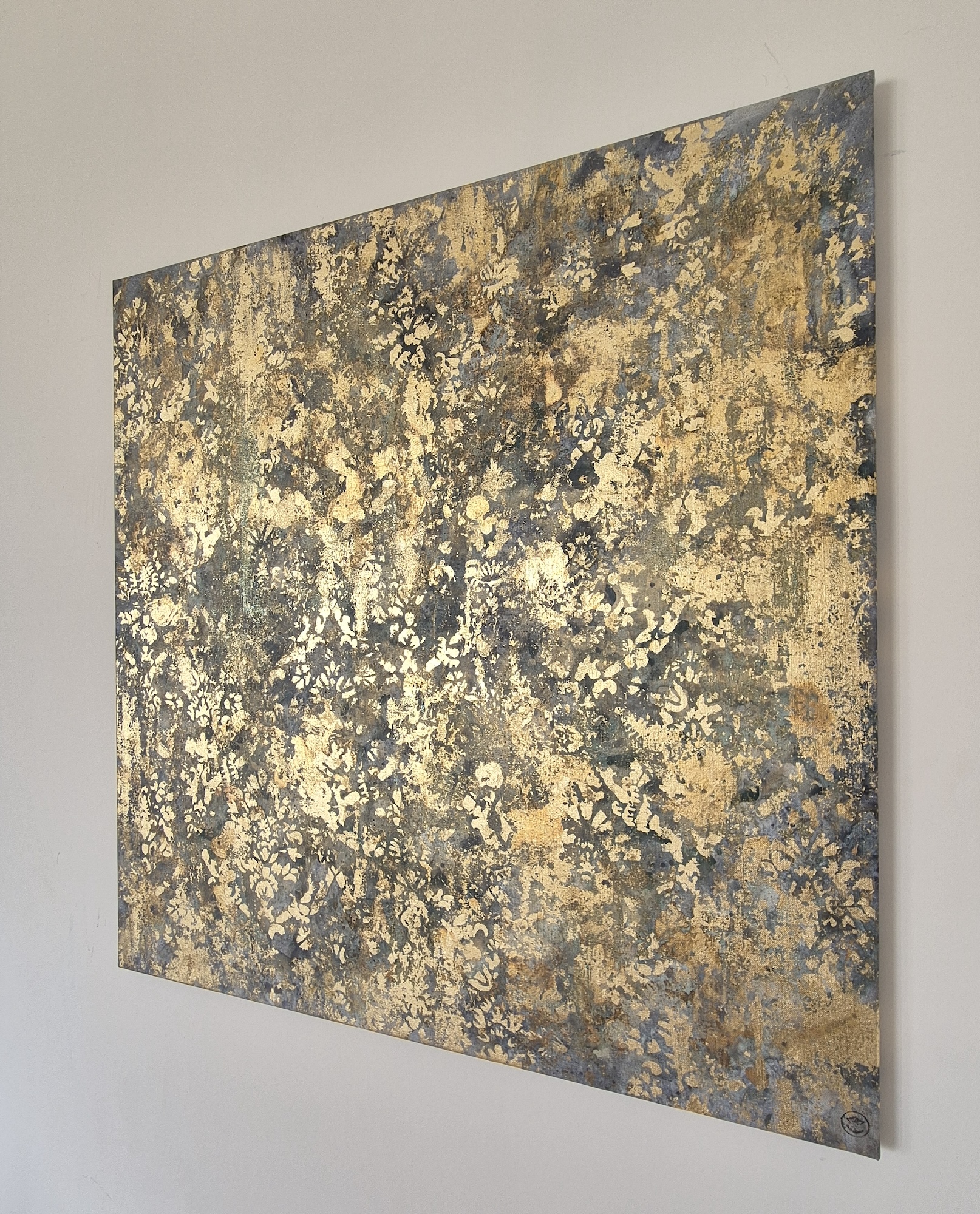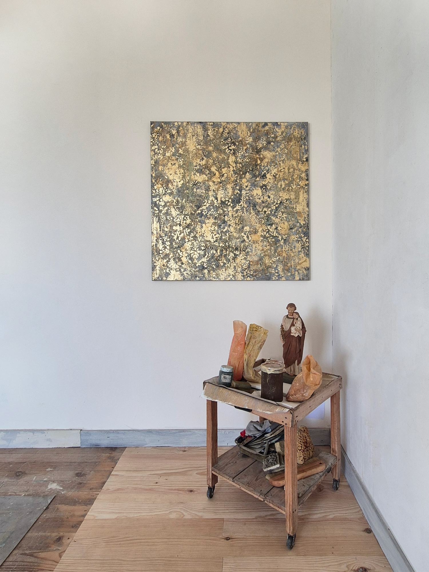 His canvases, born of a technique that is both intuitive and masterful, open up a contemplative universe bathed in light. Through the use of metallic powders and metal leaf, the artist creates shifting reflections on the surfaces of his paintings, while contrasting tones and textures lend his compositions a vibrant depth and a subtle sense of movement.