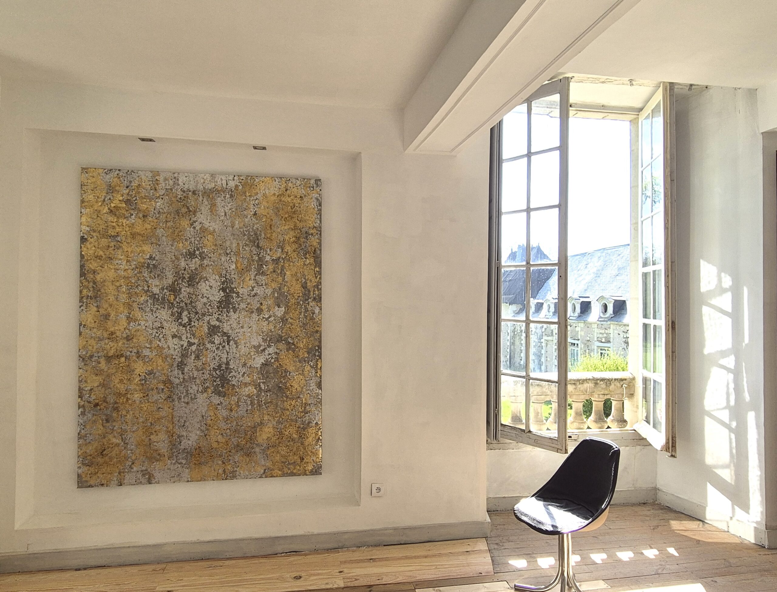 His canvases, born of a technique that is both intuitive and masterful, open up a contemplative universe bathed in light. Through the use of metallic powders and metal leaf, the artist creates shifting reflections on the surfaces of his paintings, while contrasting tones and textures lend his compositions a vibrant depth and a subtle sense of movement.