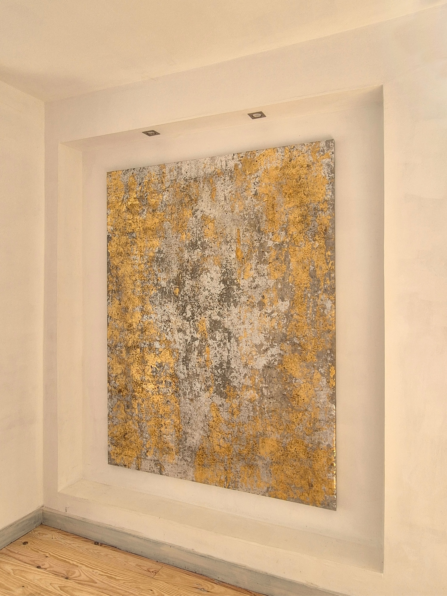 Abstraction 150.200-2 13 A is a painting by French artist Nicolas Galtier. The artist uses a mixed technique combining pigments, binders, glues and various metal powders and sheets. The composition is based on a colour palette cantered on shades of gold and silver.