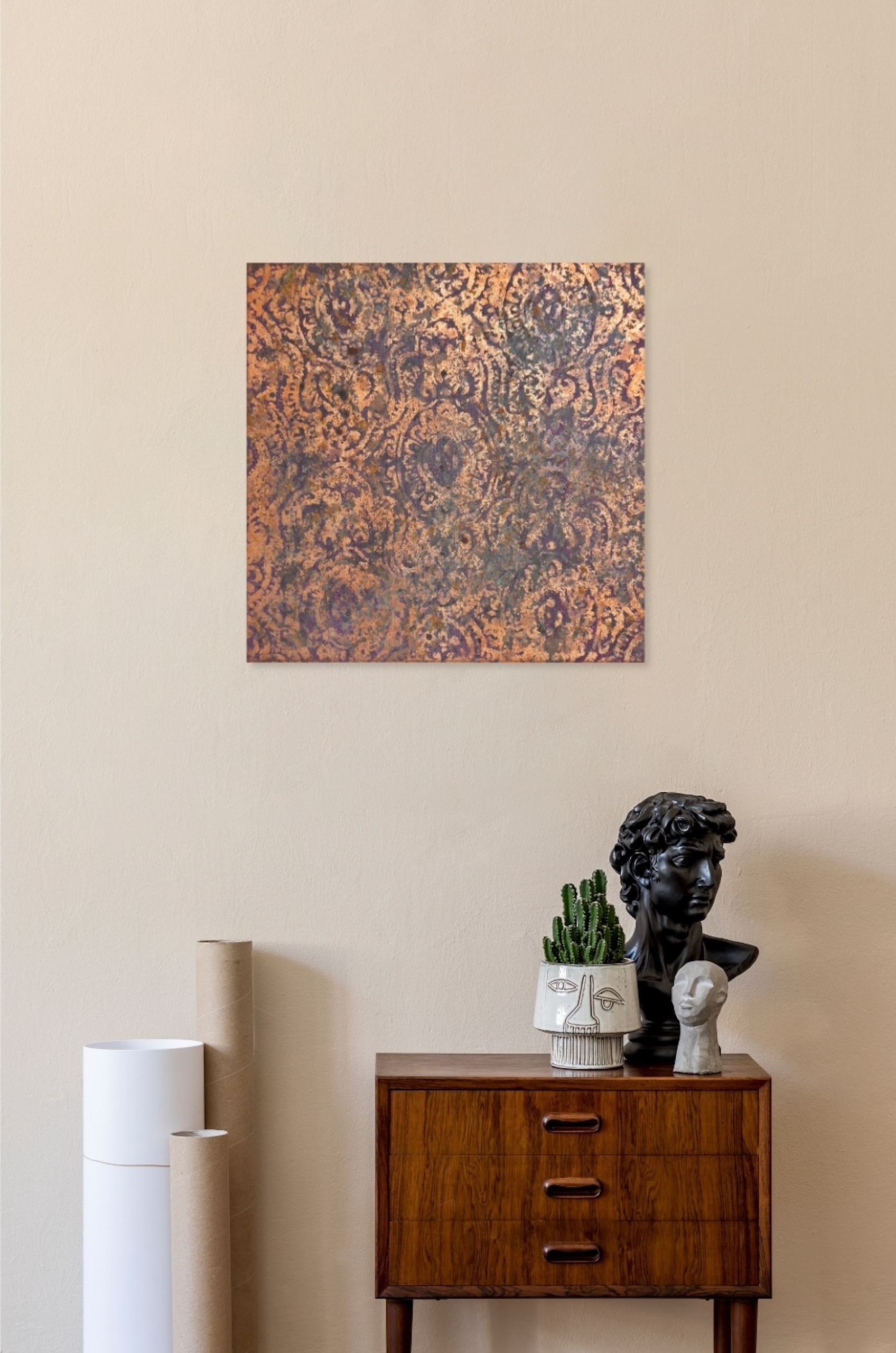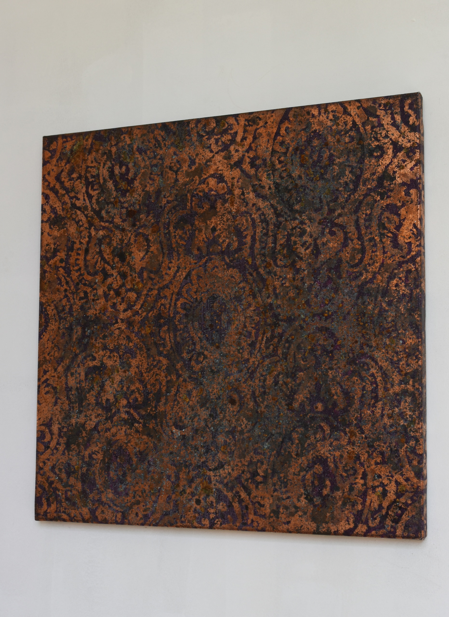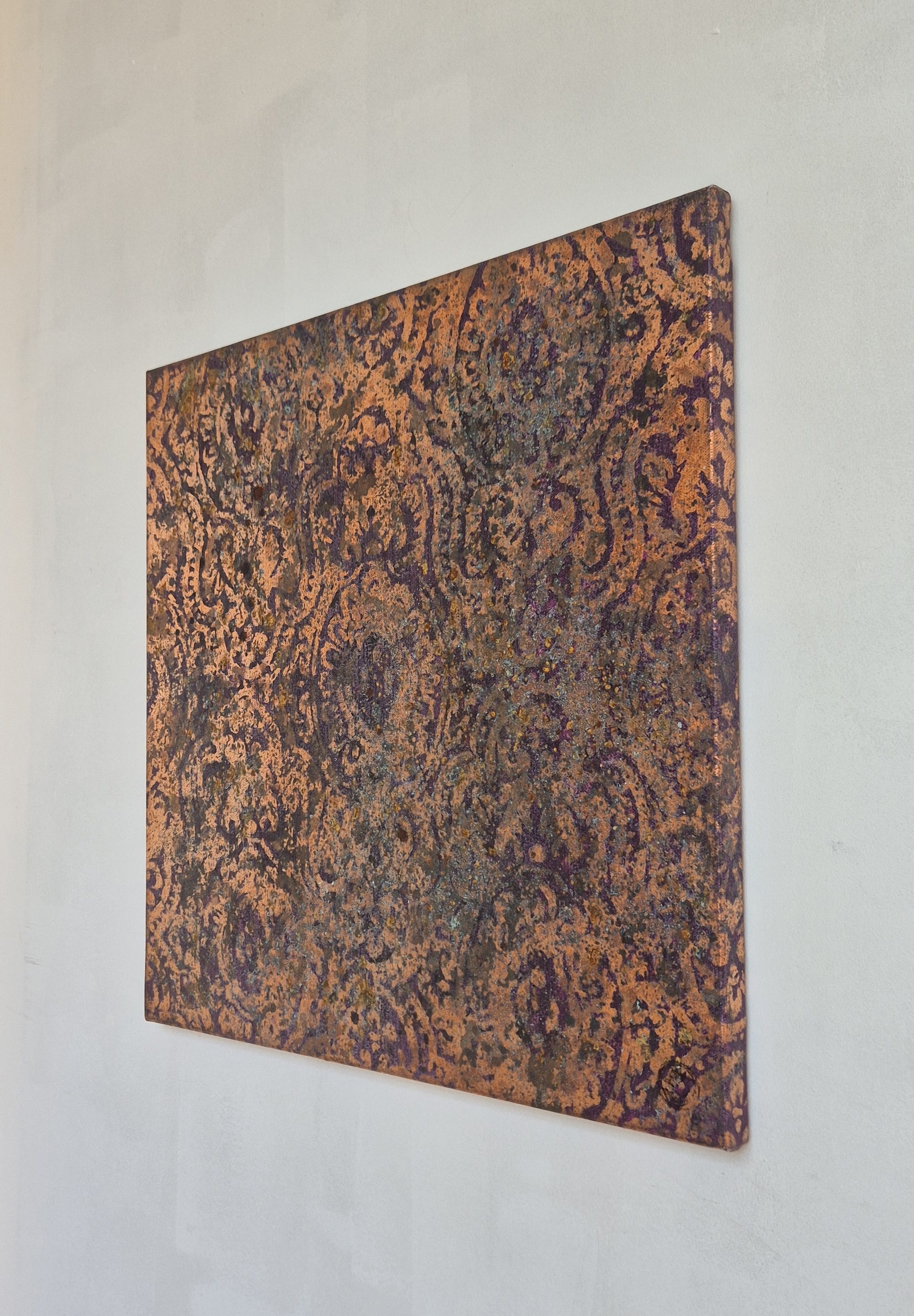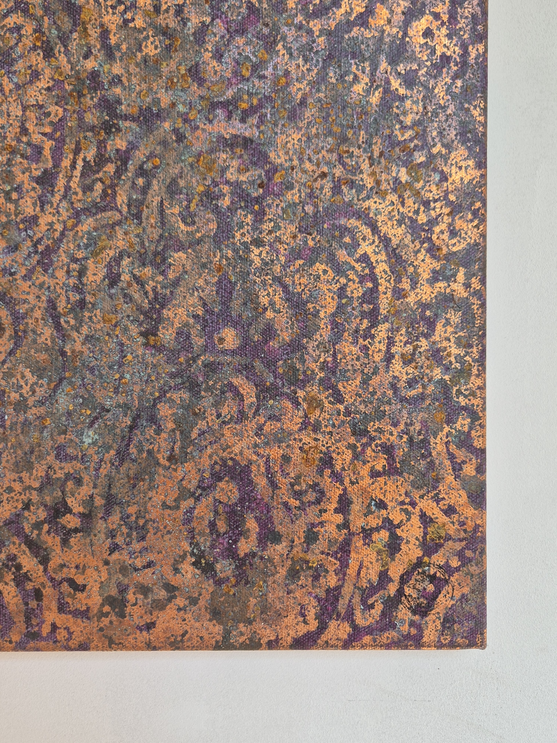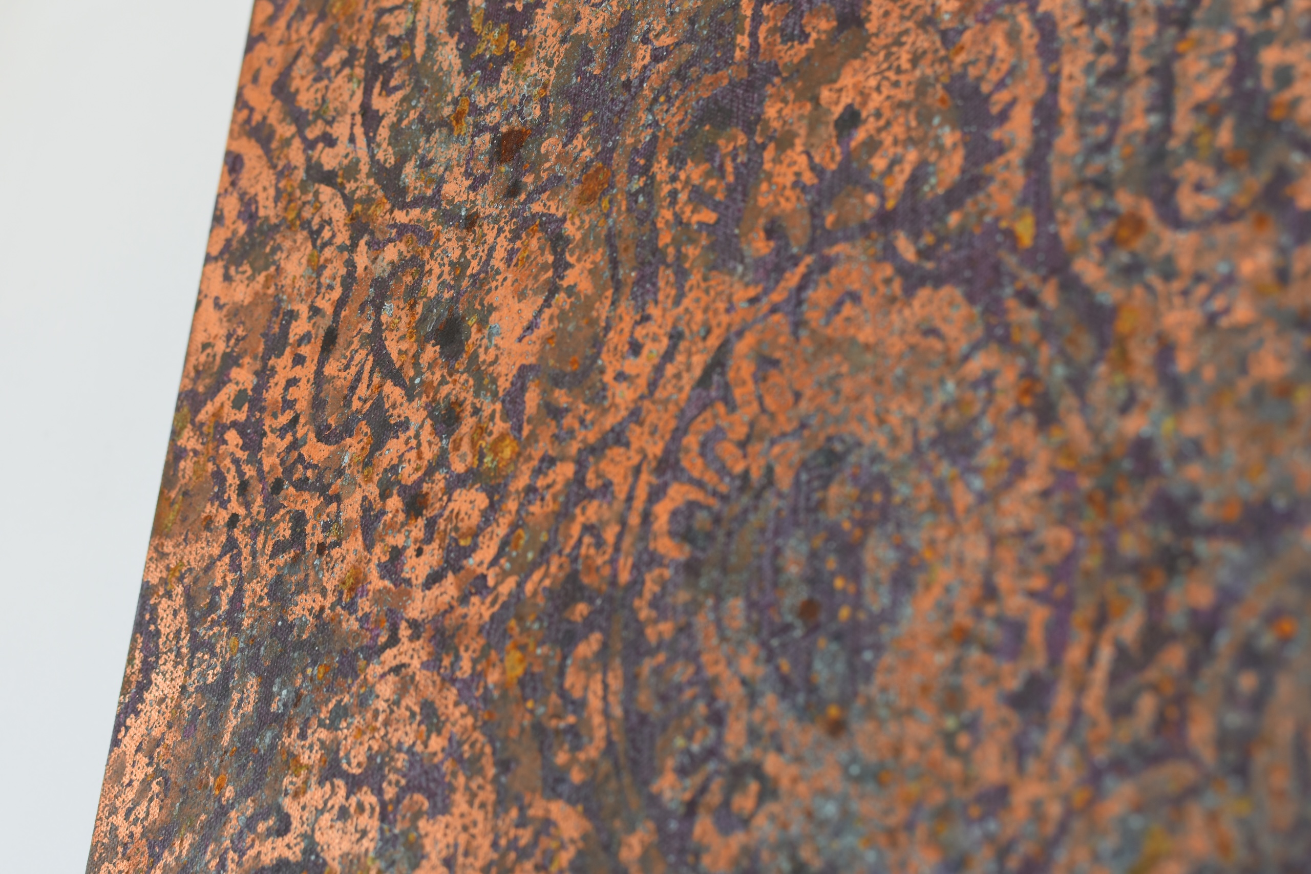 Abstraction 50-156 13 is a painting by French artist Nicolas Galtier. The artist uses a mixed technique combining pigments, binders, glues and various metal powders and sheets. The composition centres on a copper color palette with darker, contoured motifs.