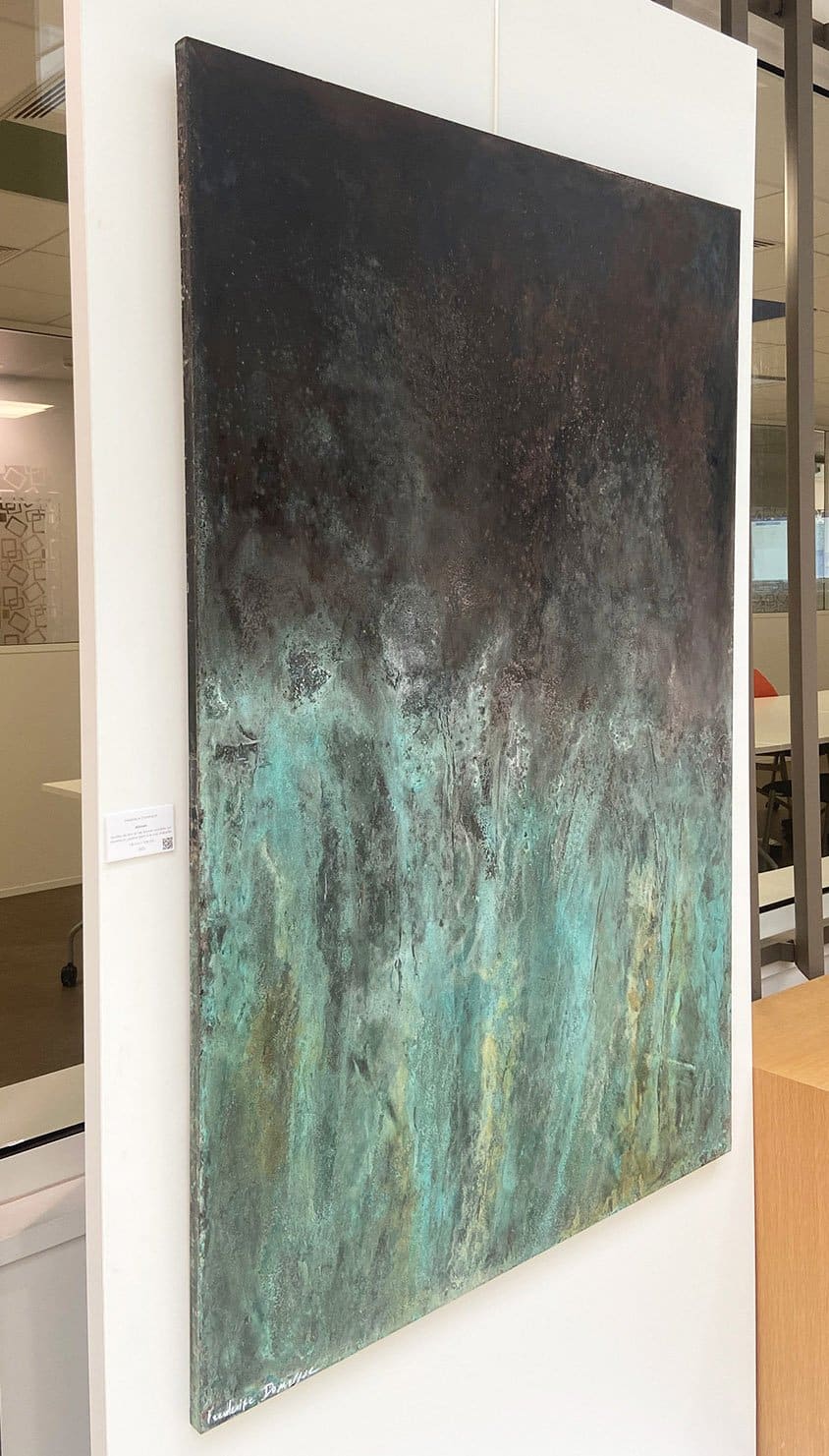 If Frédérique Domergue’s paintings are abstract, the theme of the sea appears in many of her artworks. The title suggests the depths of the ocean where light cannot reach, as well as the intense blue colour contrasting with the dark colours in the top part of the painting.