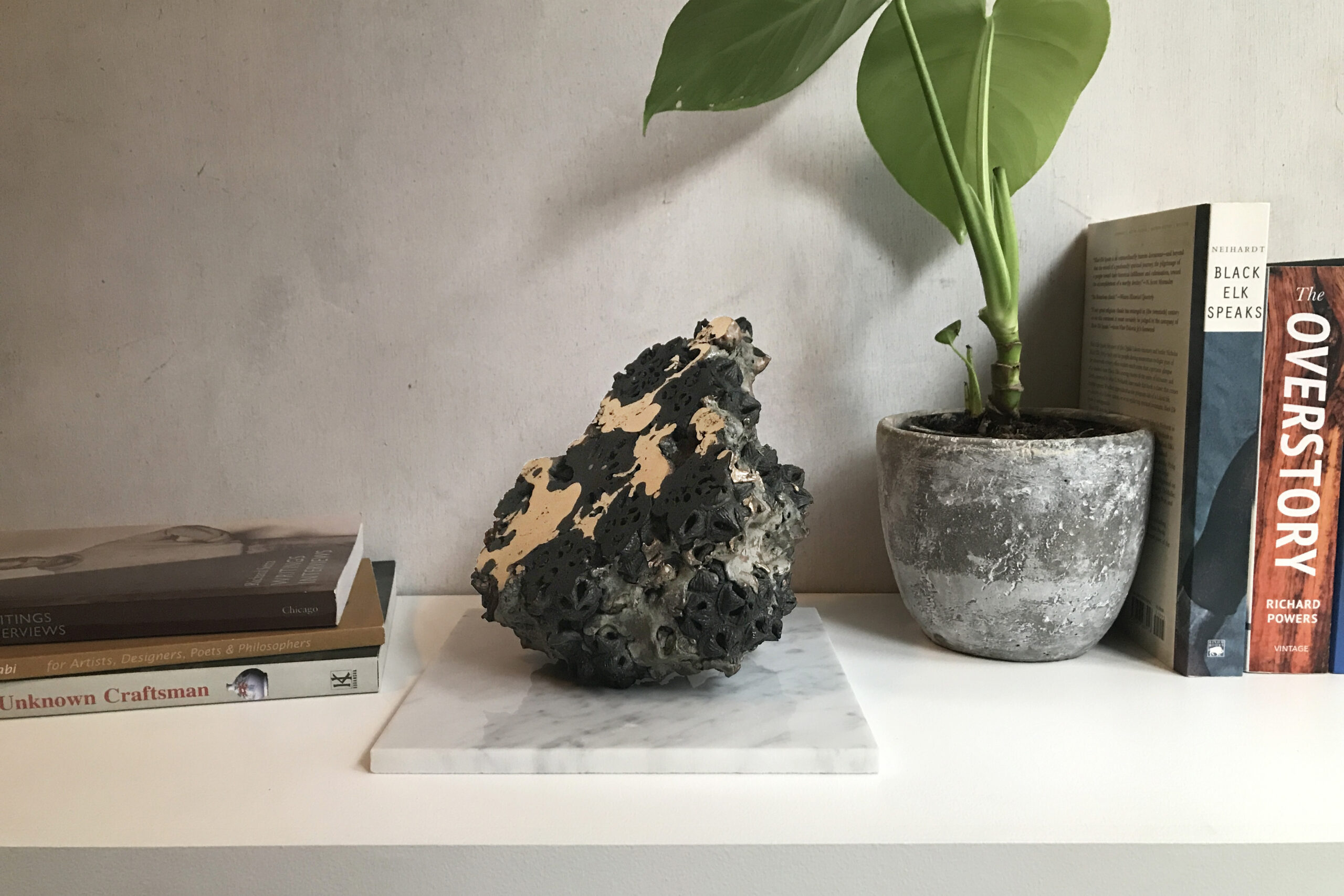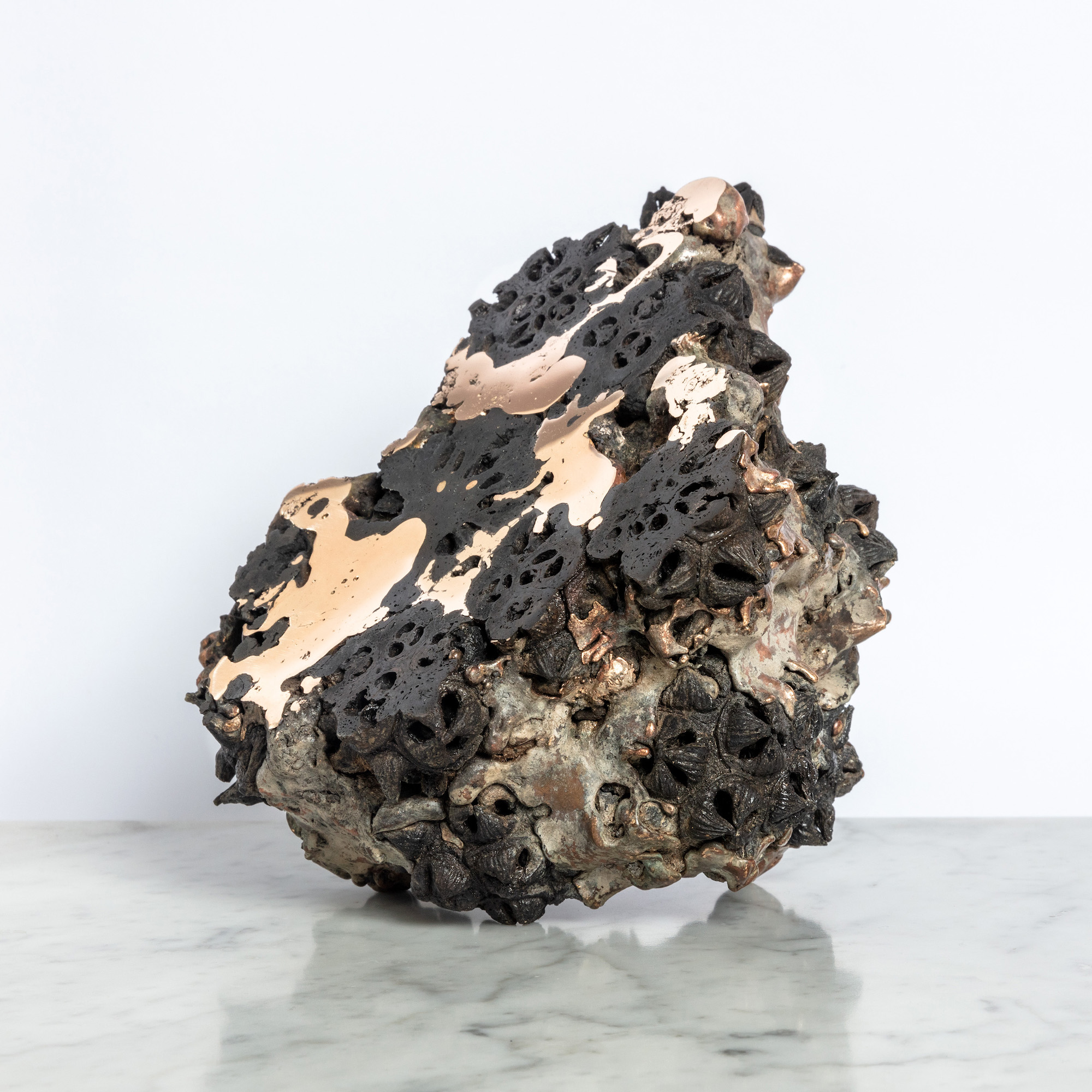 In the “Achondrites” series, Oliver Ashworth-Martin explores the contrast between the organic and the inorganic, a central theme in his work. In this case, the contrast is between carbon and metal. The sculptor uses plant seedpods (for example: eucalyptus pods). Metal is then poured over the seedpods, transforming them into pure carbon. The plant pods are encased in a solid metal matrix which is then cut into revealing a unique contrast between the two materials.