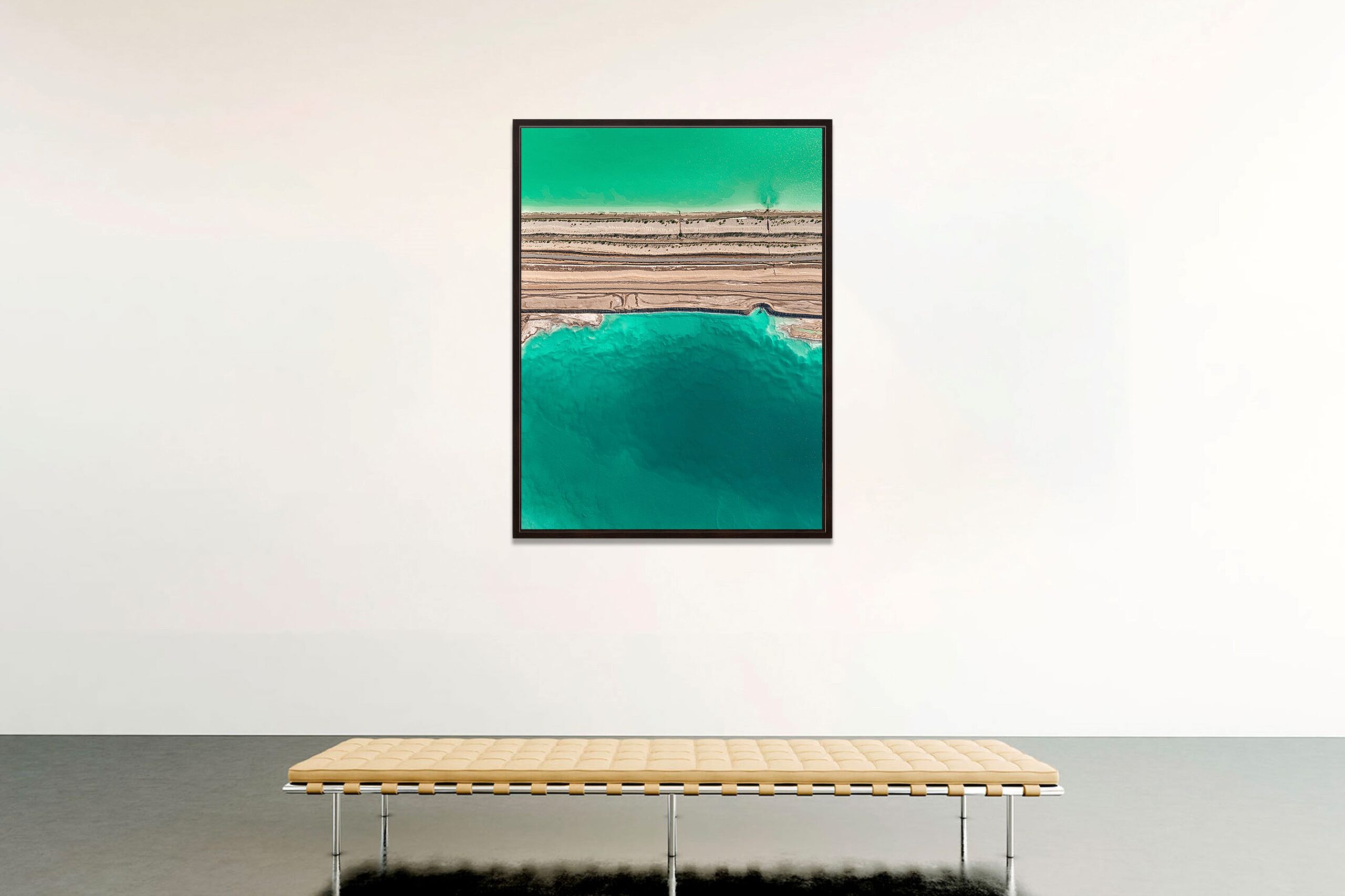 The eye is immediately seduced by these turquoise waters, evocative of paradisiacal places often synonymous with exoticism. These blue and green colors are contrasted with brownish darker colors. Here, the forms that emerge from the mix of colors create a composition which, visible from the sky, is at the center of Bernhard Lang’s work as it tends towards abstraction.
