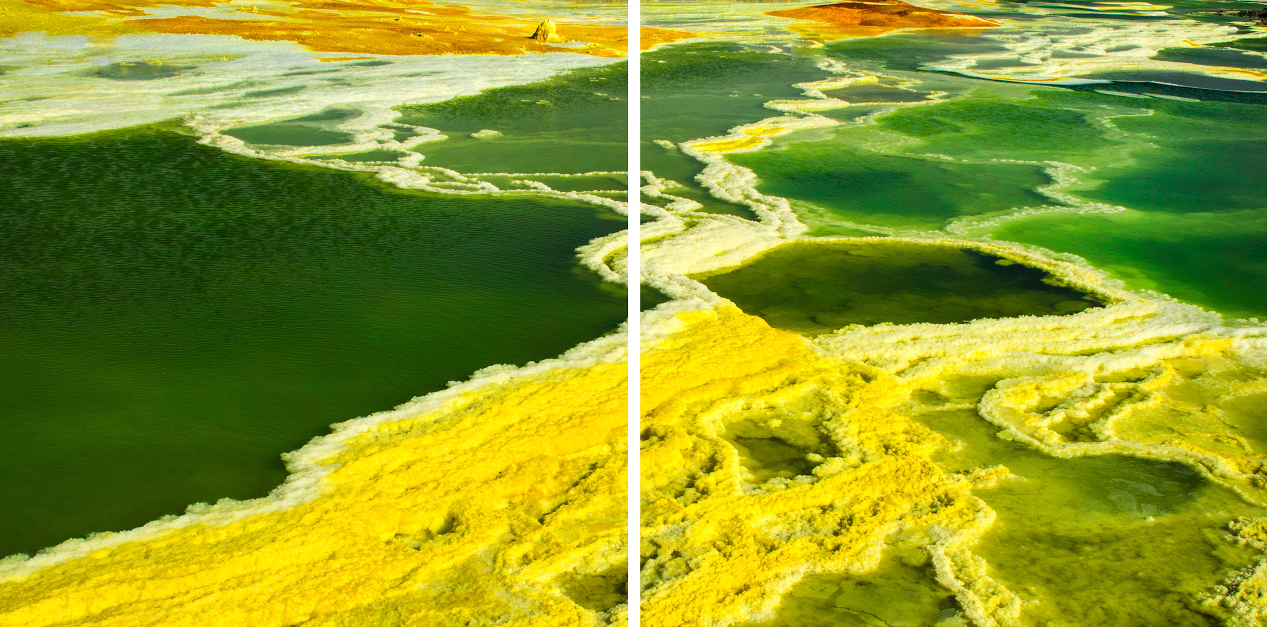 In this extreme environment exist one of the oldest bacteria found on earth: thermophiles, dating back three billion years. Thermophiles continue to fascinate scientists, some believing they are a contributing factor to the most complex forms of life on earth. In the images, there is no familiar point of reference or clear scale the thermophiles are in relation to, abstracting the viewers perspective. The saturated colors, creating an otherworldly environment, deeply fascinated the artist.