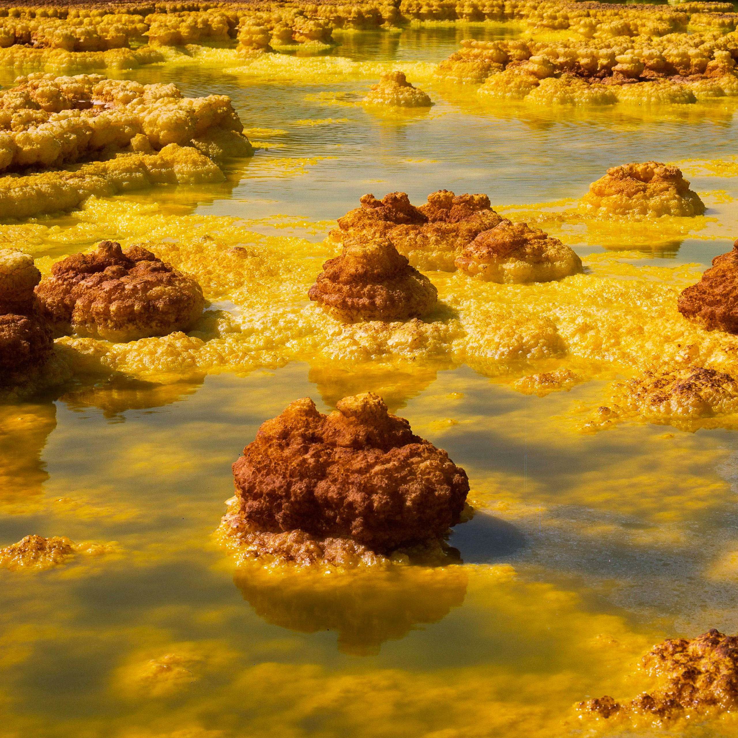 In this extreme environment exist one of the oldest bacteria found on earth: thermophiles, dating back three billion years. Thermophiles continue to fascinate scientists, some believing they are a contributing factor to the most complex forms of life on earth. In the images, there is no familiar point of reference or clear scale the thermophiles are in relation to, abstracting the viewers perspective. The saturated colors, creating an otherworldly environment, deeply fascinated the artist.