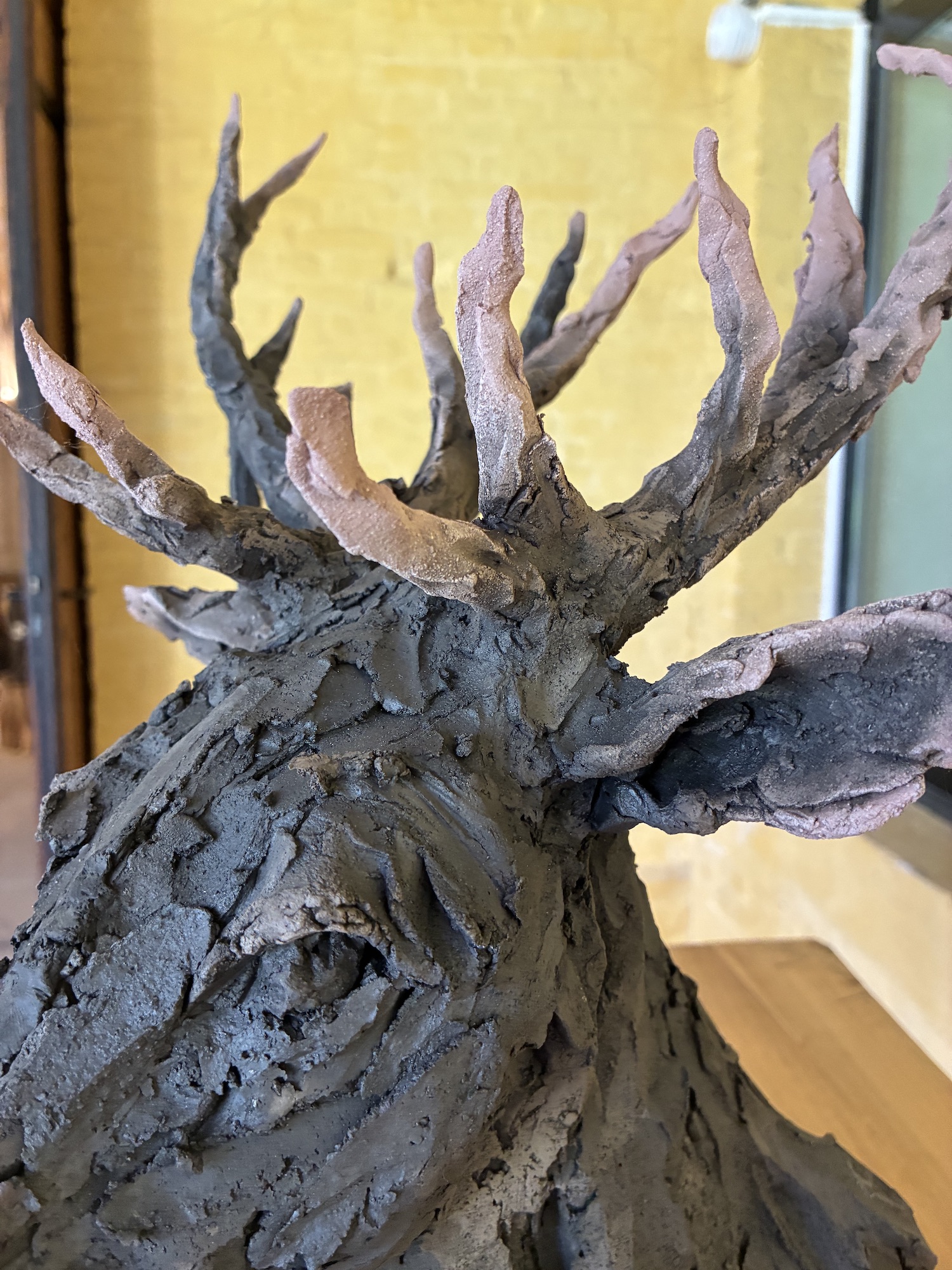 After Velázquez is a smoke-fired stoneware sculpture by the contemporary French artist Cécile Raynal. This sculpture depicts the head of a deer with large antlers, placed on a base. At the back of the head, there is a small ladder resting on its antlers.