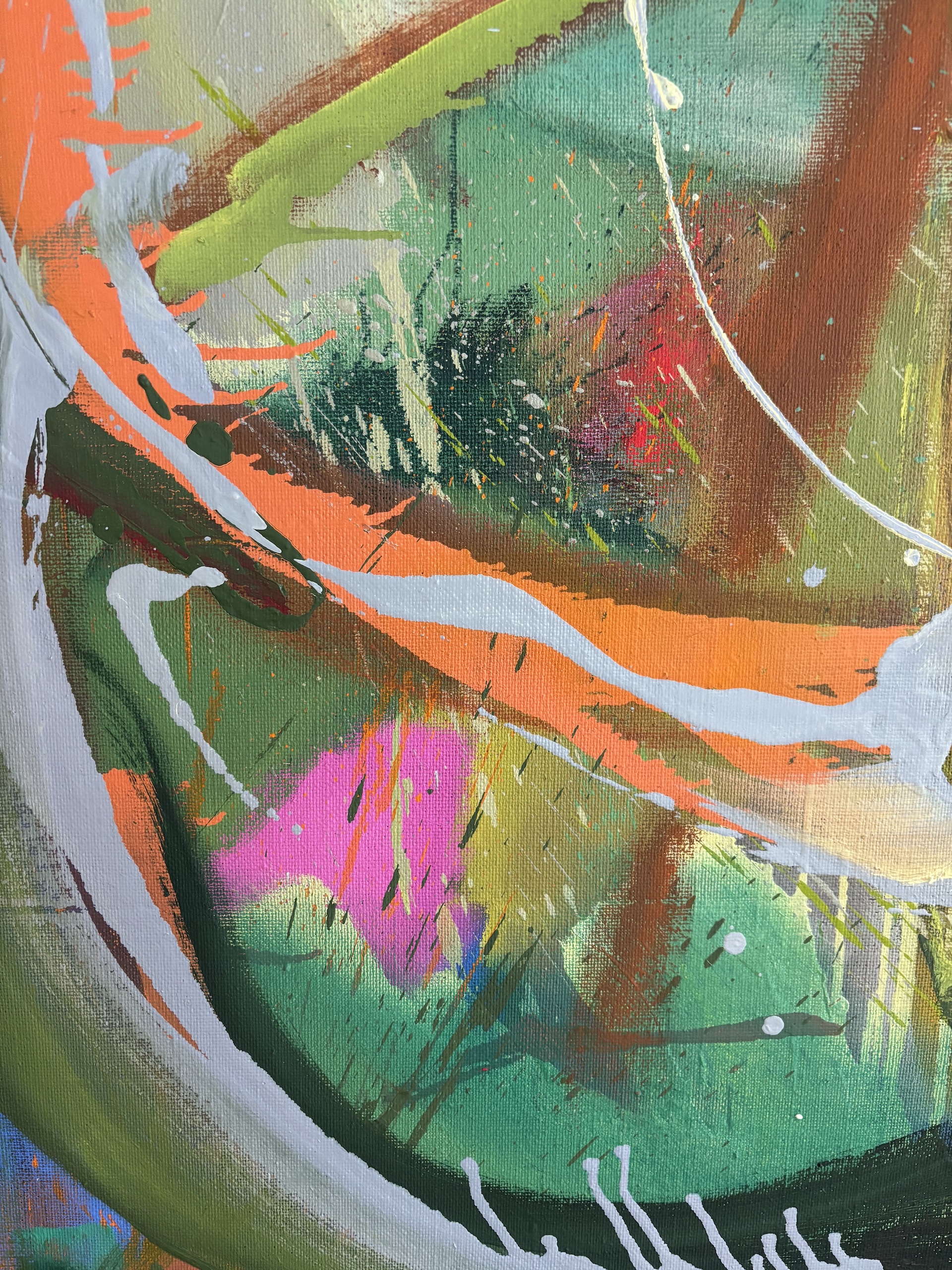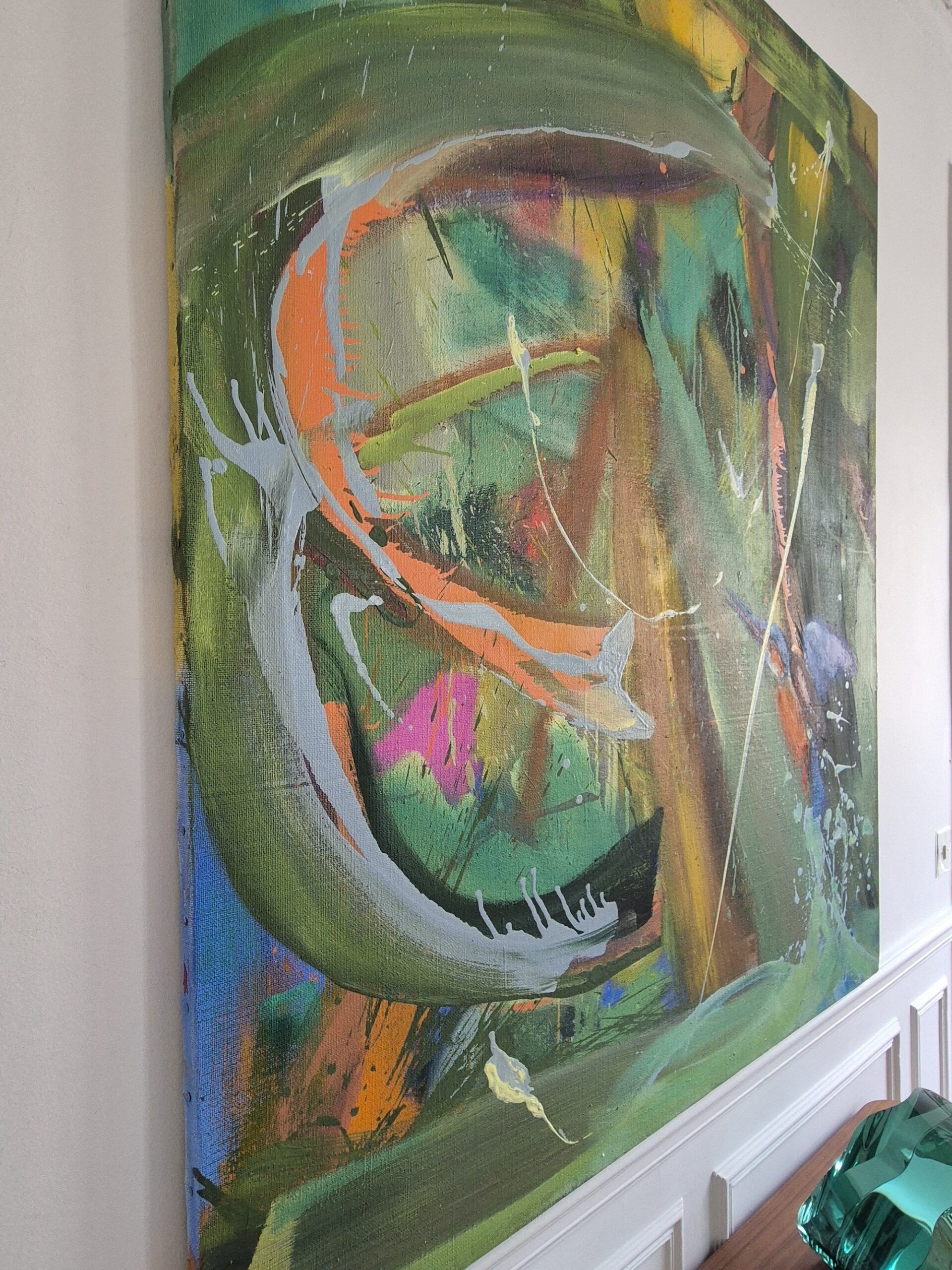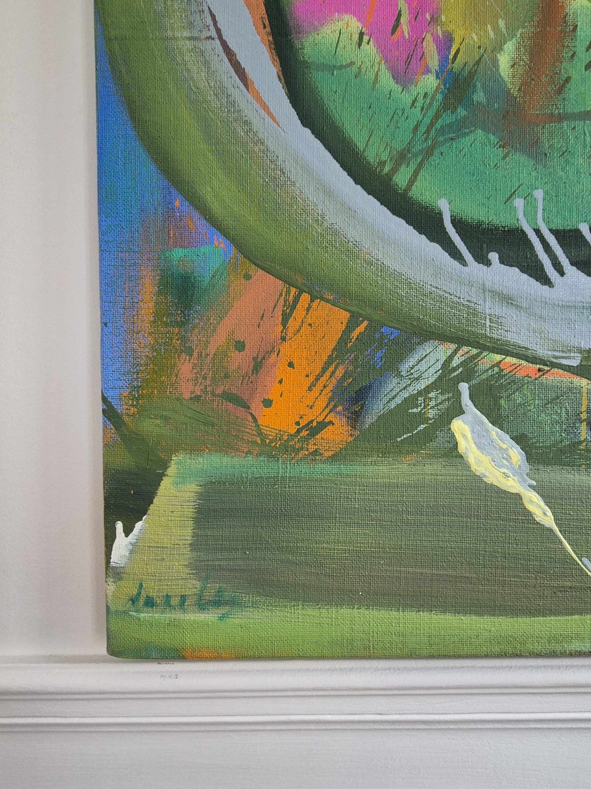 The painting displays the artist’s approach perfectly whose endeavor it is, according to his own words, “to bring out the joy of painting in his work, i.e. color, fluidity, spontaneity…” The artist’s gesture, sharp and vigorous, is often visible on the canvas. He also leaves room for “accidents” (drops and dripping) which “can occasionally give something to a work, an energy, some joy, something unexpected.”