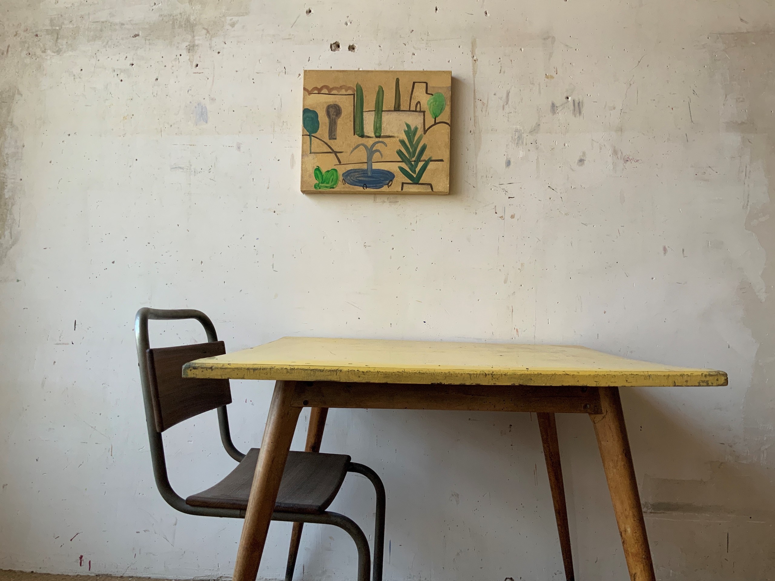 Alh is a painting by Spanish contemporary artist Ramon Enrich. The painting shows a minimalist beige landscape with stylized green trees, a blue fountain, and abstract architectural elements outlined in black.