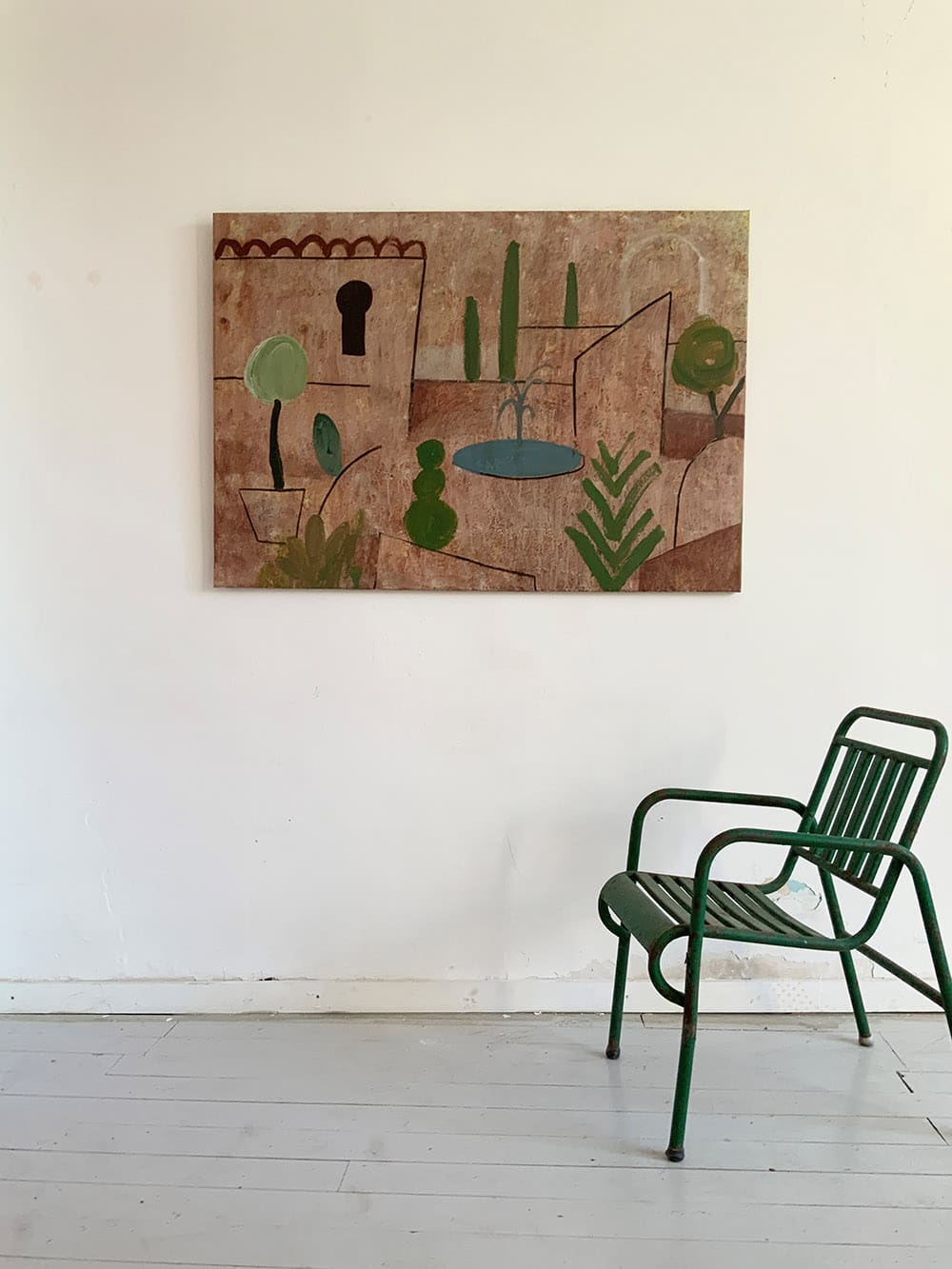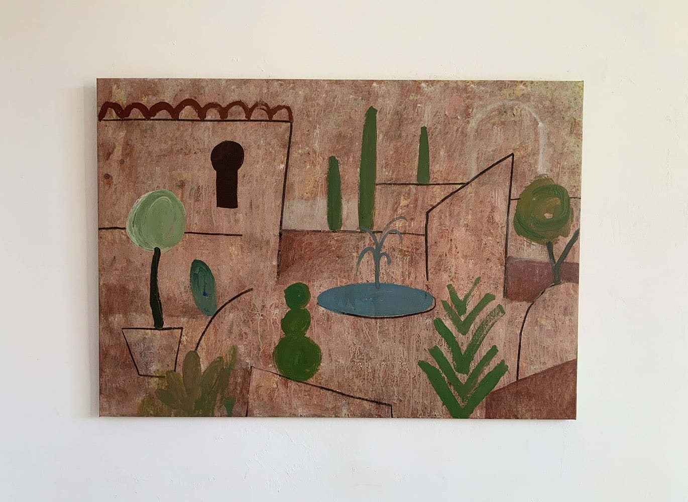 In these paintings, the artist establishes a conversation between architecture and landscape in a figurative work boasting geometric shapes and an enigmatic atmosphere. The landscapes and the simplicity of the forms (near abstract) make for a very theatrical view of architecture.